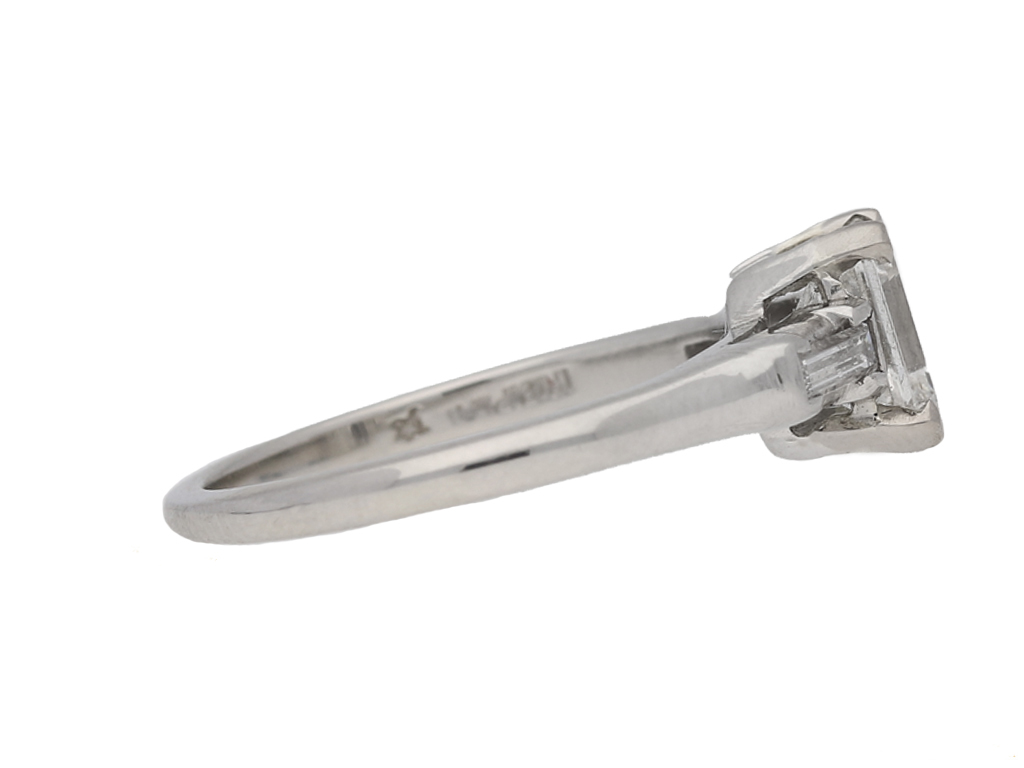 Emerald-cut diamond flanked solitaire ring, American, circa 1950.