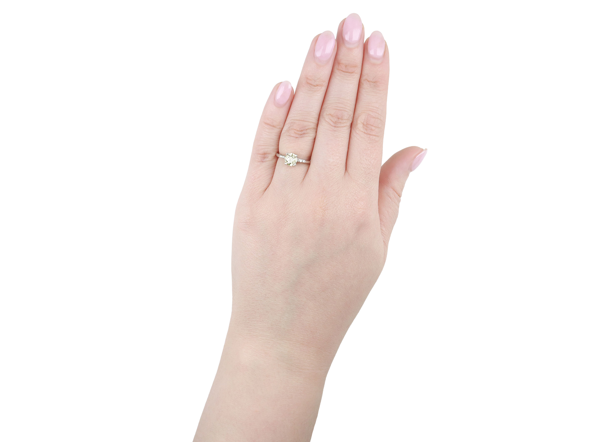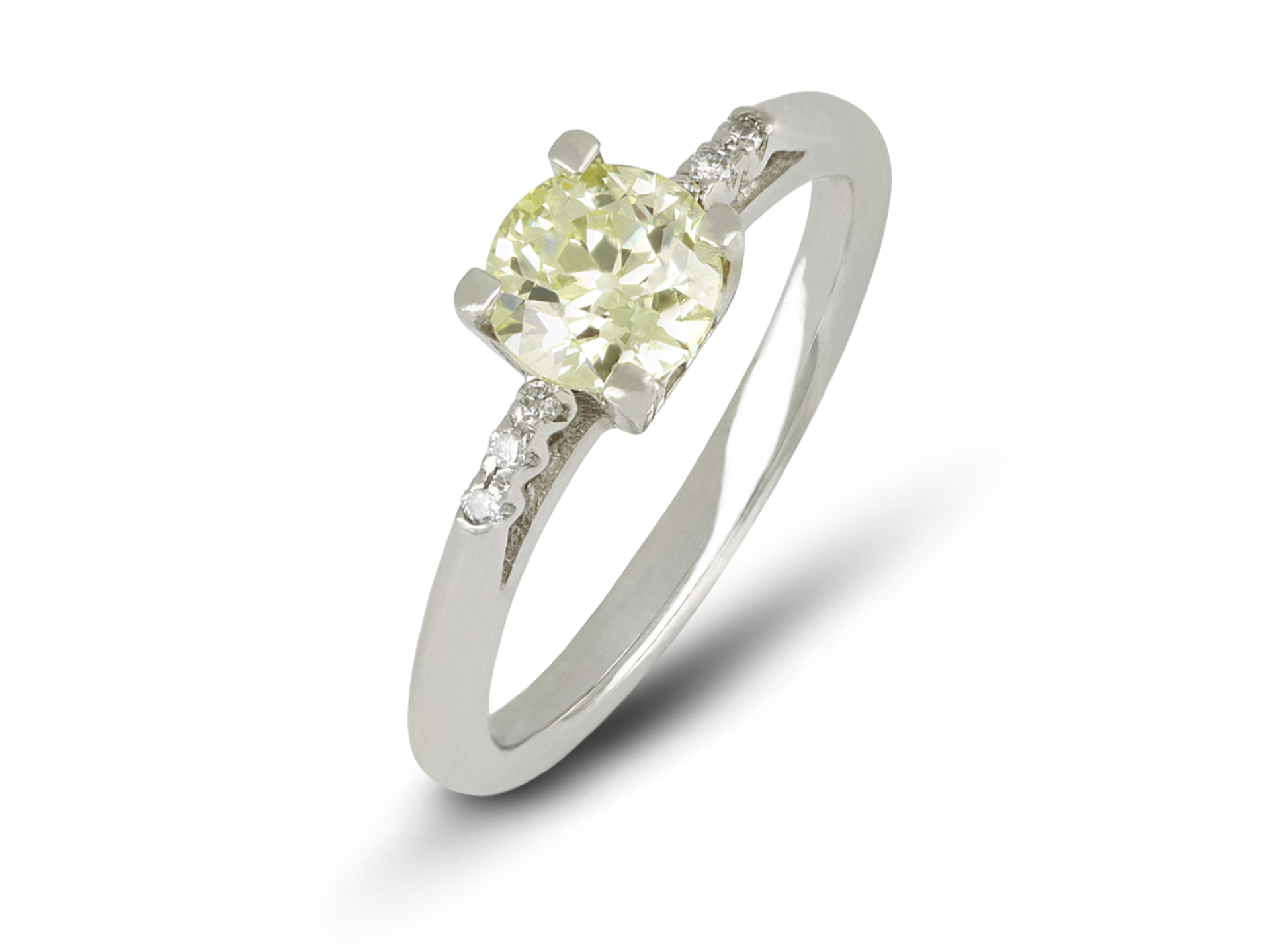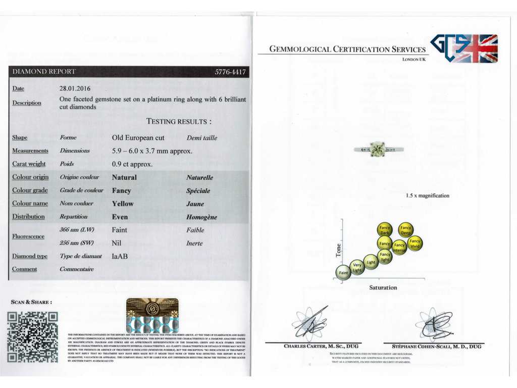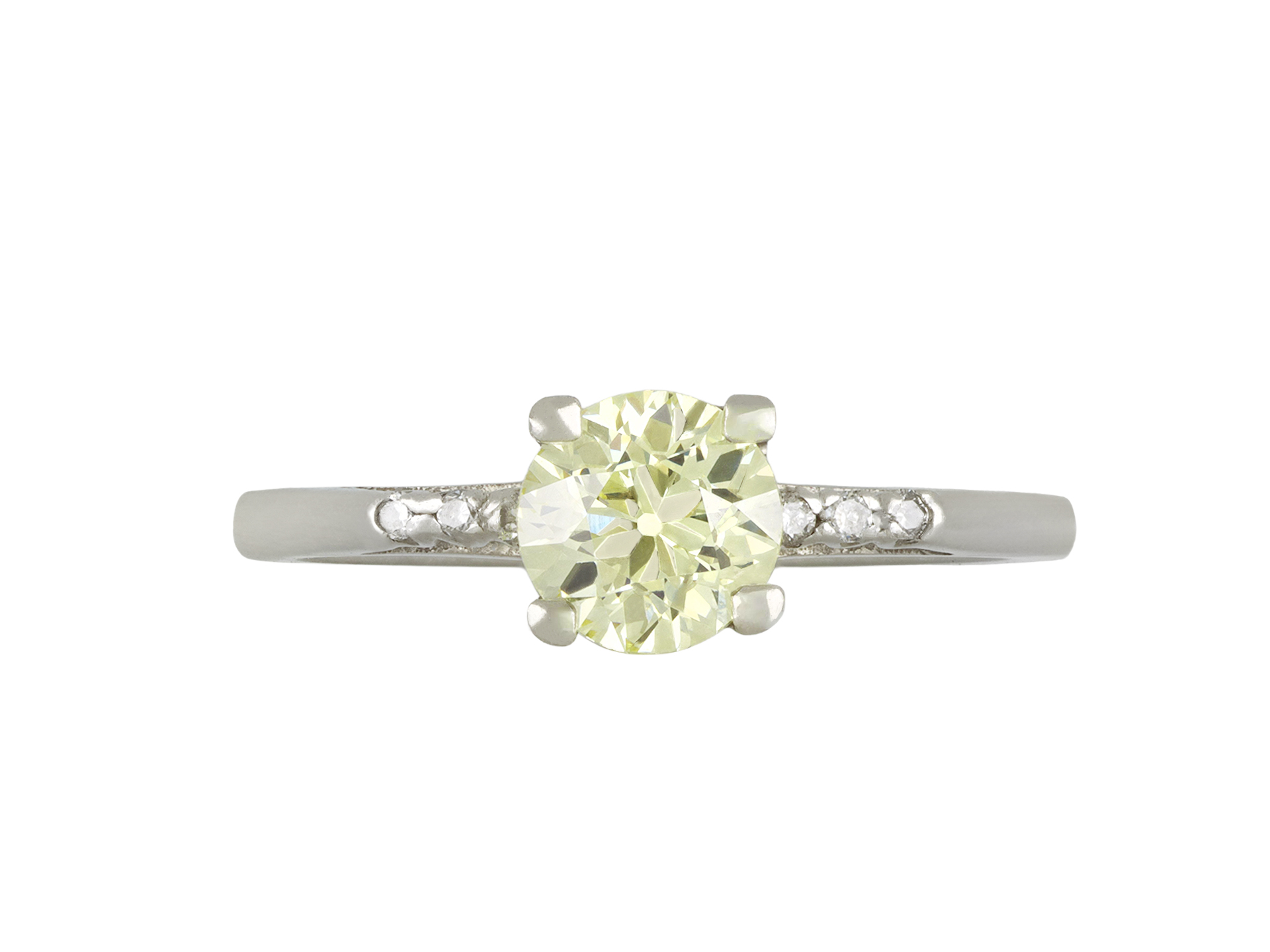 Fancy yellow diamond solitaire ring. Centrally set with a round old cut natural fancy faint yellow diamond in an open back claw setting with an approximate weight of 0.90 carats, flanked by six round brilliant cut diamonds in closed back claw settings with a combined weight of 0.06 carats. The total approximate diamond weight is 0.96 carats, to an elegant flanked solitaire featuring corner claws, a finely pierced gallery and fancy backholing, the slightly raised shoulders leading through to a solid D-shape shank. Tested platinum, circa 1950, accompanied by Gemmological Certification Services report #5776-4417.