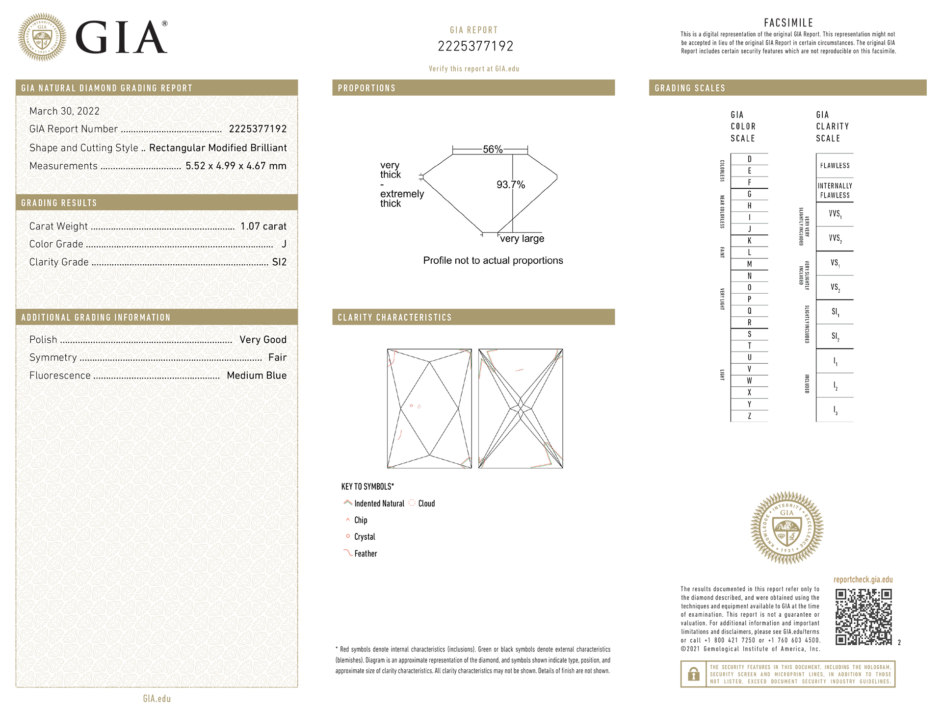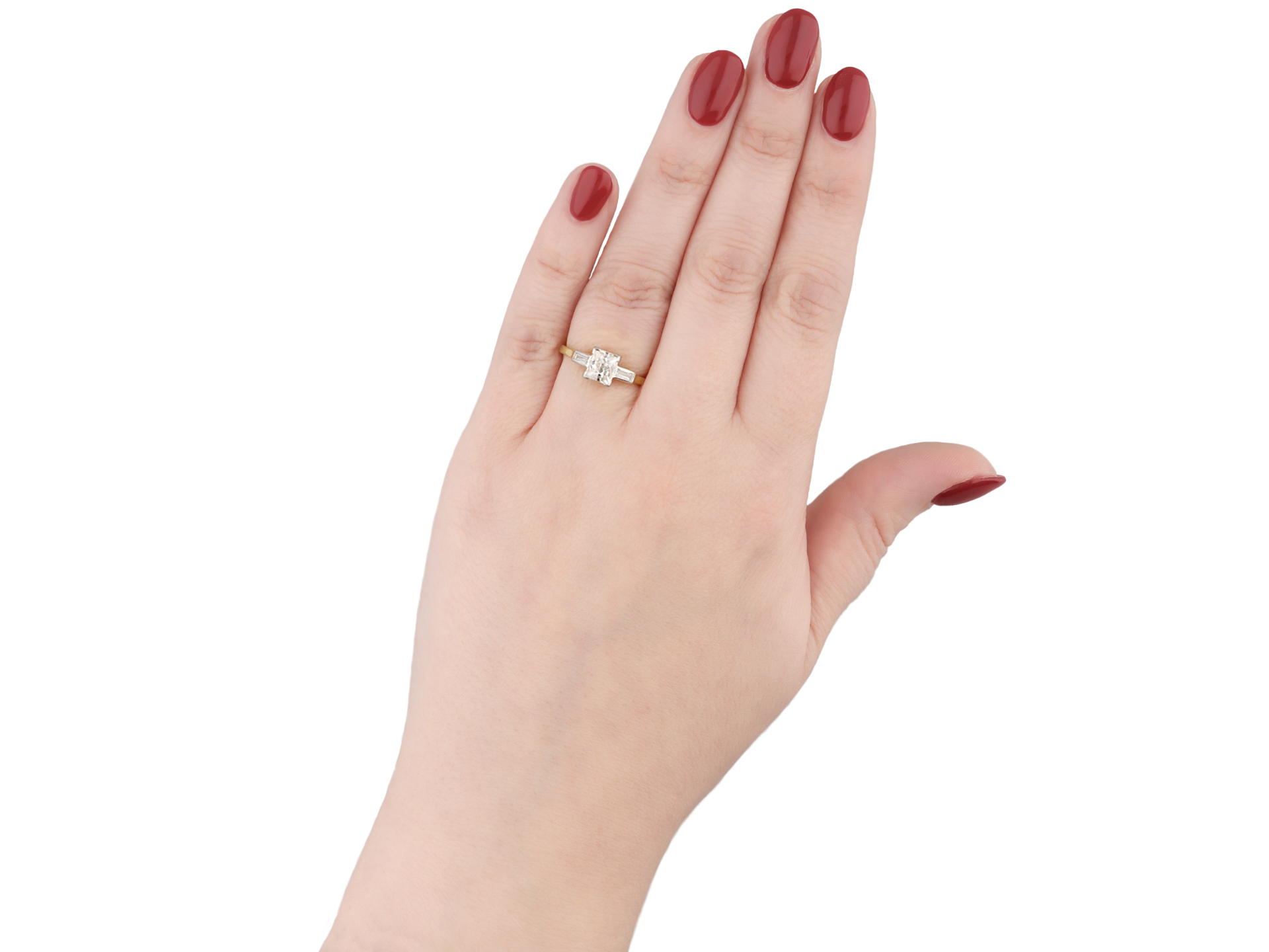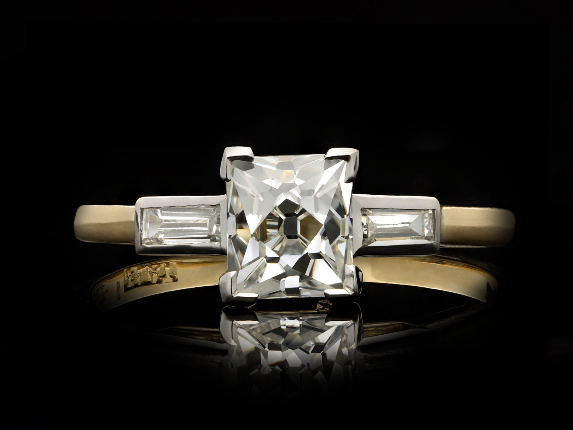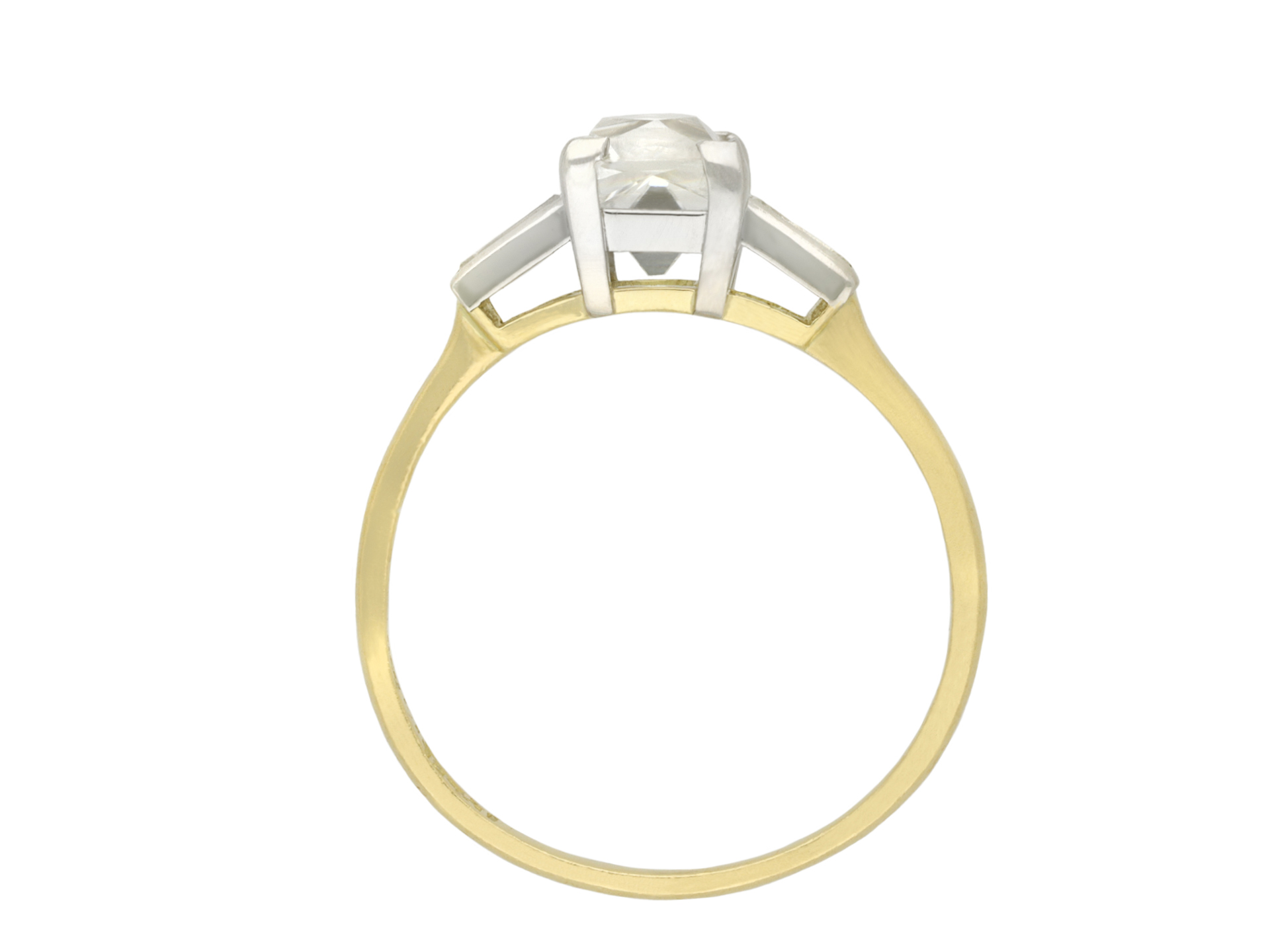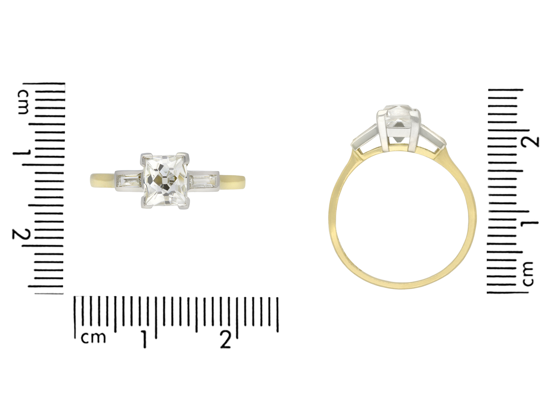 French cut diamond flanked solitaire ring. Set with one square, french cut diamond, J colour, SI2 clarity, with a weight of 1.07 carats, in an open back claw setting, flanked by two rectangular baguette cut diamonds in open back rubover settings with a combined weight of 0.18 carats. The total approximate diamond weight is 1.25 carats, to a geometric flanked solitaire design featuring angular corner claws, a geometric pierced gallery and open square backholding, leading to slightly raised shoulders and flowing through to a solid D-shaped shank. Marked 18 carat yellow gold and platinum, circa 1940, accompanied by Gemological Institute of America (GIA) report #2225377192.
