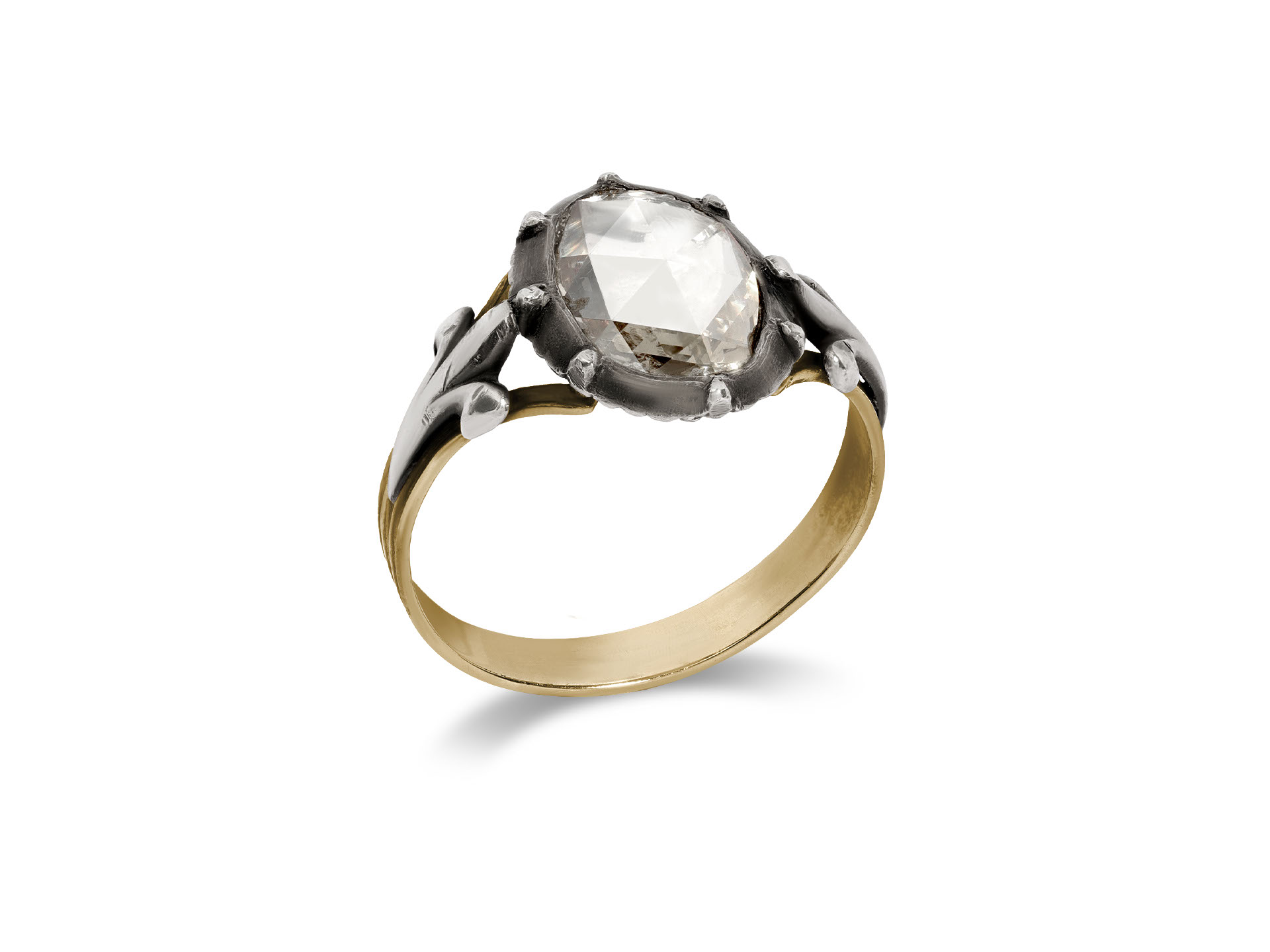 Georgian rose cut diamond ring. Set centrally with an oval rose cut diamond in a closed back cut-down setting with an approximate weight of 1.60 carats, to an elegant solitaire design with polished borders, a solid collet and a gadrooned closed back, the split shoulders set with silver fleur-de-lis detail flow through to solid ridged D-shape shank. Tested yellow gold and silver, French control marks, circa 18th century.