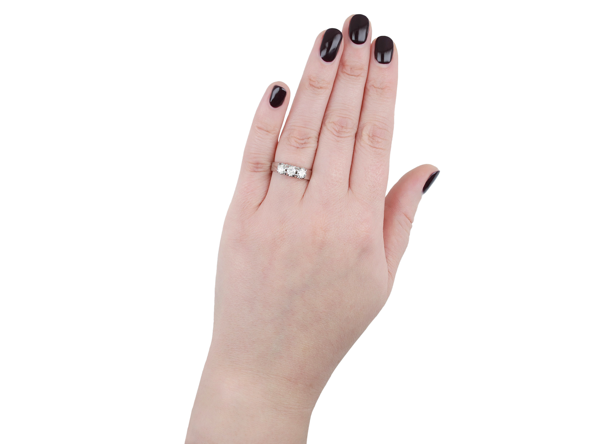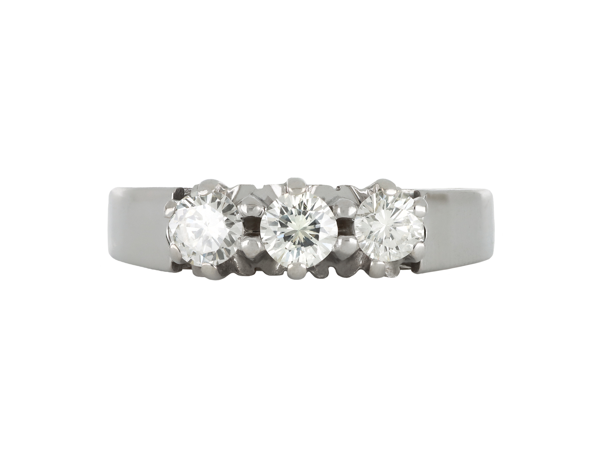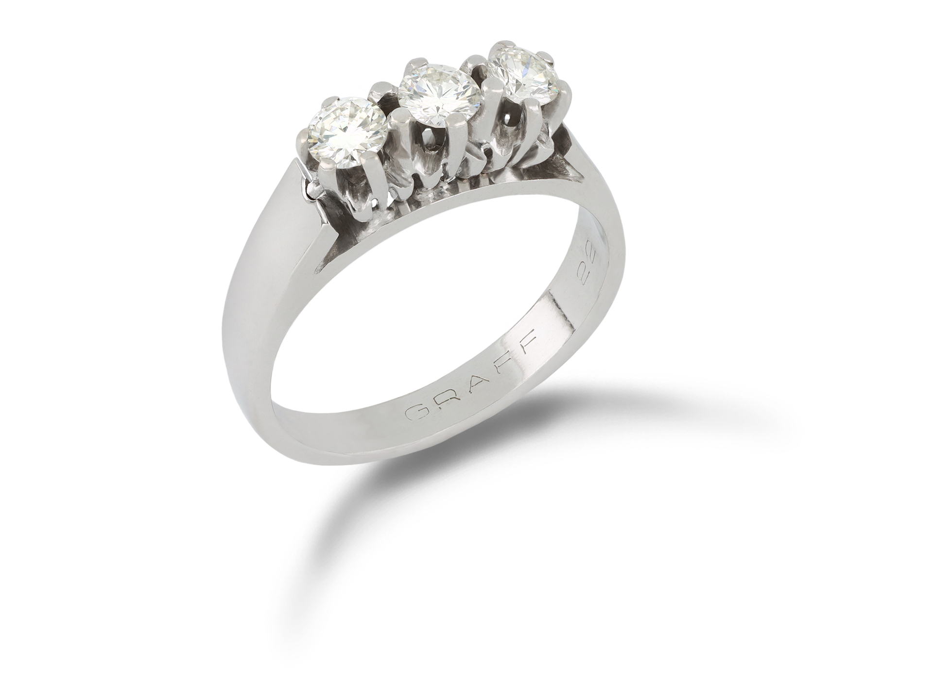 Graff three stone diamond ring. Set with three round brilliant cut diamonds in open back claw settings with an approximate combined weight of 0.54 carats, to a stylish three stone design curving claws, a finely pierced fluted gallery and circular open backholing, flanked by sloping shoulders and leading through to a solid flat shank. Marked 18 carat white gold, signed 'GRAFF', numbered '22', English, circa 1975.