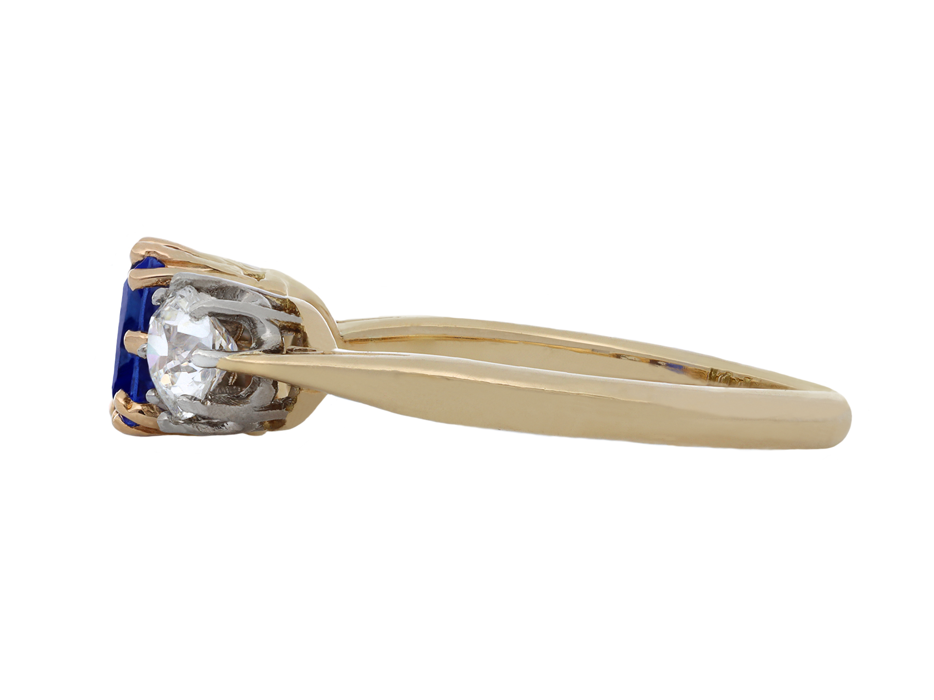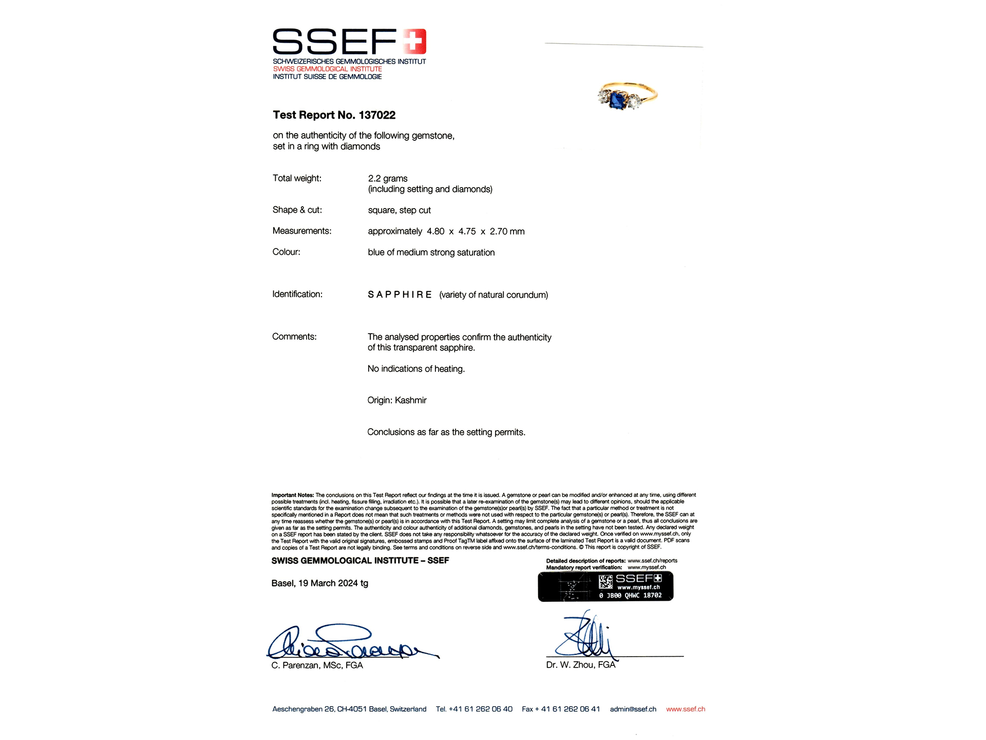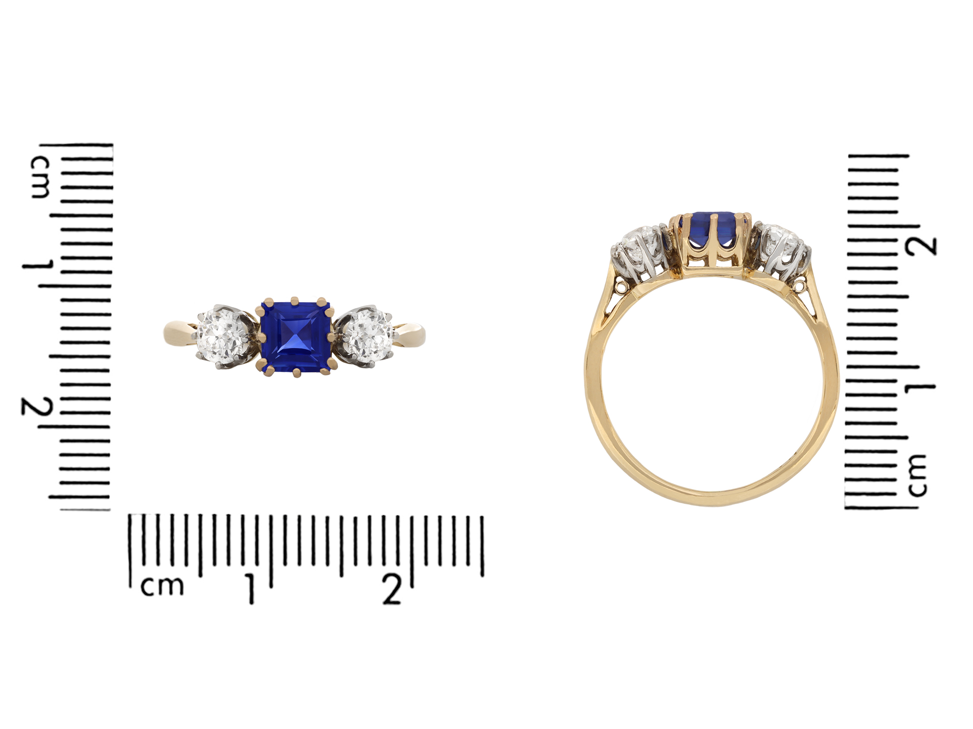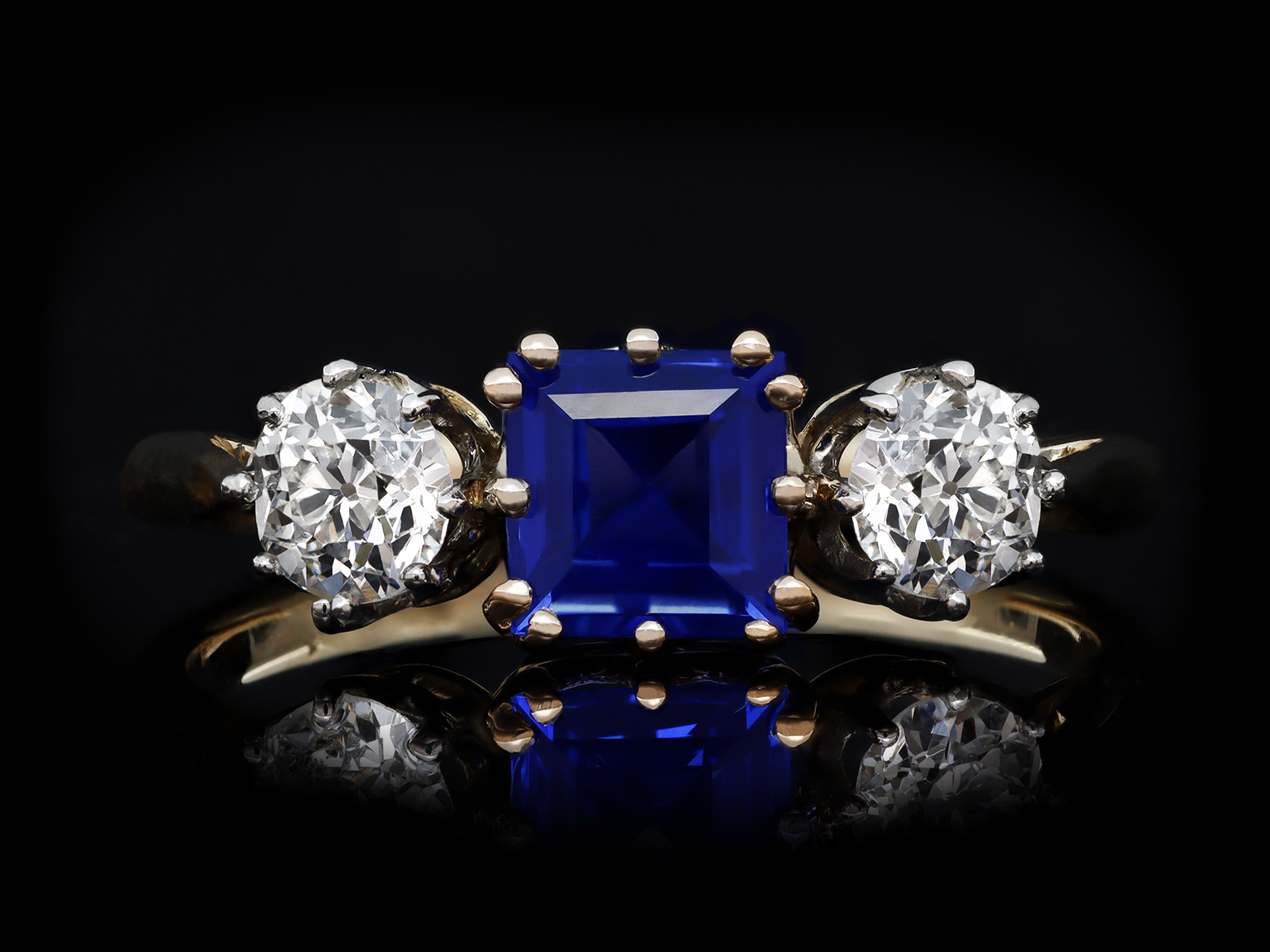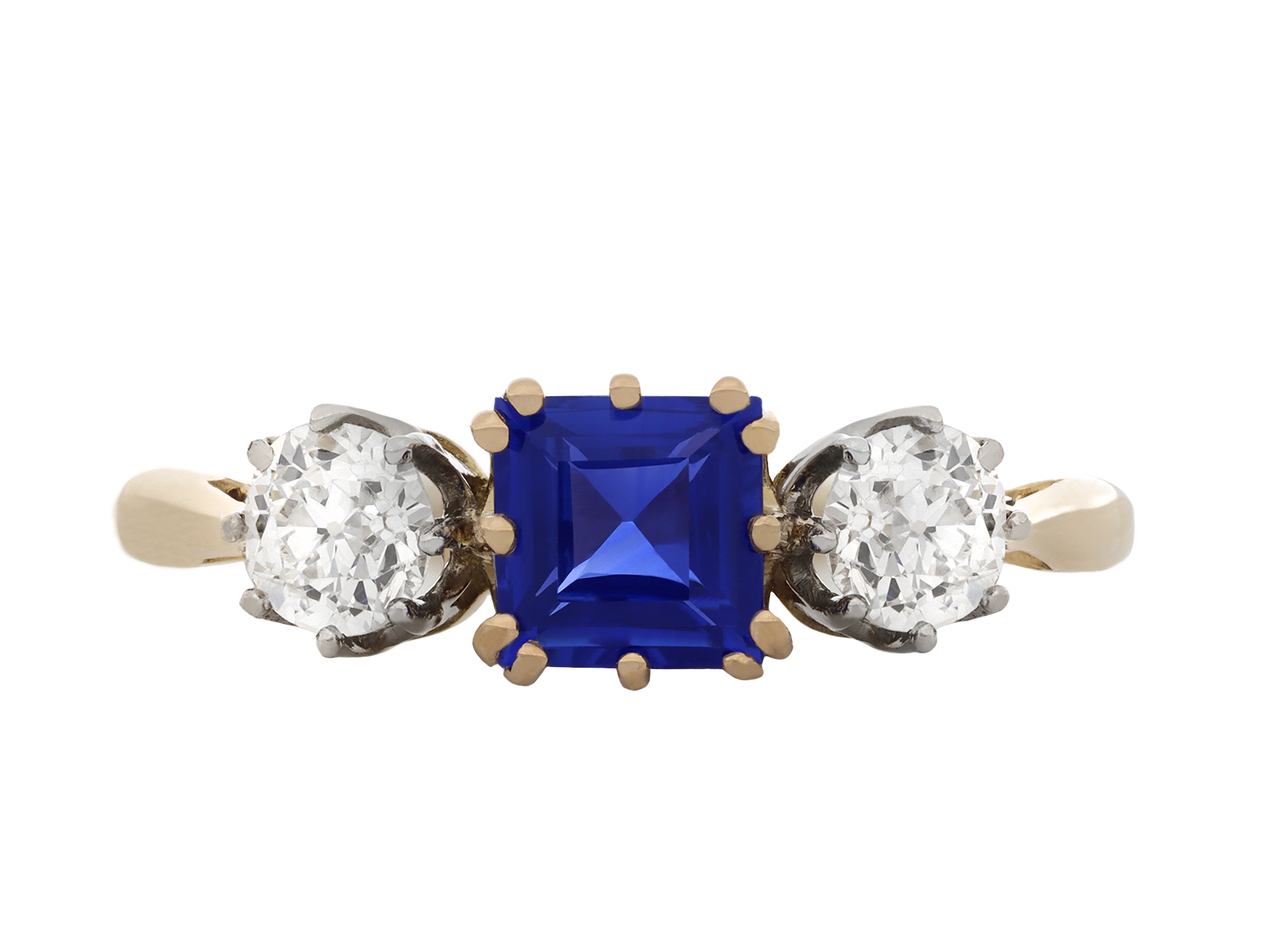 Kashmir sapphire and diamond three stone ring. Set to centre with a square step cut natural unenhanced Kashmir sapphire in an open back claw setting with an approximate weight of 0.66 carats, flanked by two round old cut diamonds in open back claw settings with a combined approximate weight of 0.45 carats, to an elegant three stone ring featuring curving claws, an intricately pierced gallery and open backholing, leading to raised shoulders with chenier details and flowing through to a solid D-shape shank. Marked 18 carat yellow gold and tested platinum, circa 1915, accompanied by Deutsche Stiftung Edelsteinforschung (DSEF) report #031946, SSEF report #137022
