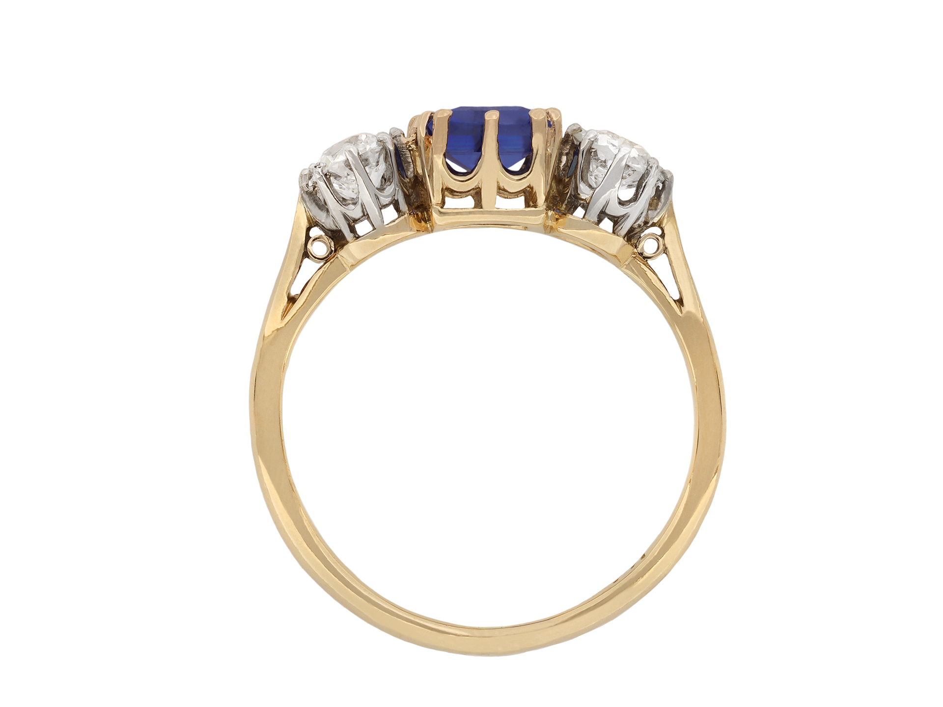 Kashmir sapphire and diamond three stone ring, circa 1915.