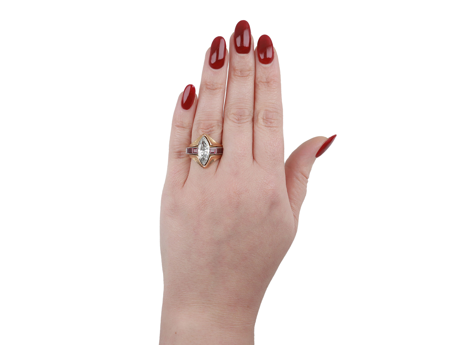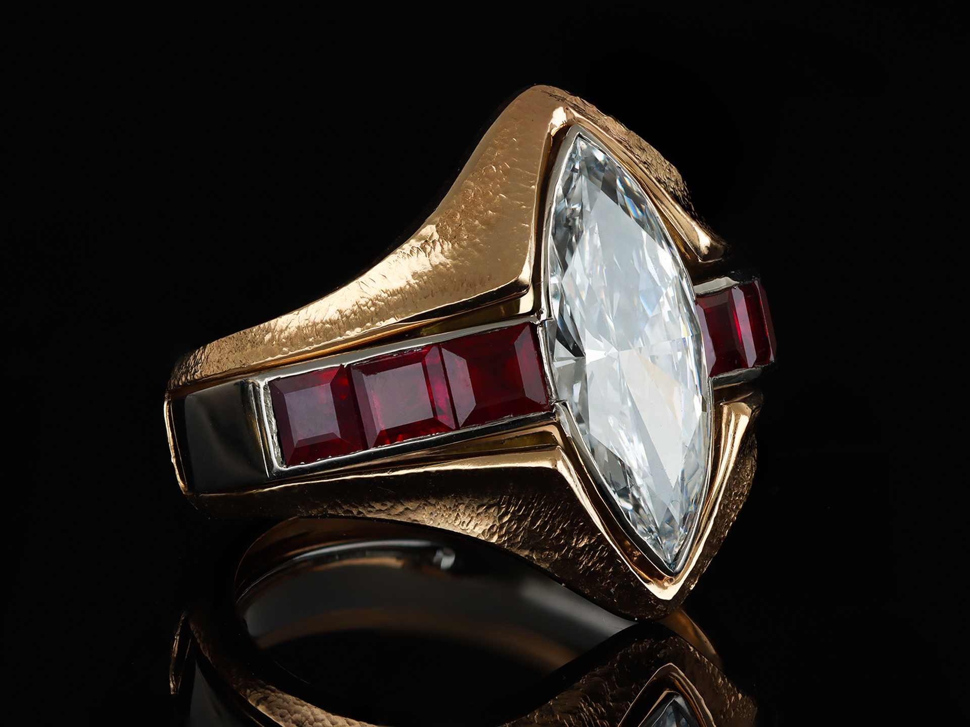 Marquise diamond and ruby convertible ring. Set to centre with a marquise shape brilliant cut diamond, D colour, IF clarity, with a weight of 1.62 carats in an open back rubover setting, flanked by six square step-cut natural Burmese rubies in closed back channel settings with a combined approximate weight of 0.90 carats, to a bold flanked solitaire design with polished edges and open and closed backholing, leading to integrated shoulders which flow through to a solid D-shaped shank, fitted with a removable yellow gold outer ring, with a hammered finish and tapered shoulders. Marked platinum and tested 18ct yellow gold, maker's mark 'CM', circa 1950, accompanied by Gemological Institute of America (GIA) report #5171188136.