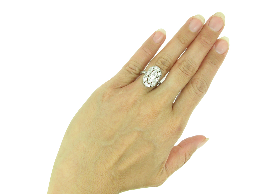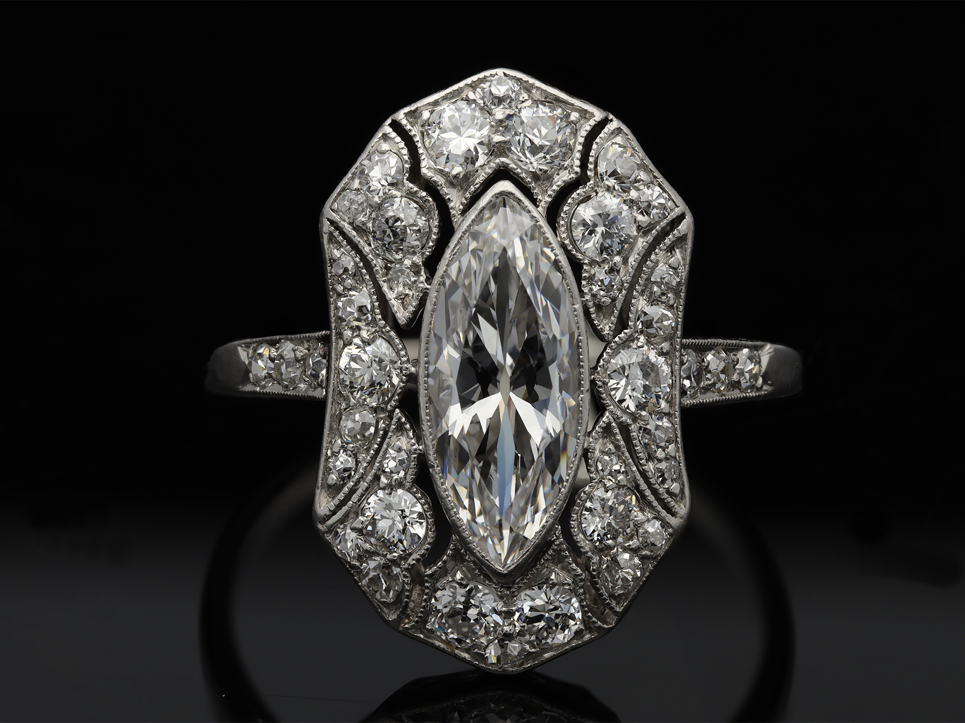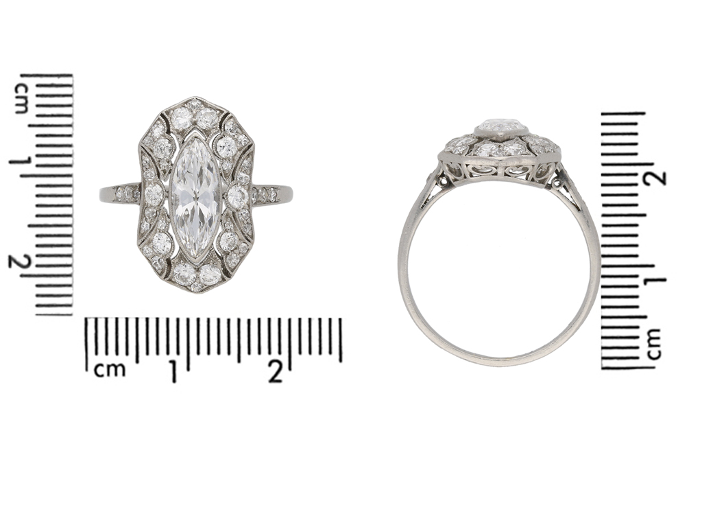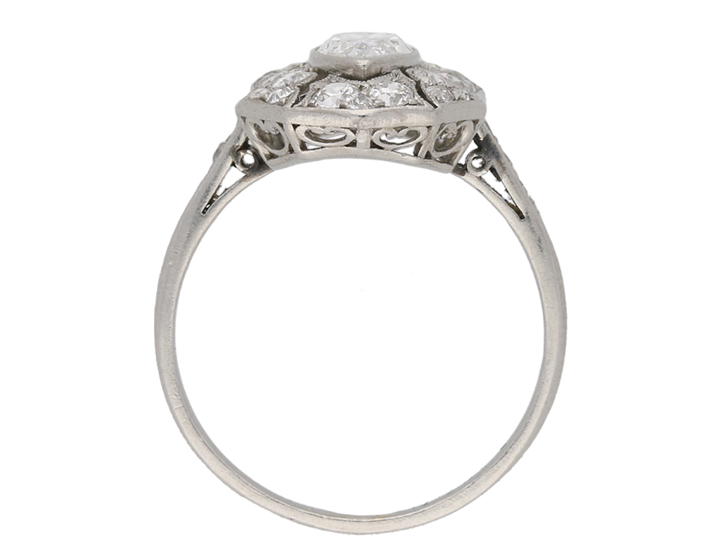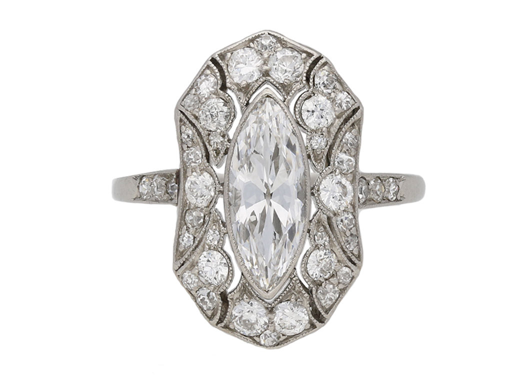 Marquise diamond cluster ring. Set to centre with a marquise shape old cut diamond in an open back rubover setting with an approximate weight of 1.10 carats, encircled by ten round old cut diamonds in open back grain settings with a combined weight of 0.40 carats, further set with twenty eight round eight cut diamonds in open back grain settings with a combined weight of 0.30 carats. The total approximate diamond weight is 1.80 carats, to an elegant vertical openwork cluster design featuring millegrain borders, an intricately pierced gallery with scrolling details and fancy open backholing, flanked by trumpeting split shoulders with cheniers flowing down to a solid tapering D-shape shank. Tested platinum, circa 1925.
