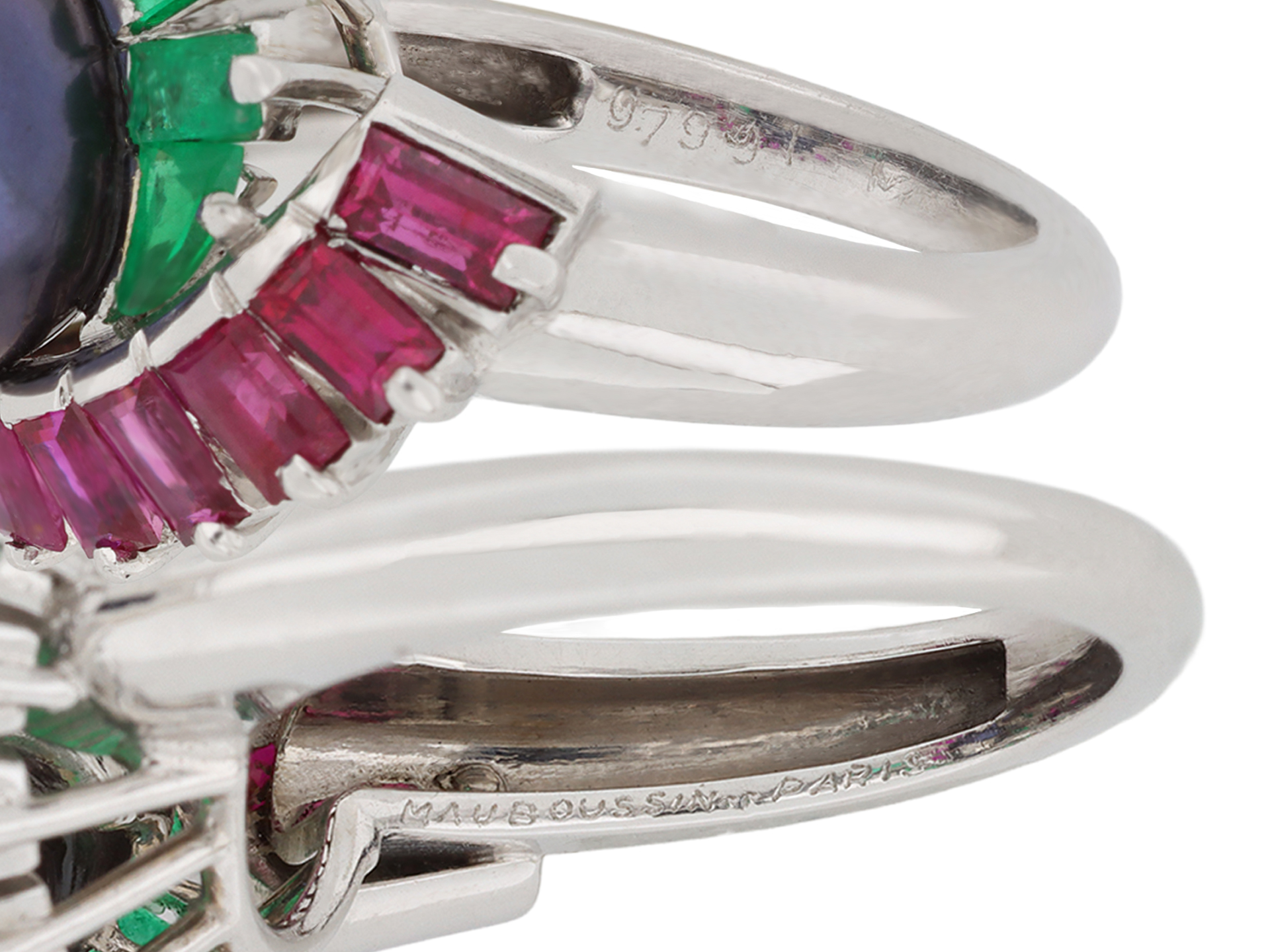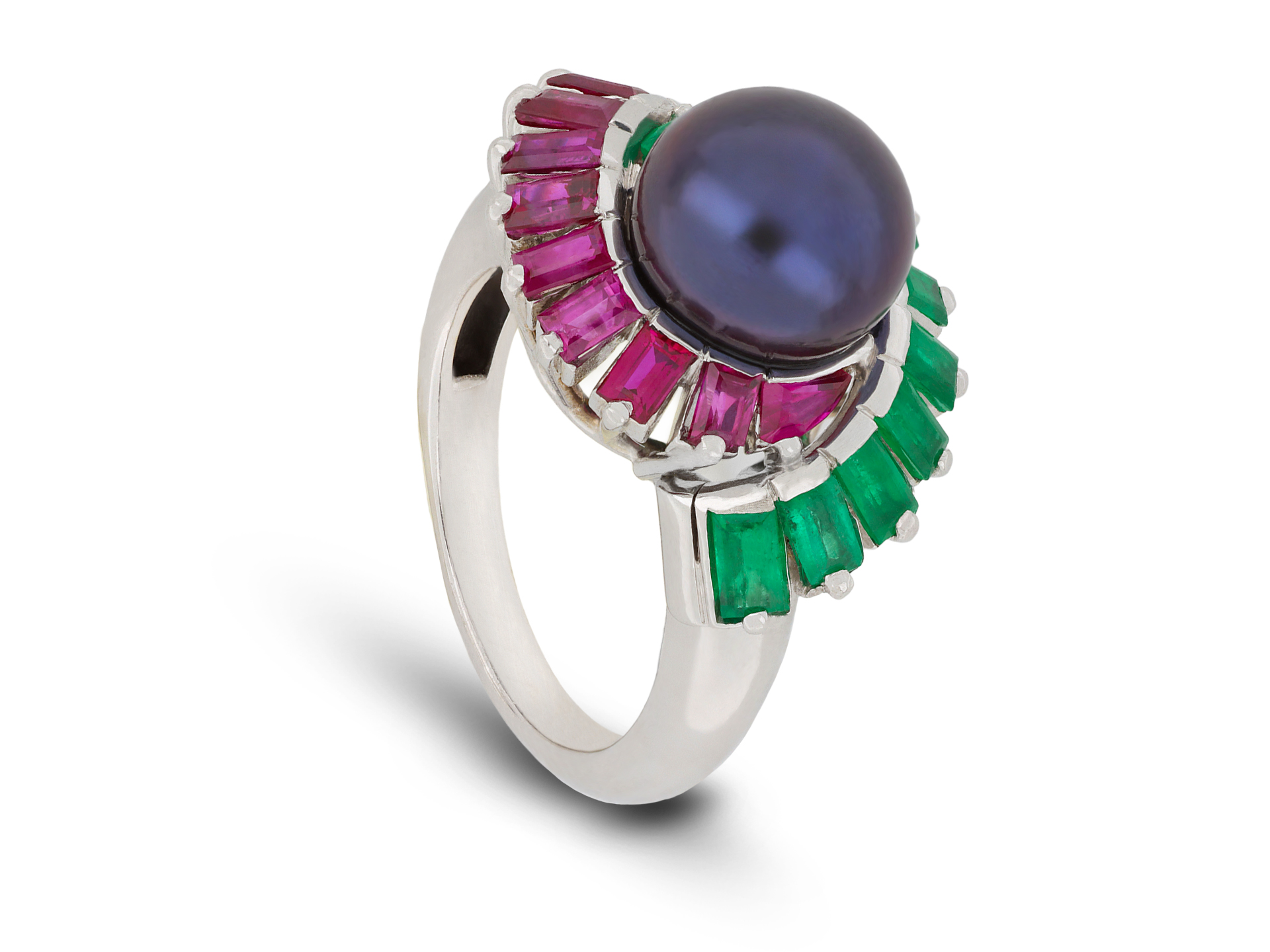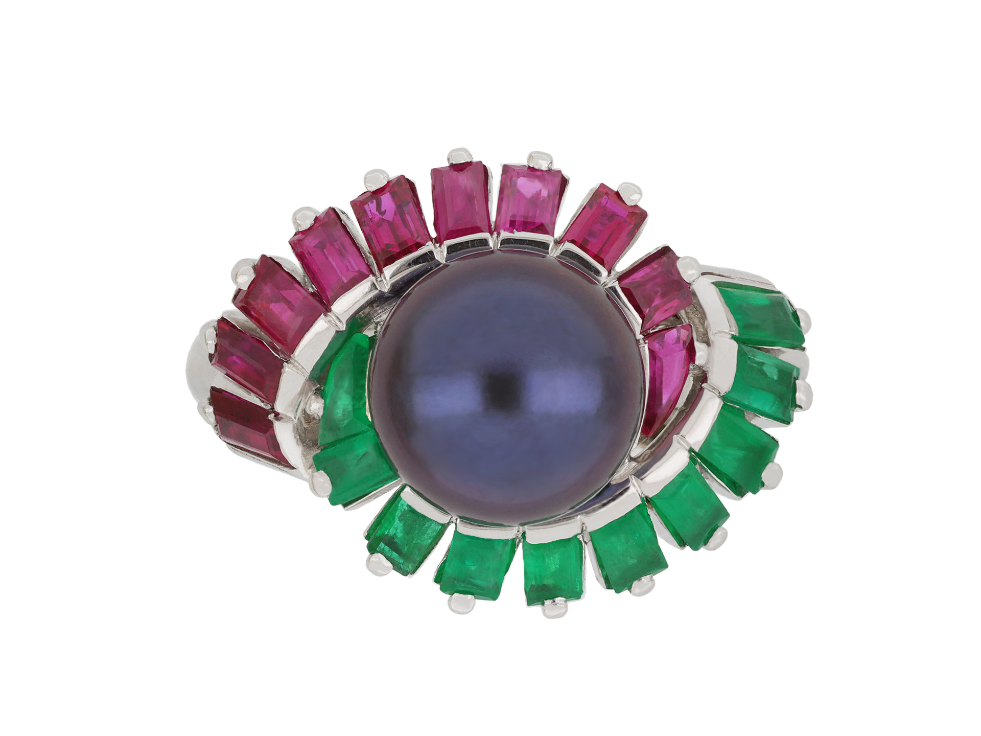 Mauboussin pearl, ruby and emerald cluster ring. Set to centre with a black pearl in a half-drilled open back setting, further adorned with nine rectangular baguette cut natural unenhanced rubies in open back claw and rubover settings with a combined approximate weight of 0.90 carats, further set with one tapered calibre cut natural unenhanced ruby in an open back claw and rubover setting with a weight of 0.06 carats, decorated further with nine rectangular baguette cut natural emeralds in open back claw and grain settings with a combined approximate weight of 0.65 carats, further set with one tapered calibre cut natural emerald in an open back claw and rubover setting with a weight of 0.05. The total approximate ruby weight is 0.96 carats, and the total approximate emerald weight is 0.70 carats, to an impressive cluster design featuring polished edges and curving claws, a structural gallery, and fancy shape open backholing, leading to trumpeting shoulders and flowing through to a solid D-shape shank. Marked platinum, numbered '07991', indistinct maker's mark, signed 'Mauboussin Paris', French, 1957, accompanied by Certificate of Authenticity.