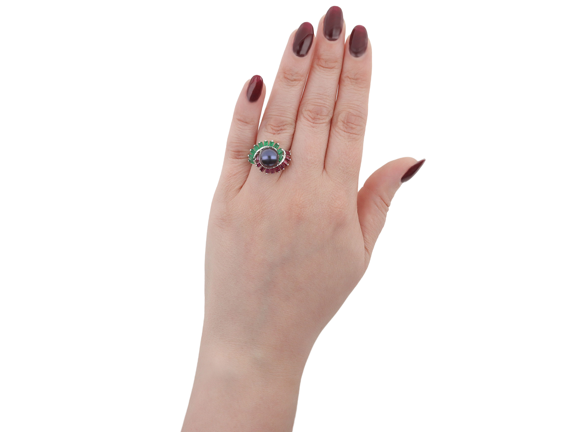 Mauboussin black pearl, ruby and emerald cluster ring, French, 1957.