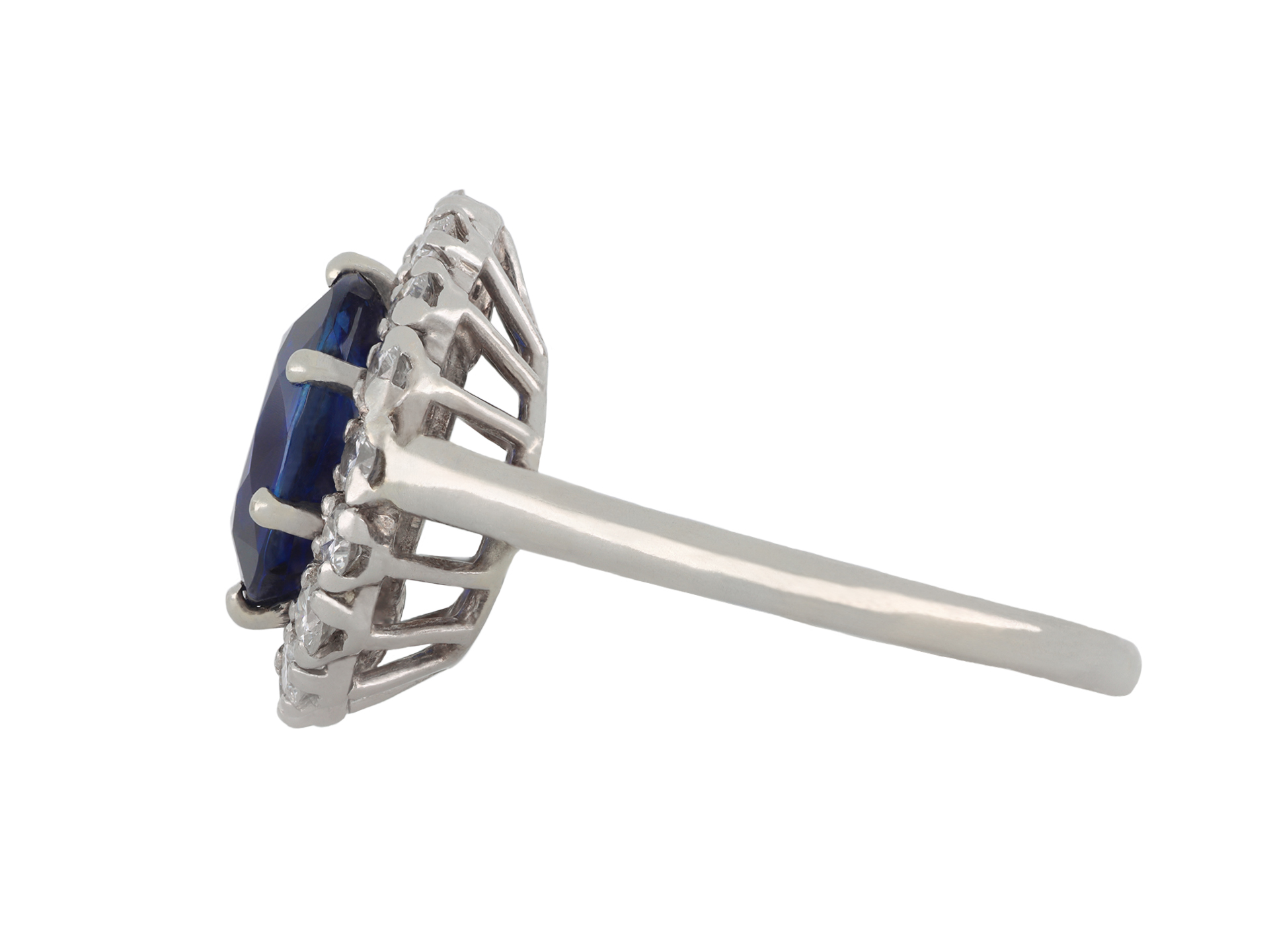 Mellerio Burmese sapphire and diamond coronet cluster. Set to centre with a single cushion shape natural and unenhanced Burmese sapphire in an open back claw setting, with an approximate weight of 2.80 carats, encircled by sixteen round brilliant cut diamonds in open back claws settings, with an approximate combined weight of 0.80 carats, to an impressive coronet cluster design featuring curved claws, a linear pierced gallery and circular open backholing, flanked by raised shoulders that flow through to a solid D-shape shank. Marked platinum, signed 'MONTE PAR MELLER' for Mellerio, French, circa 1950, accompanied by certification from Gemmological Certification Services (GCS) #5783-3640.