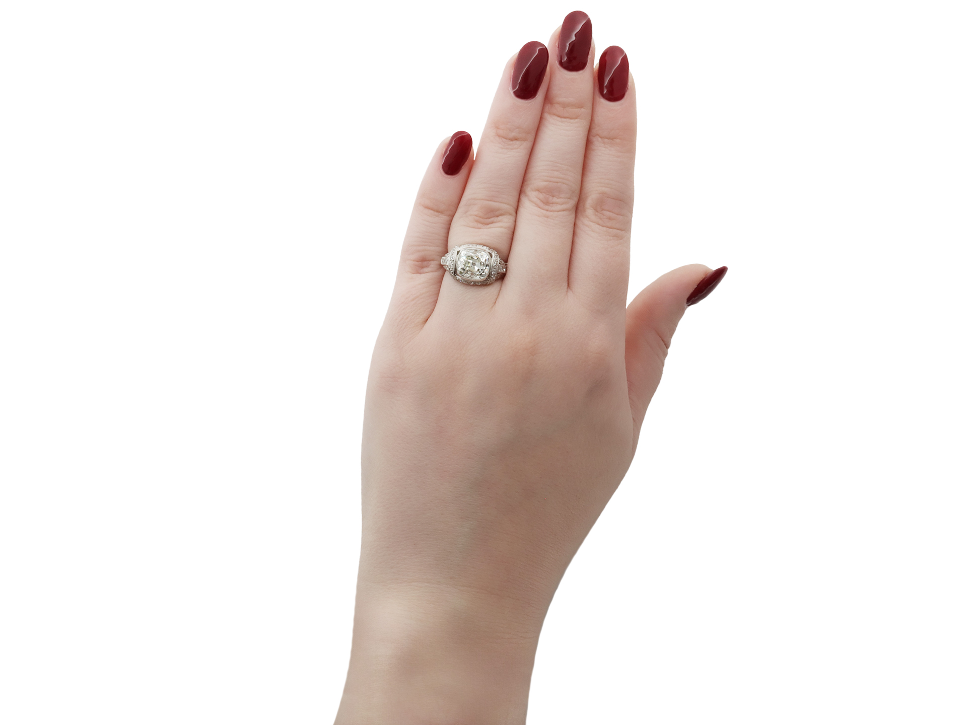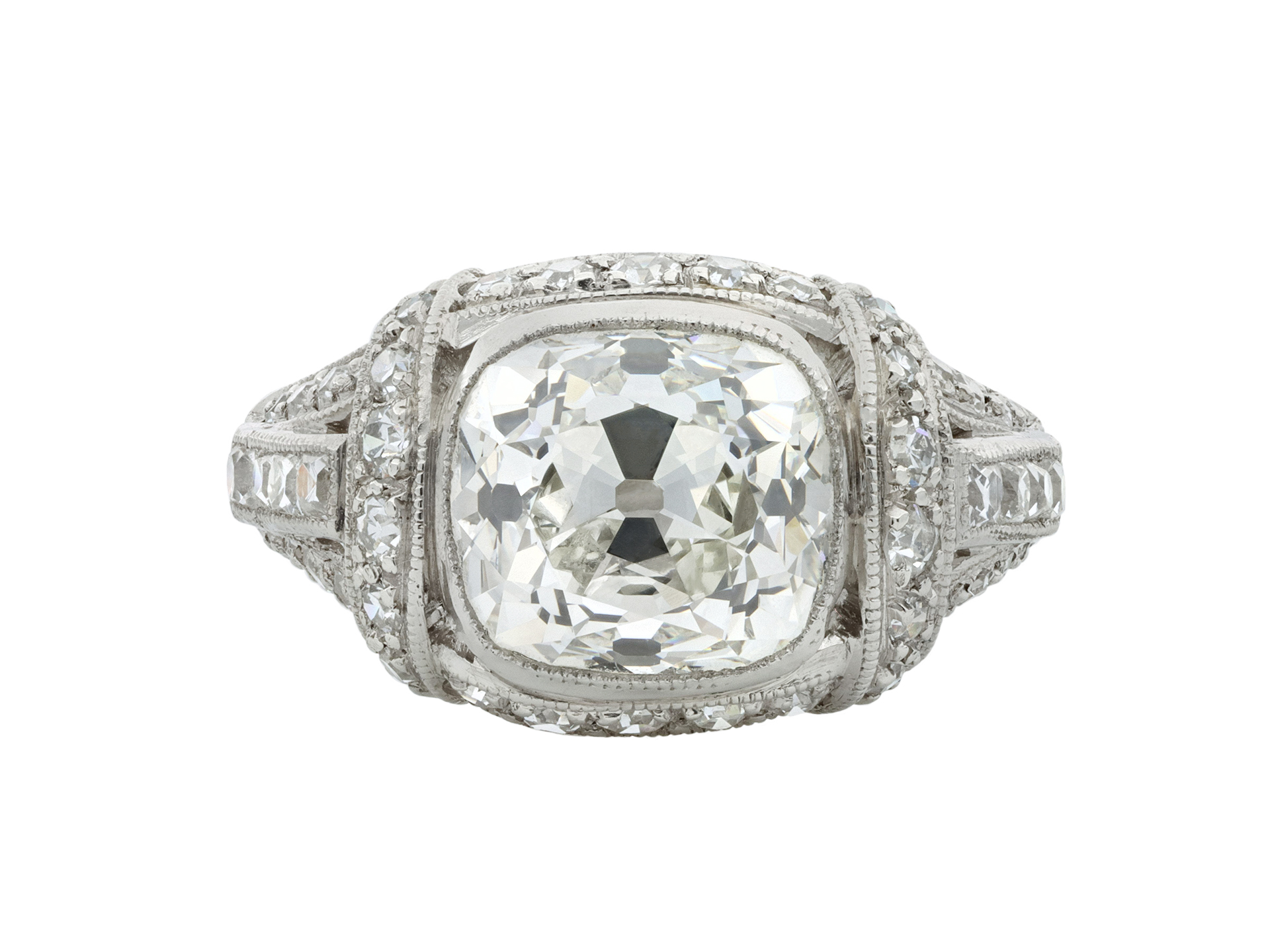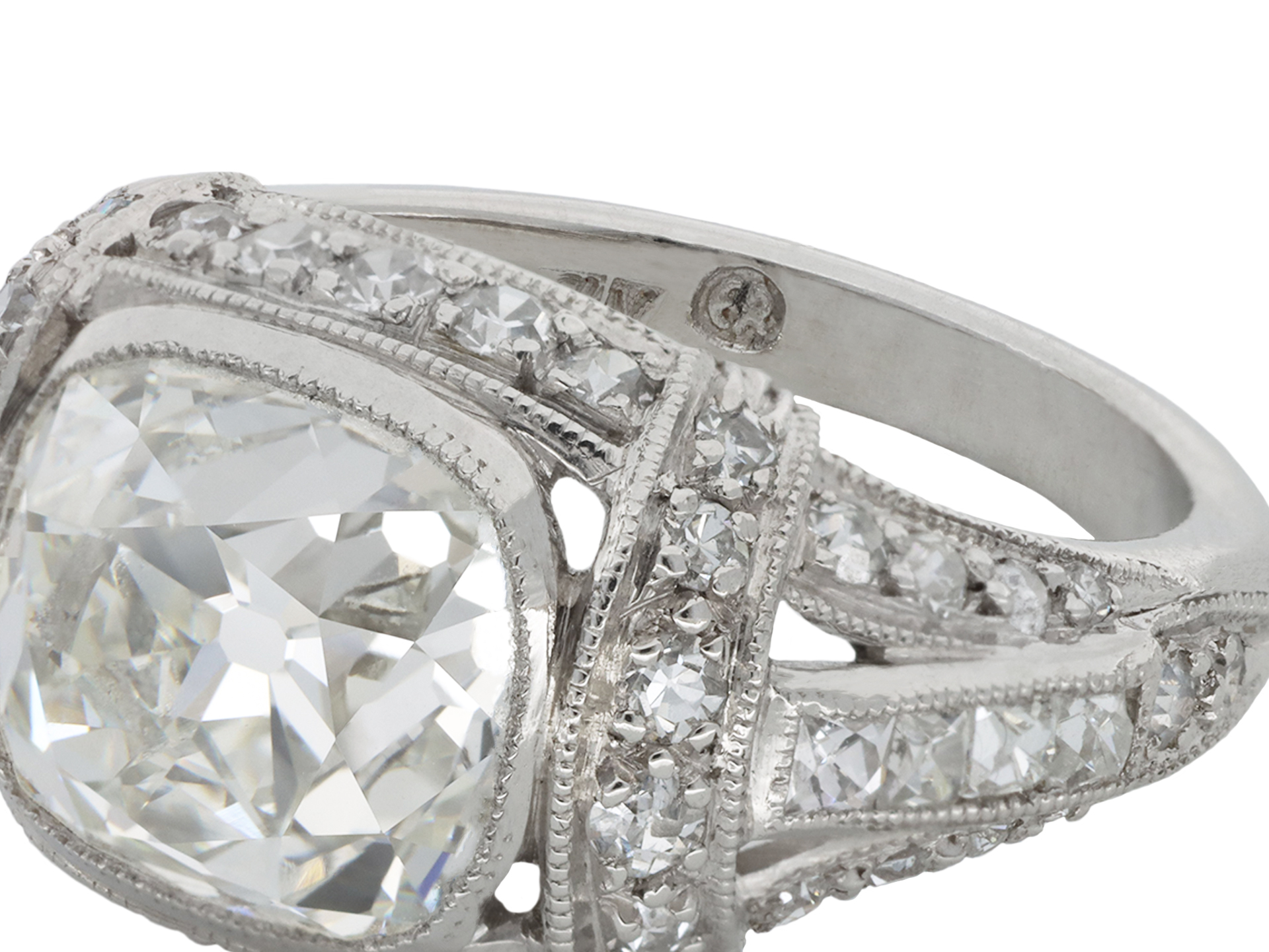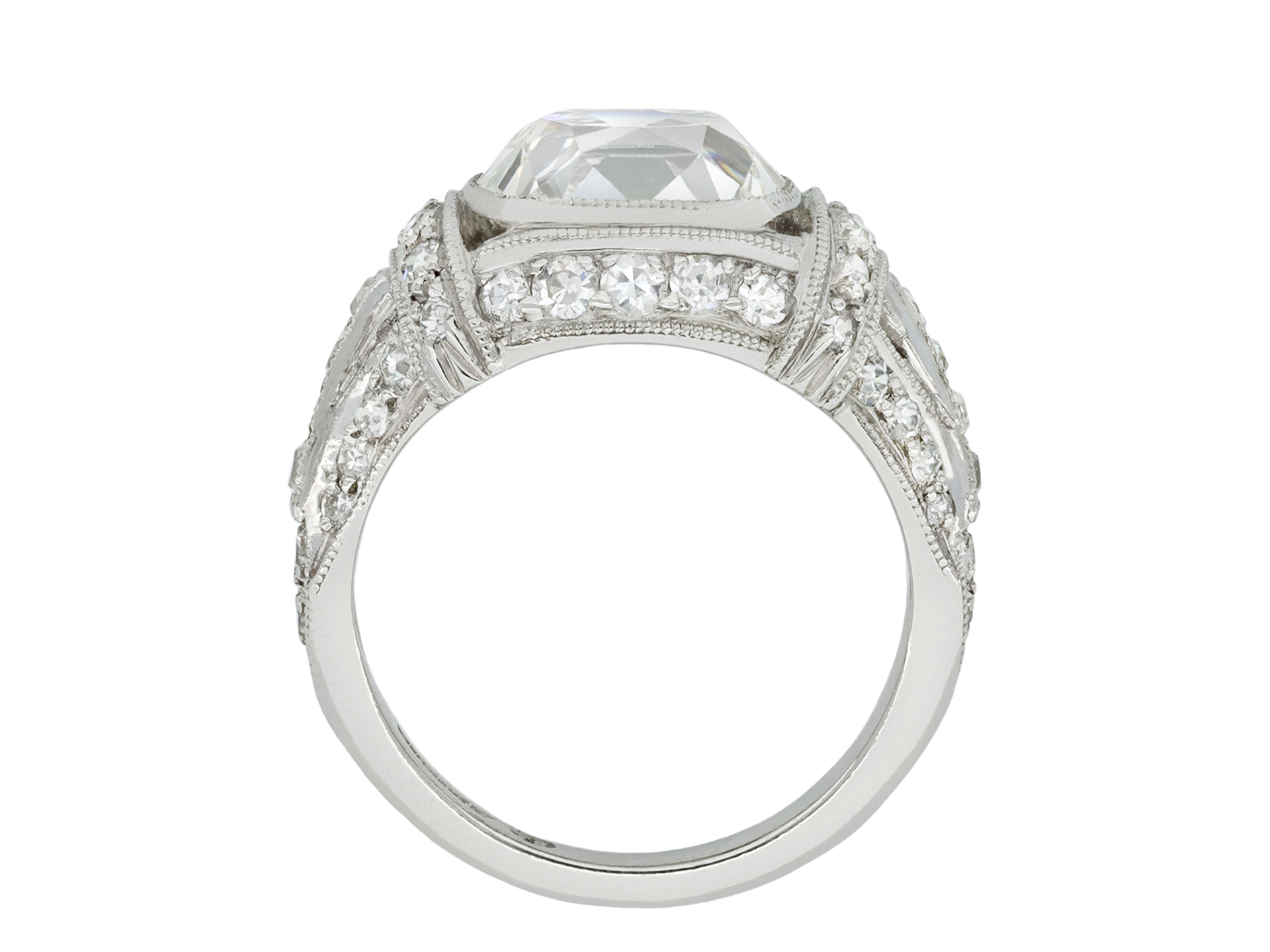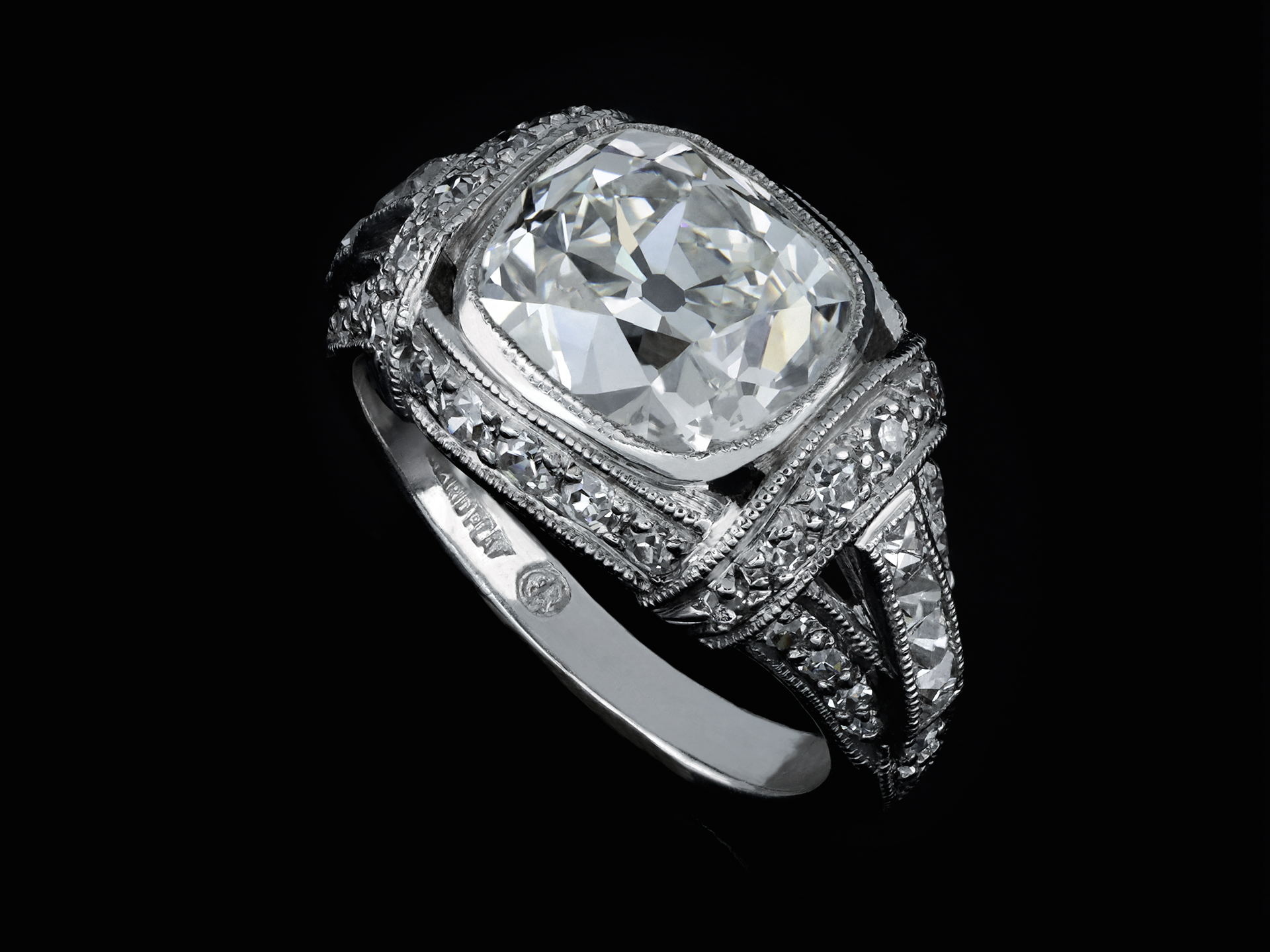 Old mine diamond cluster ring. Set to centre with a cushion shape old mine diamond, J colour, VVS2 clarity, with a weight of 3.24 carats in an open back rubover setting, flanked by eight cushion shape French cut diamonds in open back rubover settings with a combined weight of 0.24 carats, further adorned by forty two round eight cut diamonds in open back grain settings with a combined weight of 0.42 carats. The total approximate diamond weight is 3.90 carats, to a bombé design featuring millegrain edging and fancy geometric backholing, the tri-split shoulders flowing to a solid D-shape shank. Marked platinum and iridium, signed 'Erwin Reu Co', American, circa 1950, accompanied by Gemmological Institute of America report #2165184947.