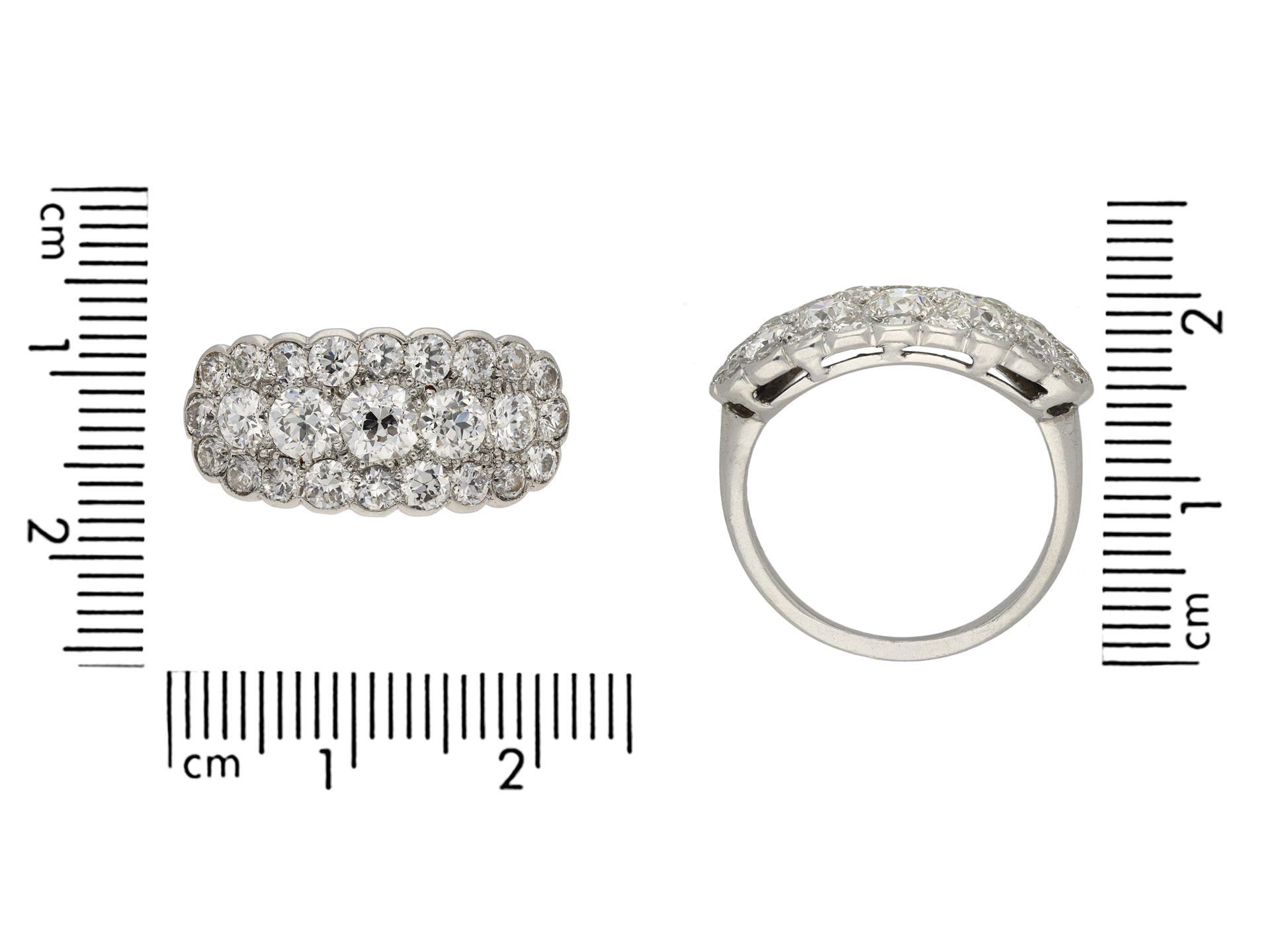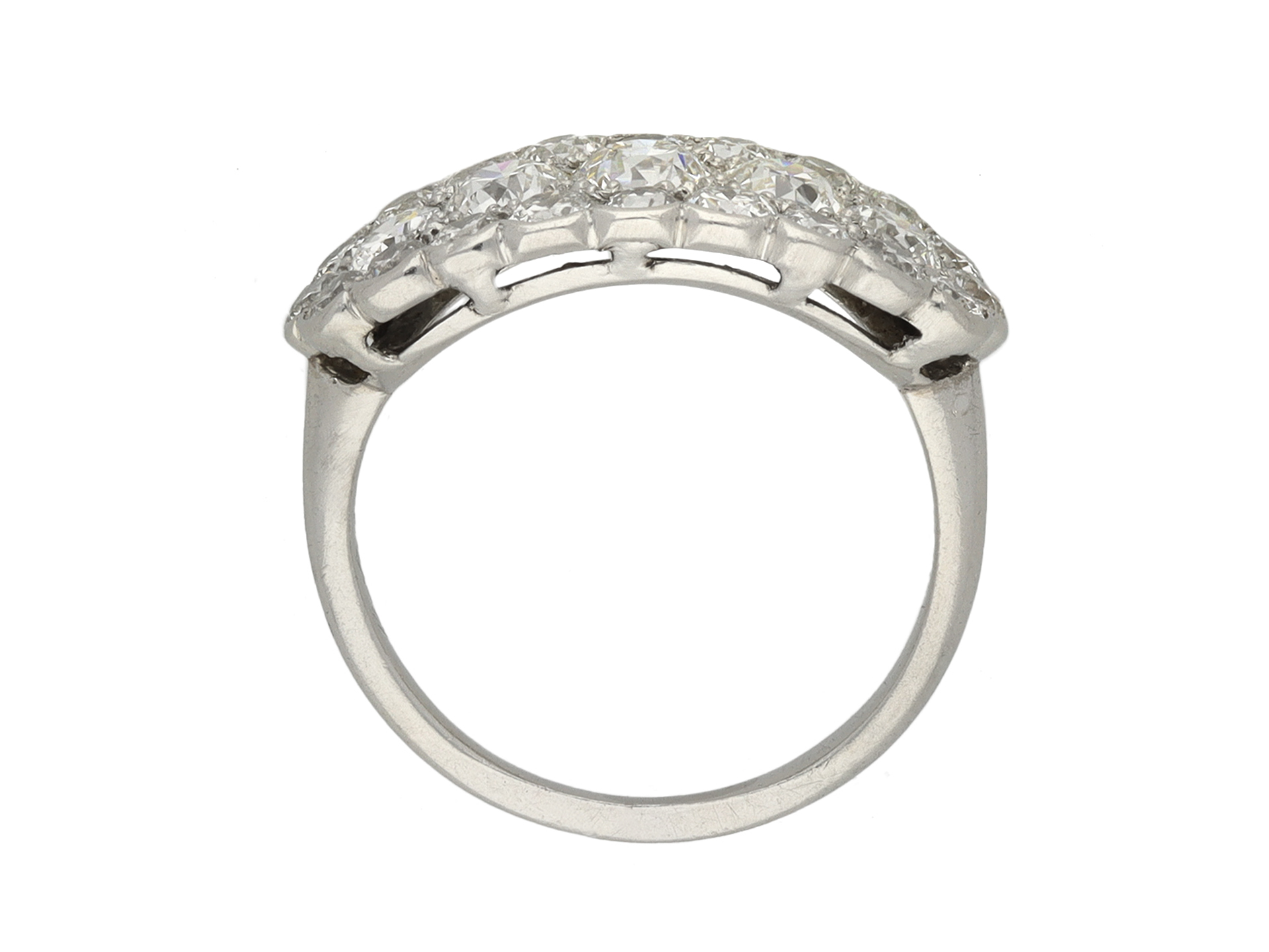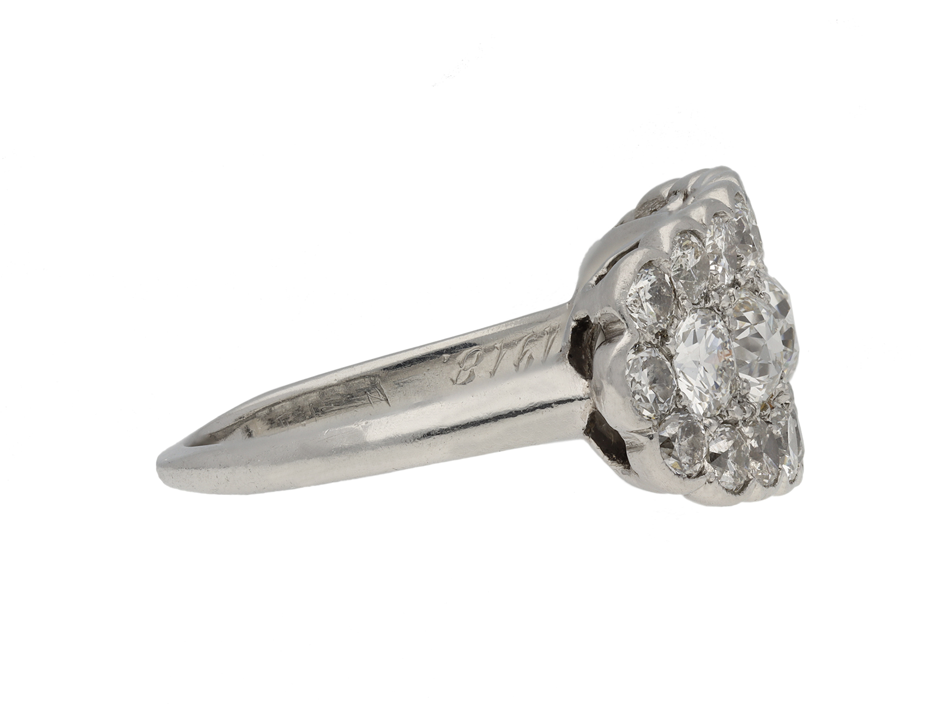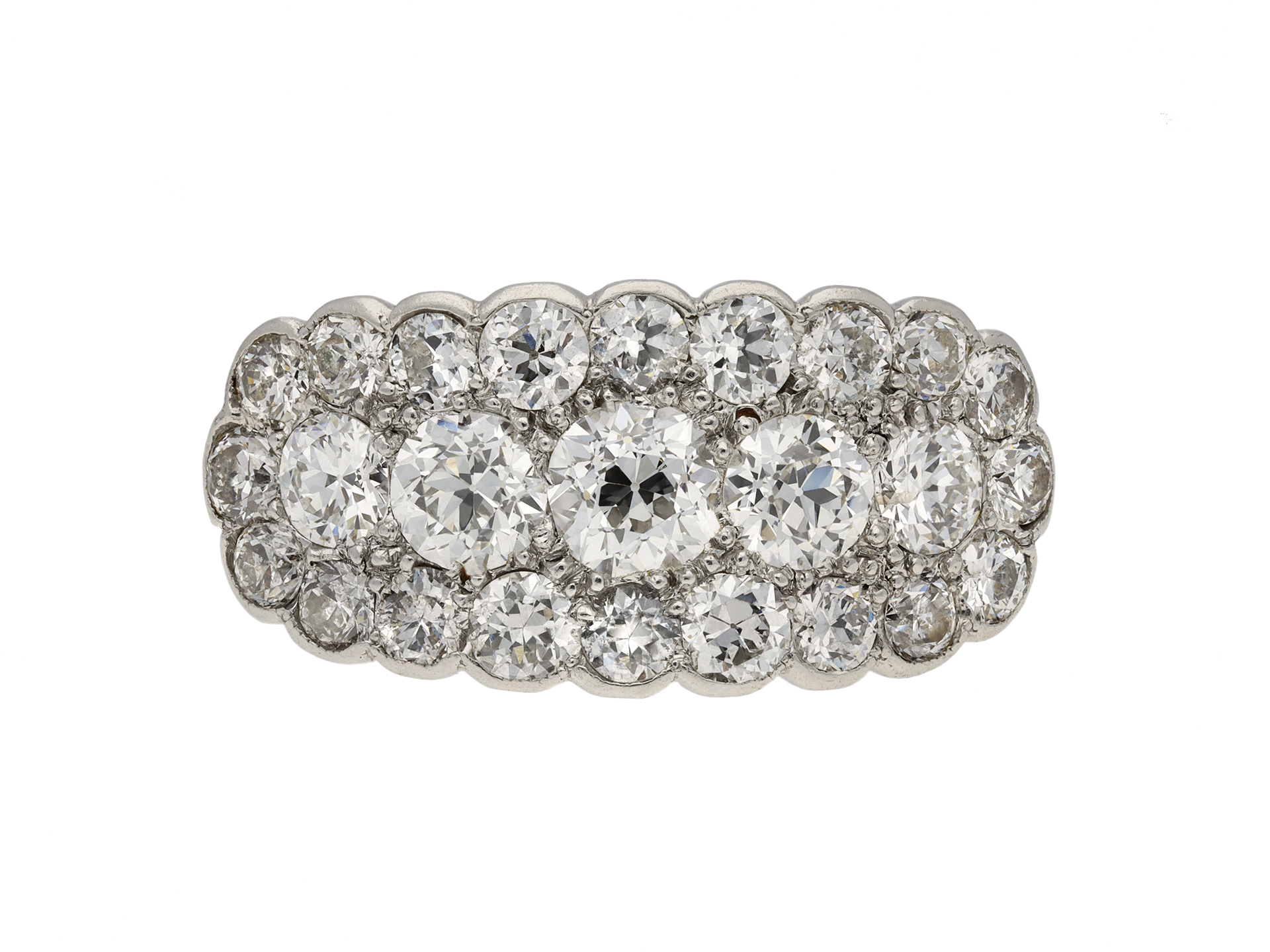 Old cut diamond cluster ring. Set with twenty five round old cut diamonds in open back grain and rubover settings with a combined approximate weight of 2.40 carats, to a horizontal cluster with polished scalloped edging, an openwork gallery and circular backholing, the trumpeting shoulders flowing to a solid V-shape shank. Tested platinum, circa 1915