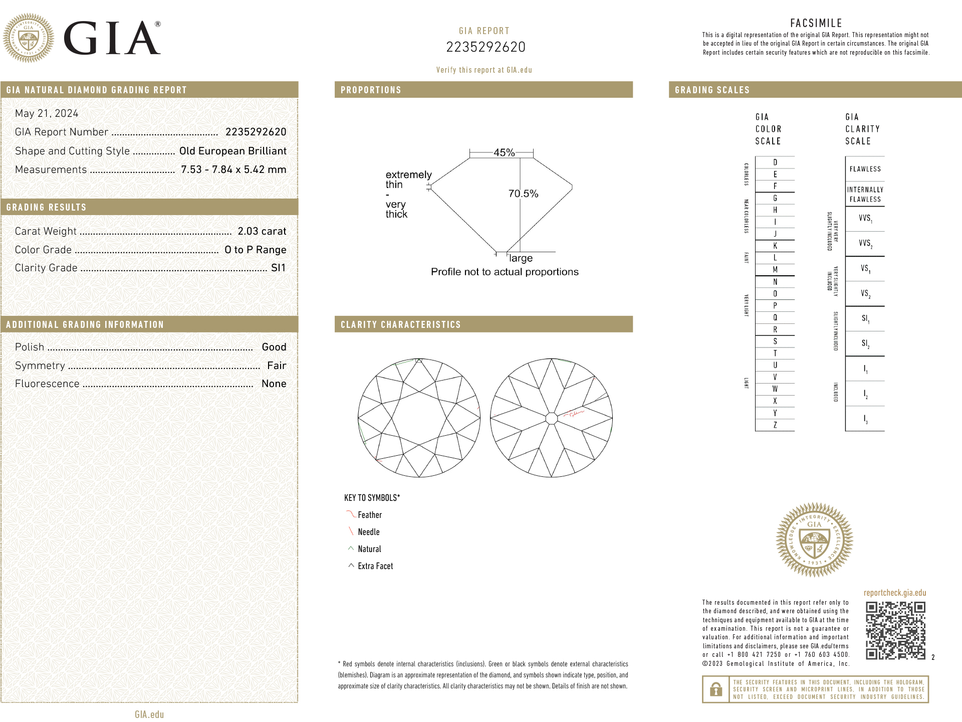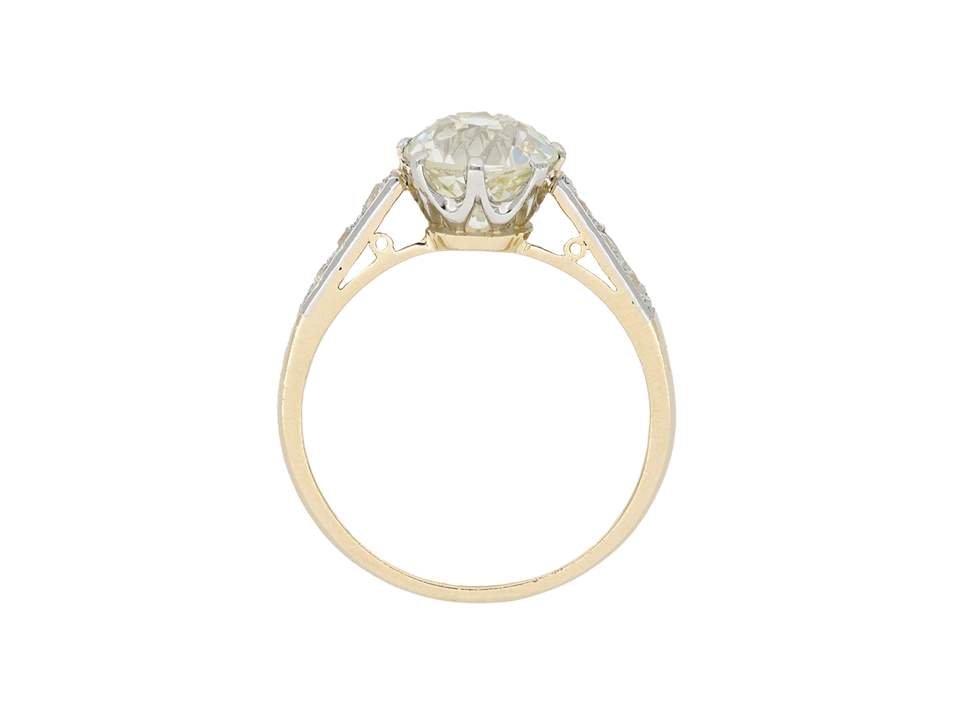 Old cut diamond flanked solitaire ring. Set to centre with a round old cut diamond, O-P colour, SI1 clarity, with a weight of 2.03 carats in an open back claw setting, flanked by cushion shape old mine diamonds in open back grain settings with a combined approximate weight of 0.20 carats. The total approximate diamond weight is 2.23 carats, to an elegant flanked solitaire design featuring curving claws, an intricately pierced gallery and fancy shape open backholing, leading to raised shoulders with chenier detail and flowing through to a solid shank. Marked 18 carat yellow gold and platinum, circa 1910, accompanied by Gemological Insitute of American (GIA) report #2235292620.