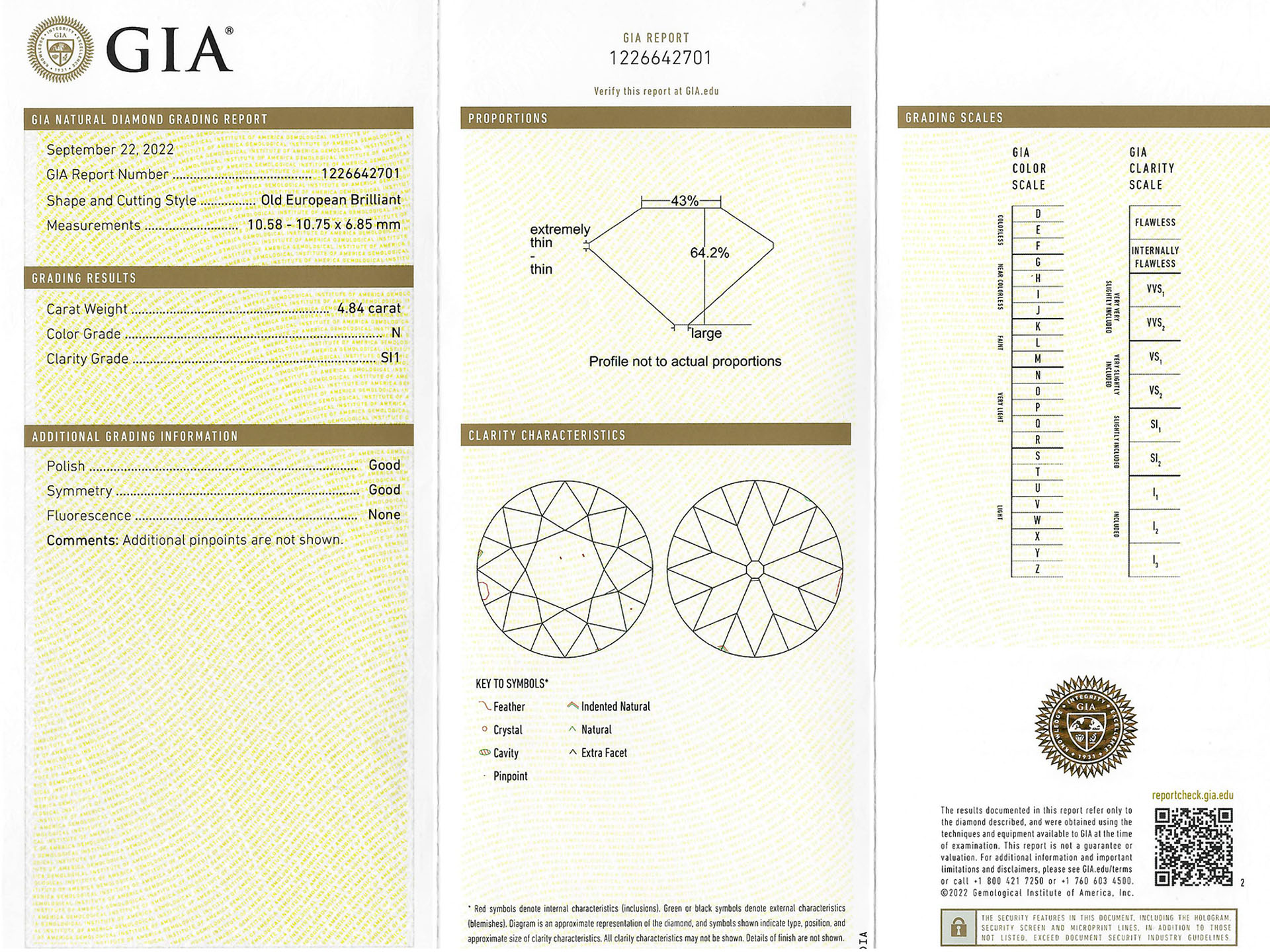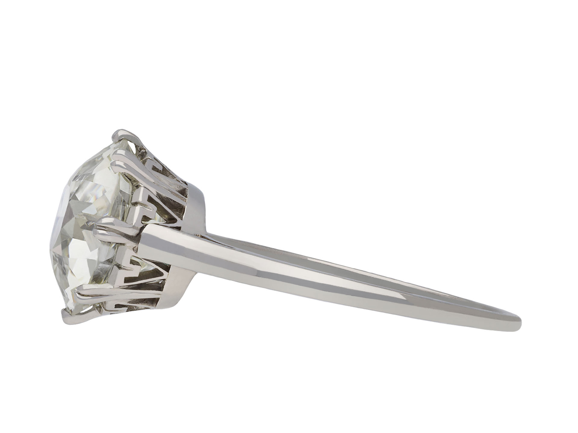 4.84 carat old cut diamond solitaire ring. Set with a round old cut diamond, N colour, SI1 clarity, with a weight of 4.84 carats, in an open back claw setting, to an elegant solitaire design featuring split curving claws, an intricately pierced gallery with geometric heart motifs, and circular open backholing, leading to raised openwork shoulders and flowing smoothly through to a solid D-shape shank. Tested white gold, English, circa 1920, accompanied by Gemological Institute of America (GIA) report #1226642701.