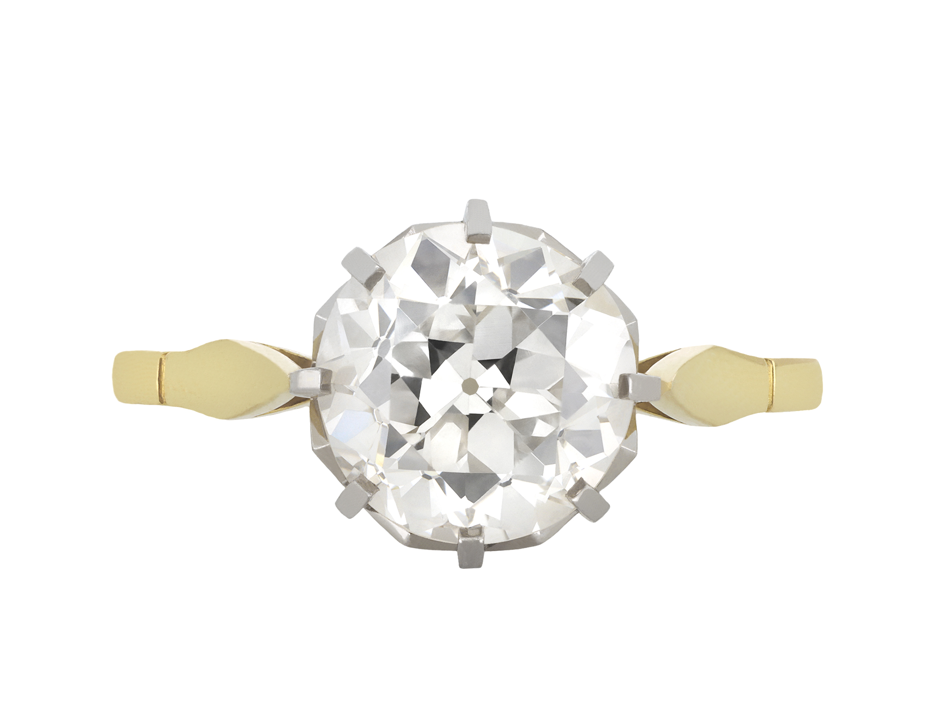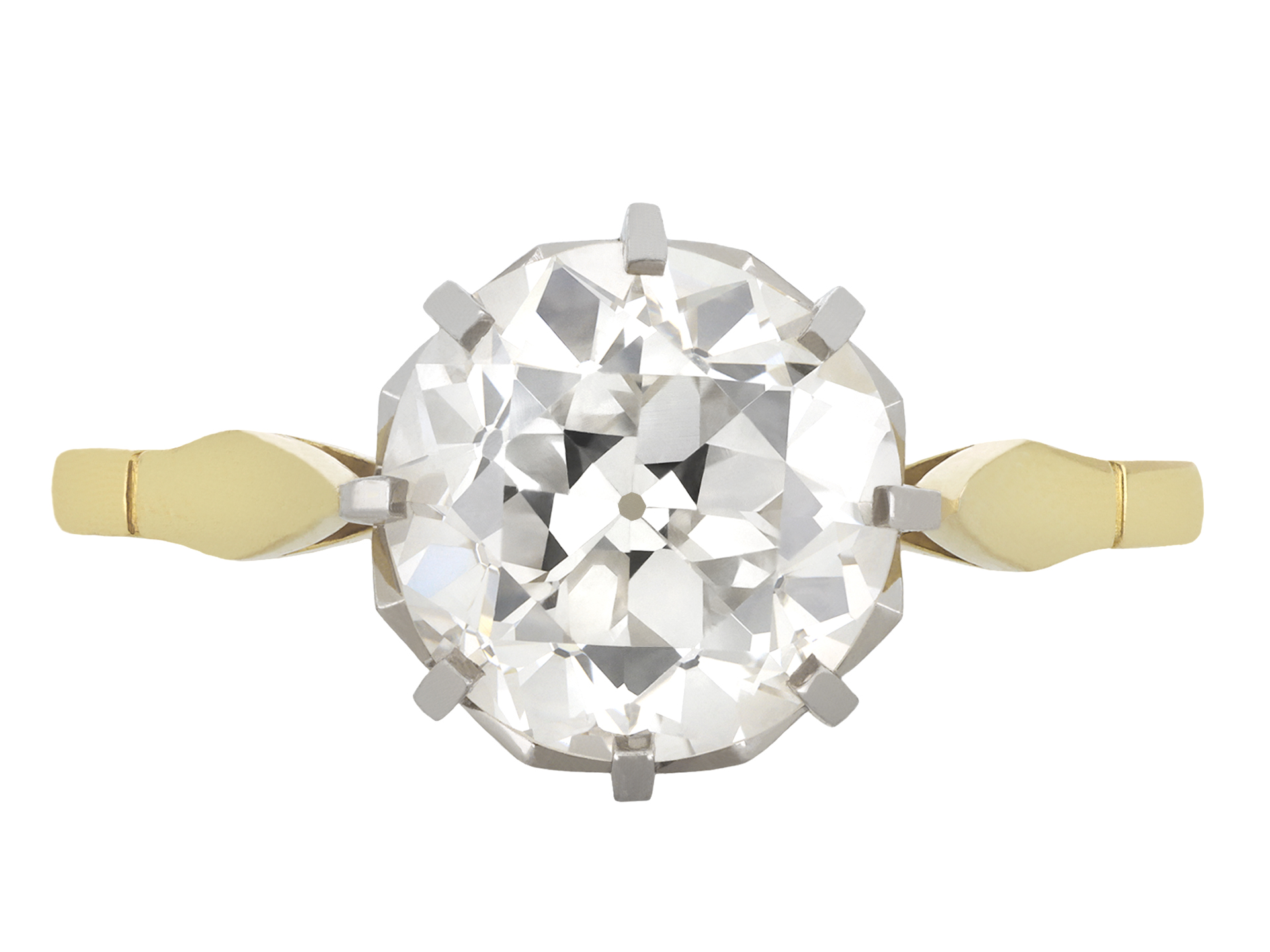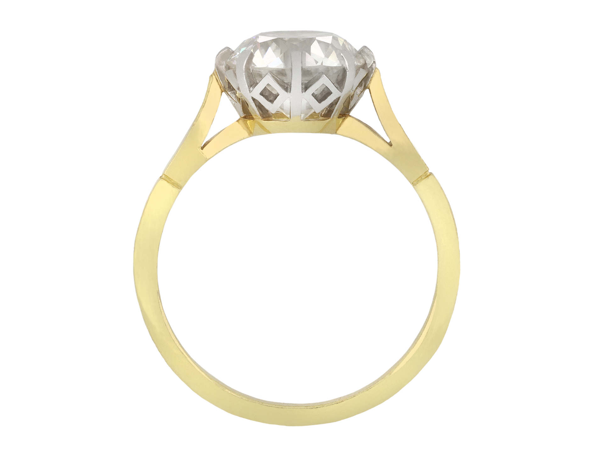 Old cut diamond solitaire ring. Set with a round old cut diamond, I colour, VS2 clarity, with a weight of 2.54 carats, in an open back claw setting, to an impressive solitaire design featuring curving claws, a decorative geometric gallery, and circular open backholing, leading to raised inwardly tapering shoulders and flowing through to a solid shank. Tested yellow gold and platinum, circa 1915, accompanied by Gemological Institute of America (GIA) report #6227771698.