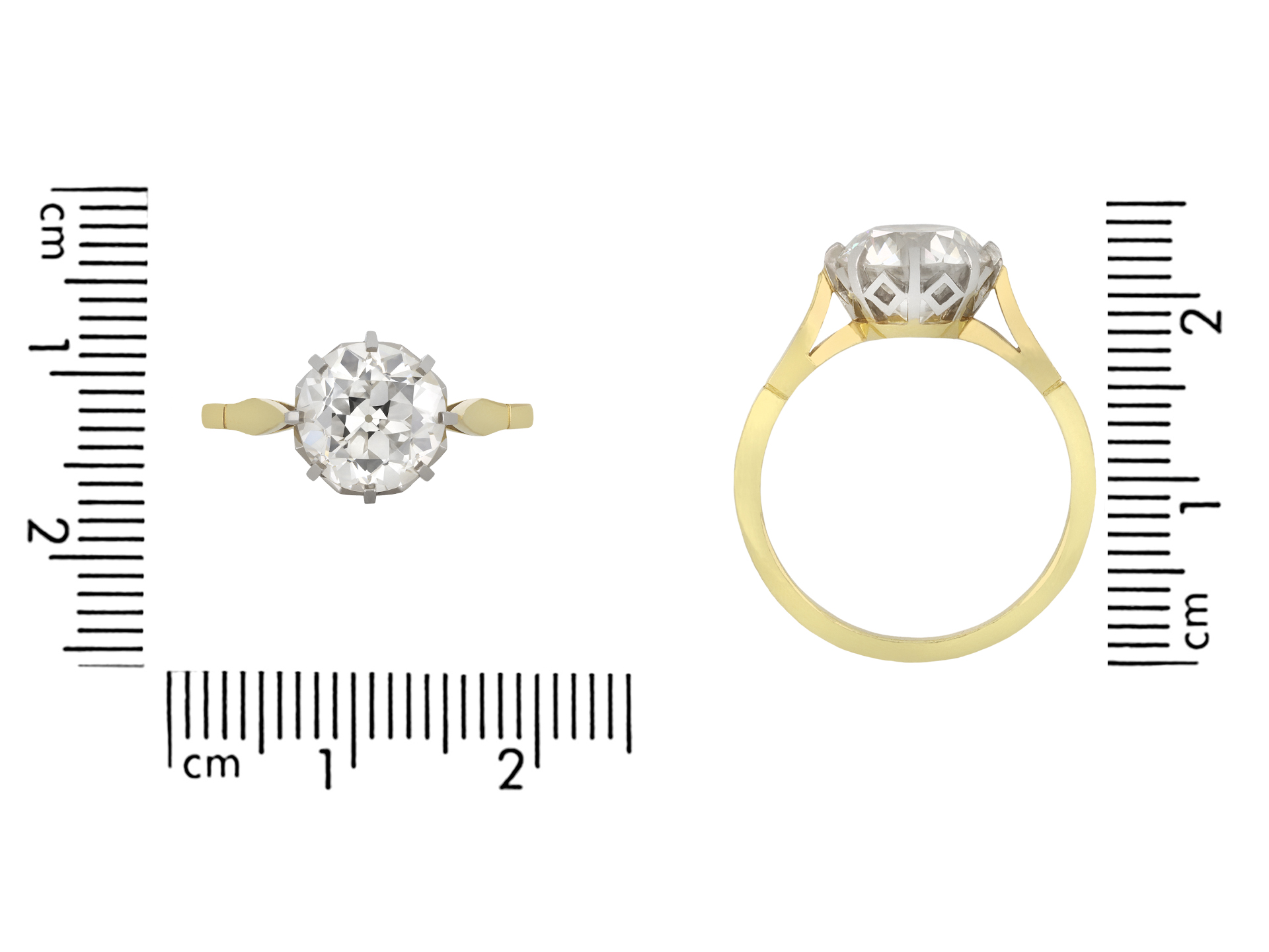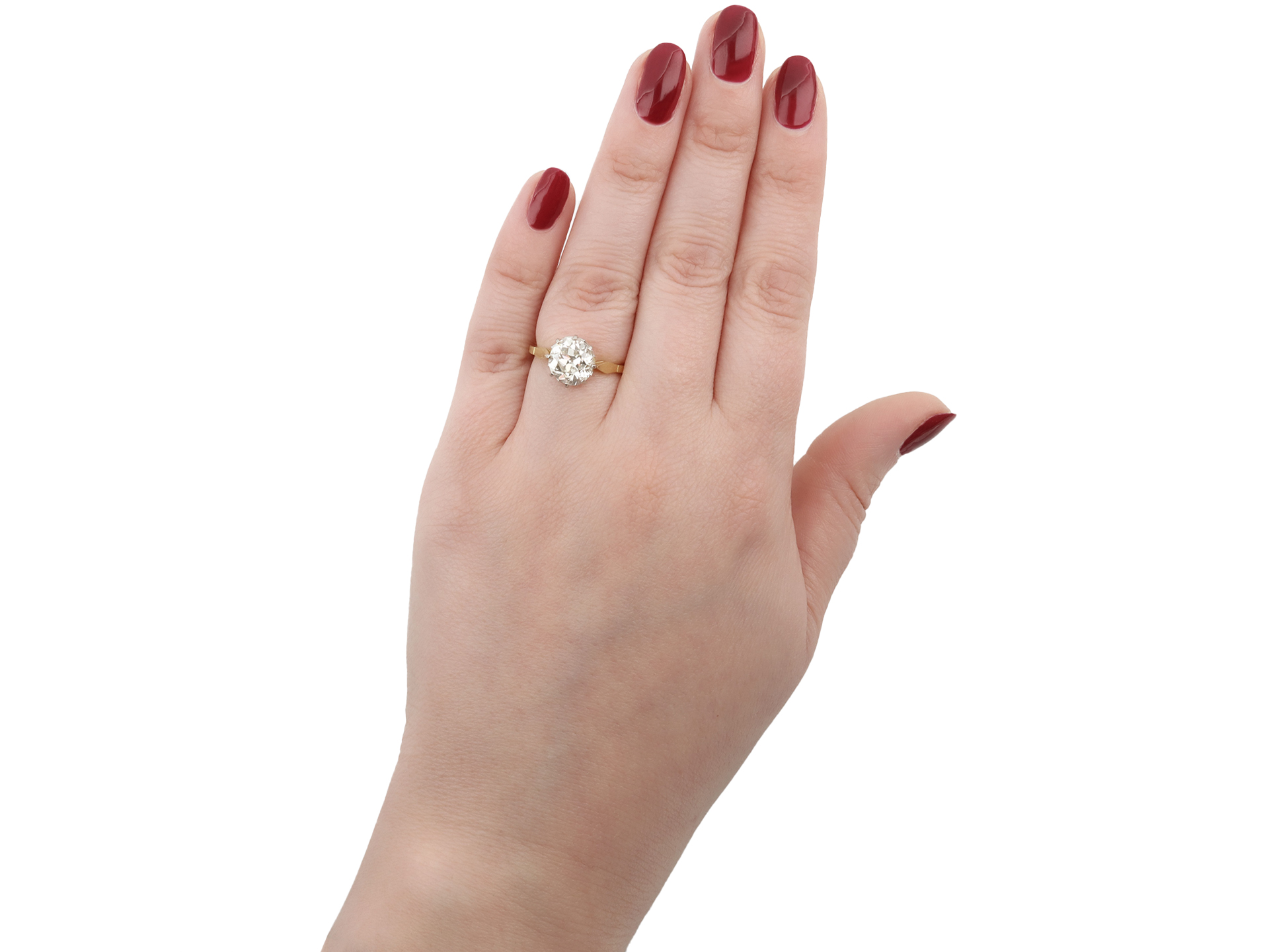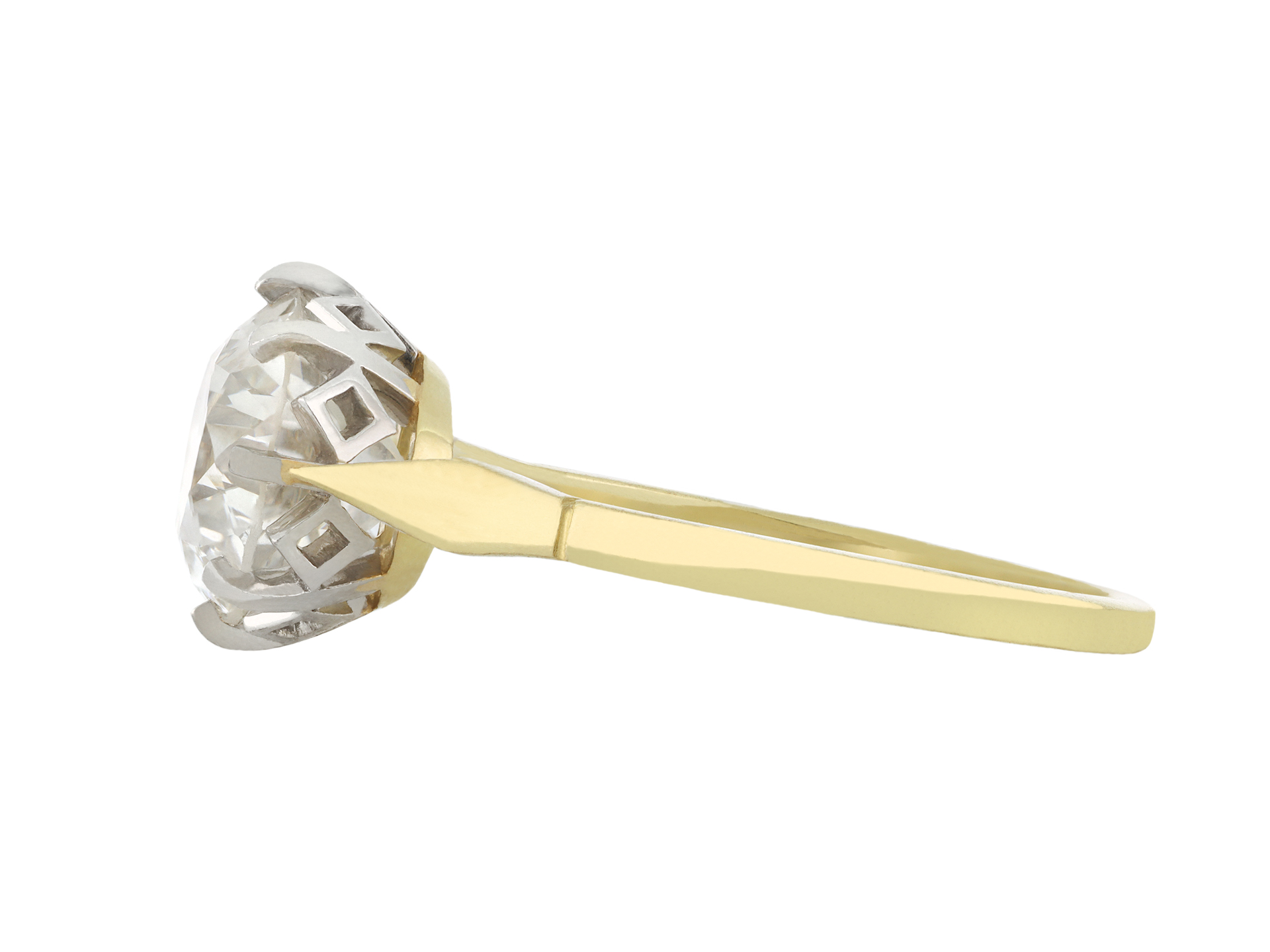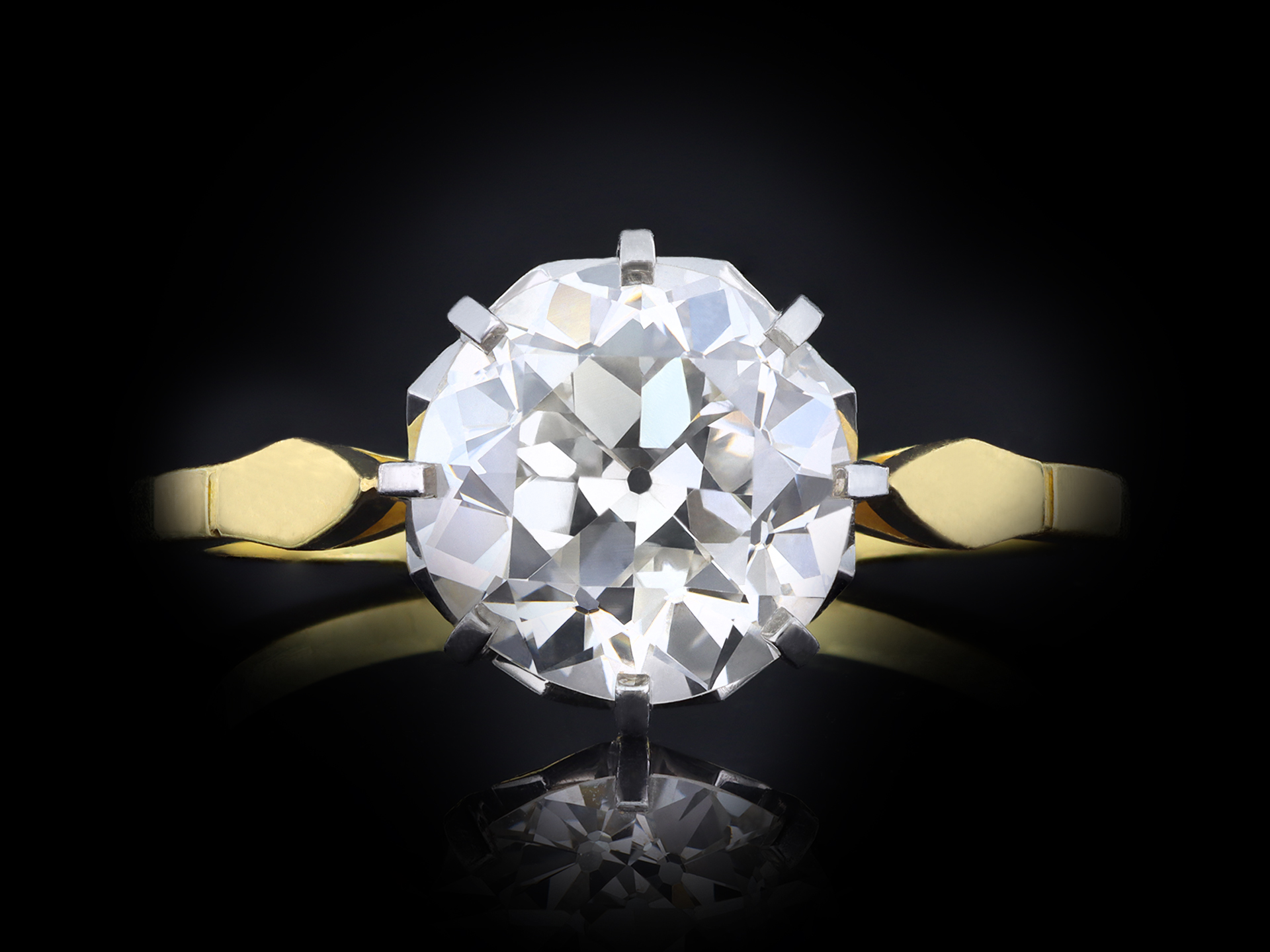 Old cut diamond solitaire ring. Set with a round old cut diamond, I colour, VS2 clarity, with a weight of 2.54 carats, in an open back claw setting, to an impressive solitaire design featuring curving claws, a decorative geometric gallery, and circular open backholing, leading to raised inwardly tapering shoulders and flowing through to a solid shank. Tested yellow gold and platinum, circa 1915, accompanied by Gemological Institute of America (GIA) report #6227771698.