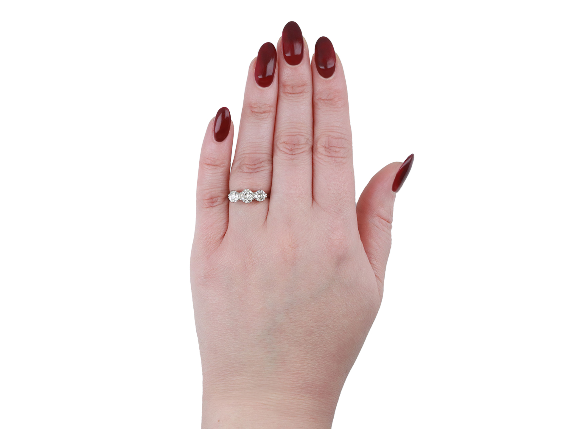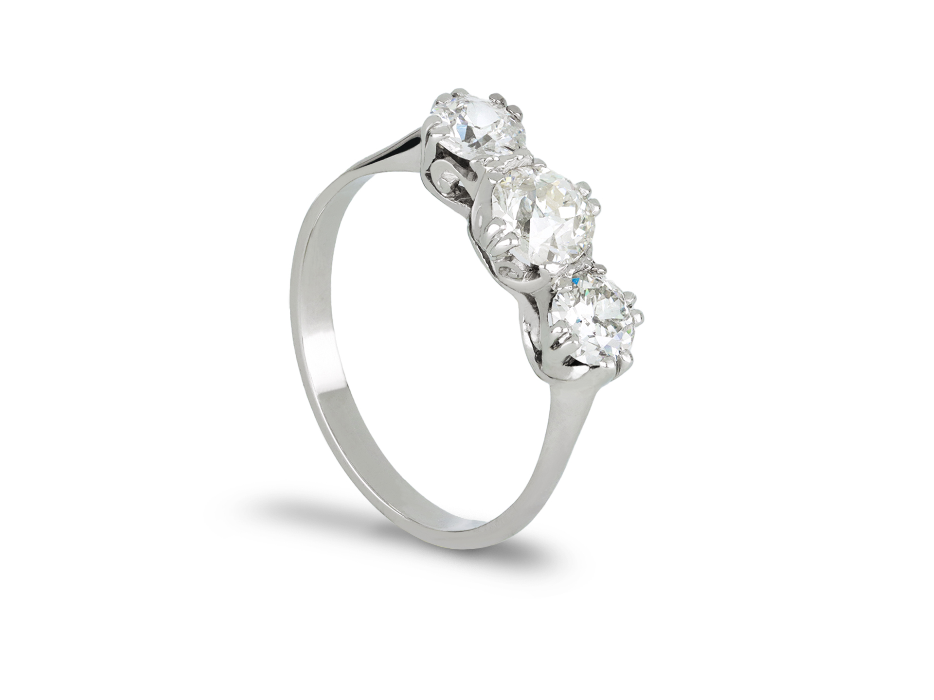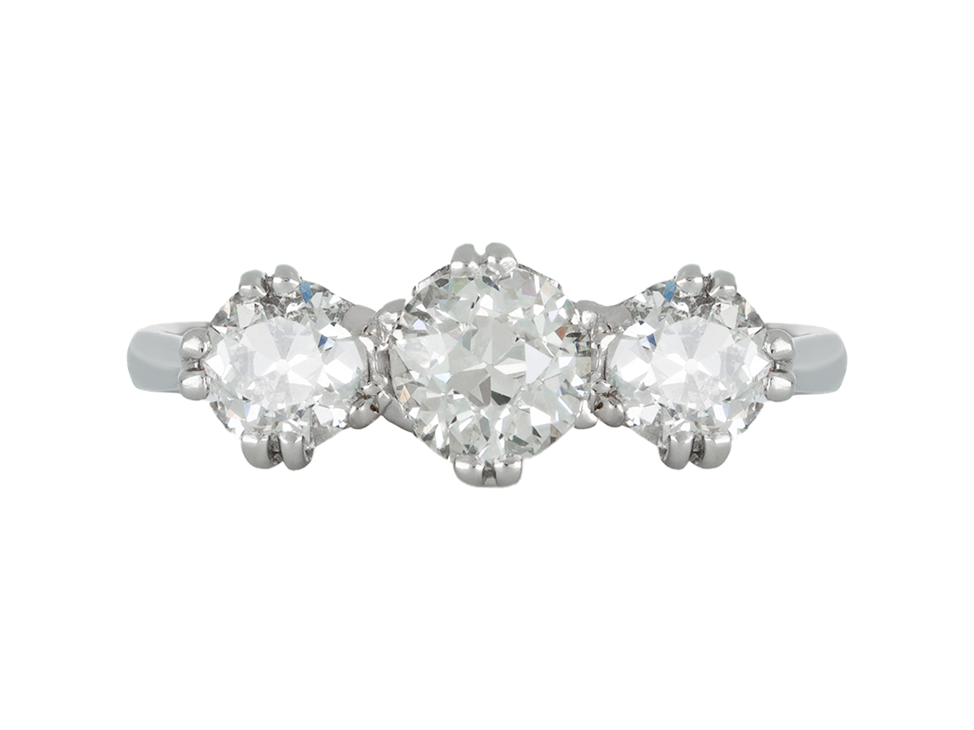 Old cut diamond three stone ring. Set to centre with a round old cut diamond in an open back claw setting with an approximate weight of 0.70 carats, flanked by two round old cut diamonds in open back claw settings with a combined weight of 0.75 carats. The total approximate diamond weight is 1.45 carats, to an elegant three stone ring featuring curving split claws, an intricately pierced scrolled gallery and circular open backholing, leading to inwardly tapering shoulders and flowing through to a solid D-shape shank. Tested palladium, circa 1940.