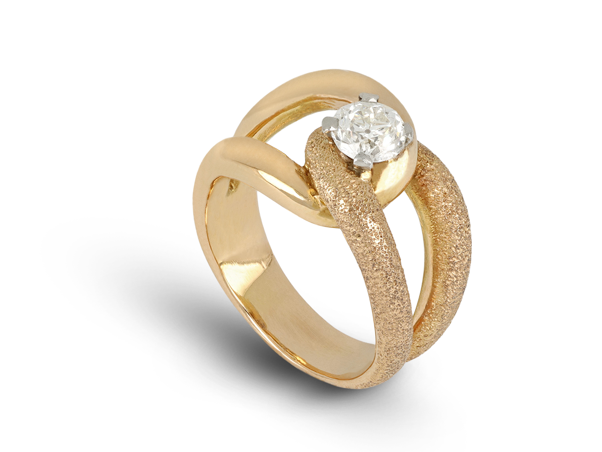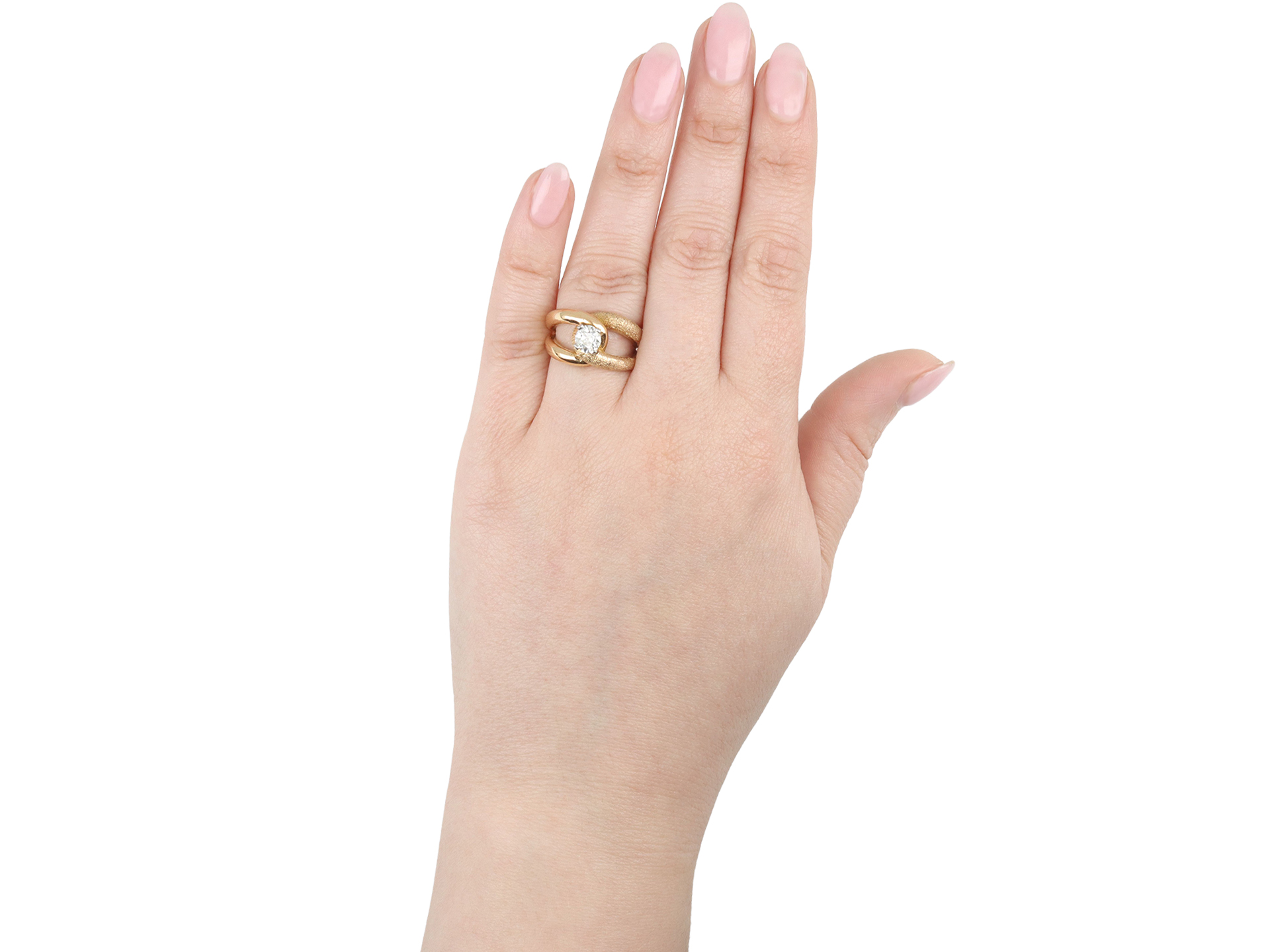 Old cut solitaire diamond cocktail ring. Set with one central round old cut diamond in an open back claw setting with an approximate weight of 0.65 carats, to an interlinked cross over design featuring curving claws, granular detailing and open backholing, flanked by open shoulders flowing seamlessly through to a solid ridged shank. Tested rose gold and platinum, circa 1945.