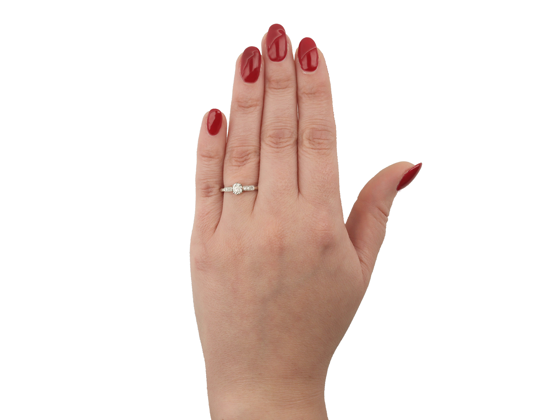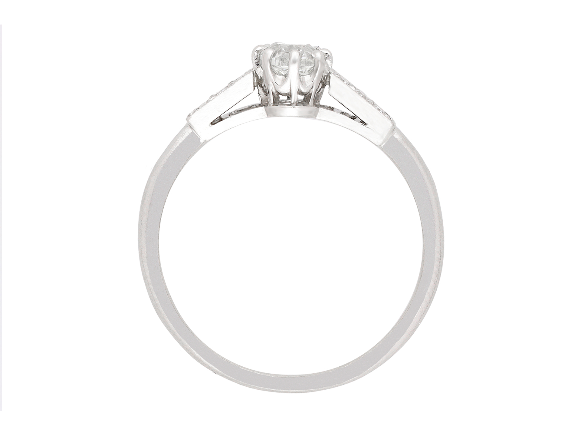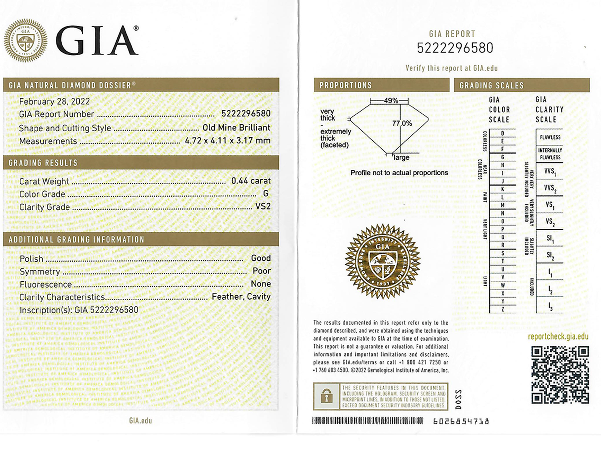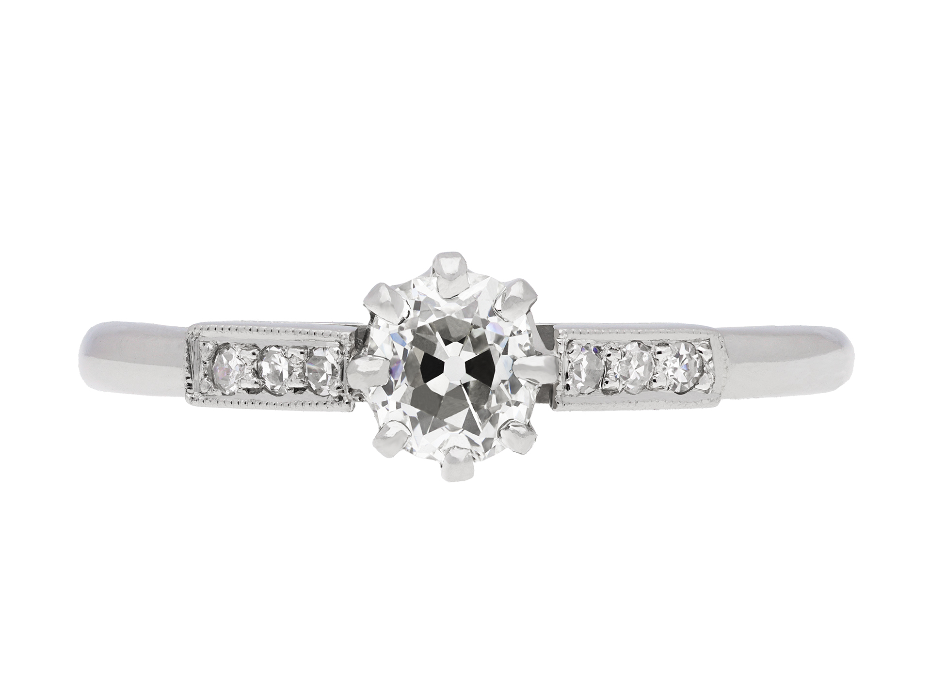 Old mine diamond flanked solitaire ring. Set to centre with a cushion shape old mine diamond, G colour, VS2 clarity, with a weight of 0.44 carats, in an open back claw setting, flanked by six round eight-cut diamonds in open back grain settings with a combined approximate weight of 0.12 carats. The total approximate diamond weight is 0.56 carats, to an elegant flanked solitaire design featuring millegrain edging, a pierced gallery, and fancy shape open backholing, leading to raised shoulders and flowing through to a solid D-shape shank. Tested platinum, circa 1915, accompanied by Gemological Institute of America report #5222296590.