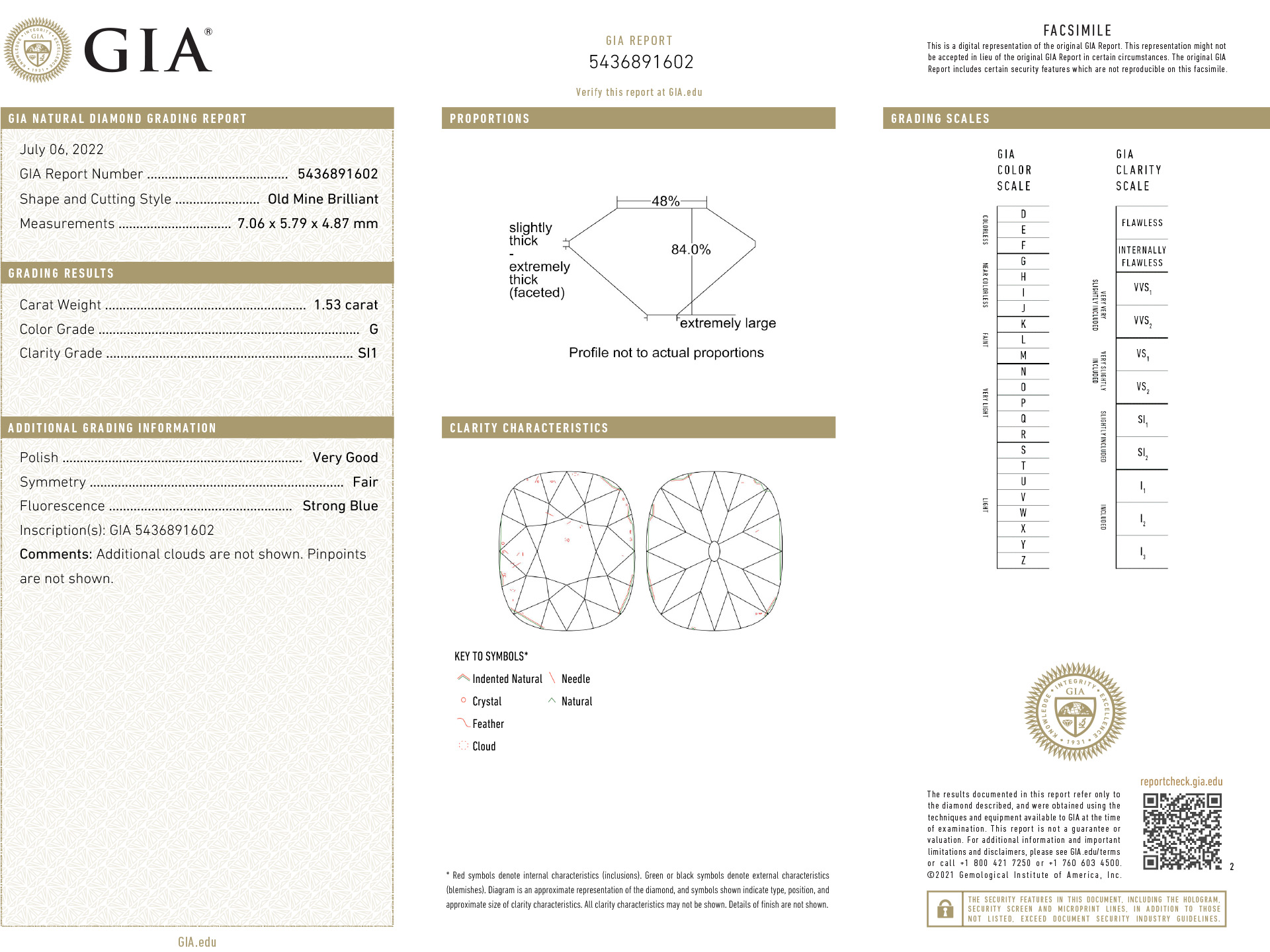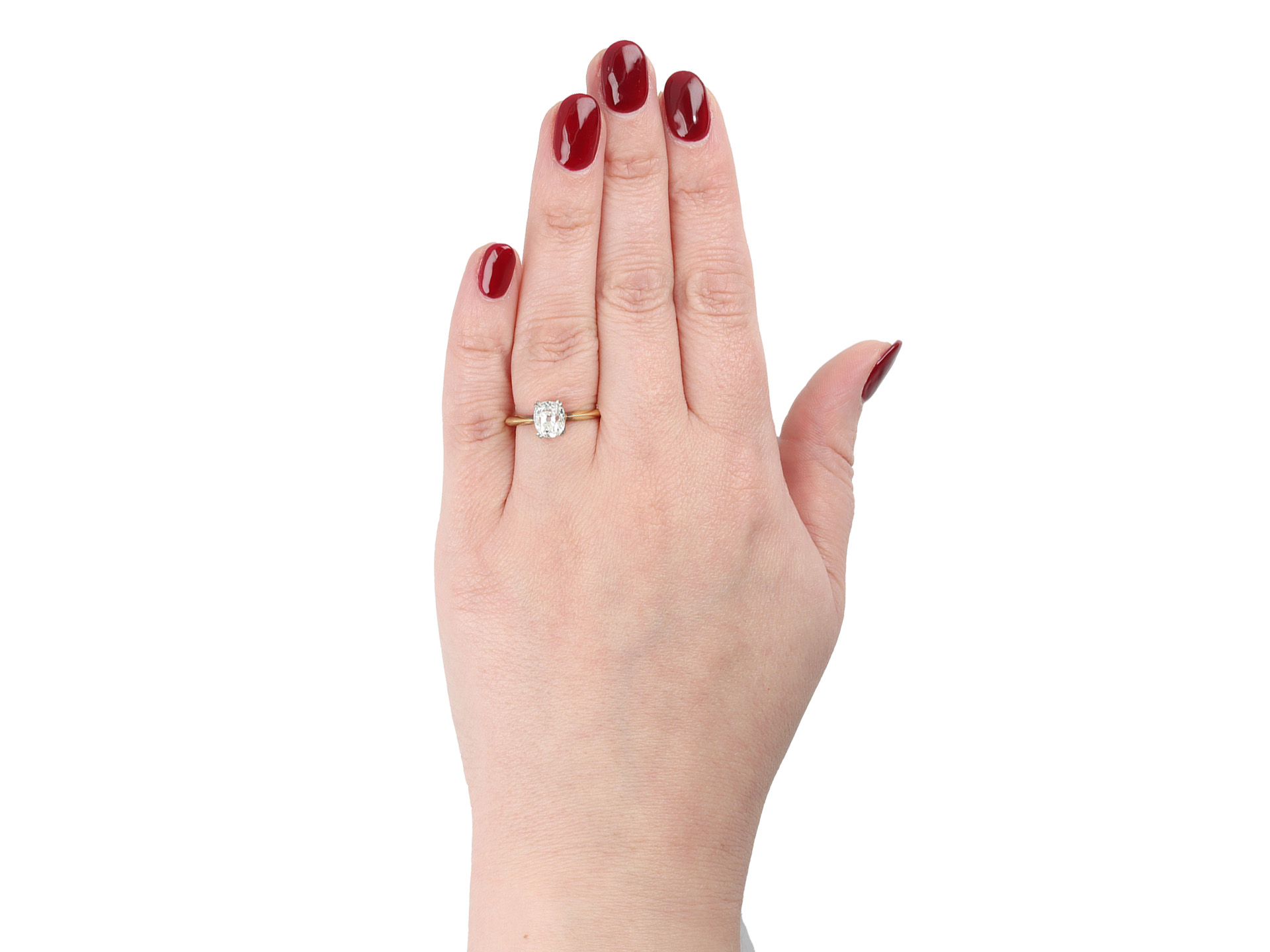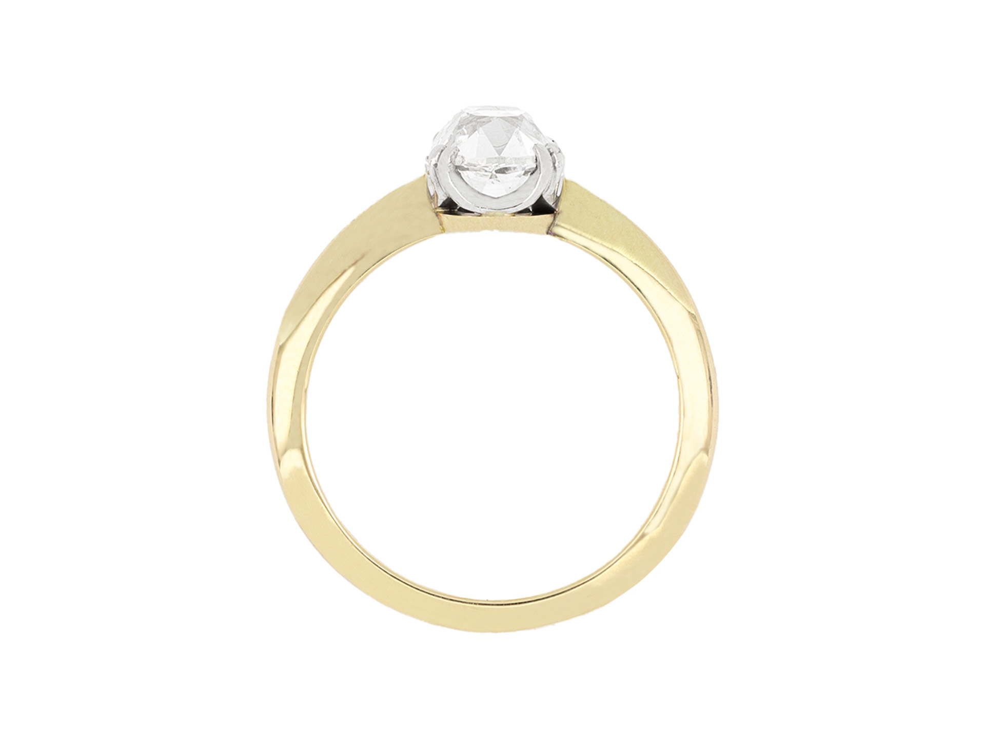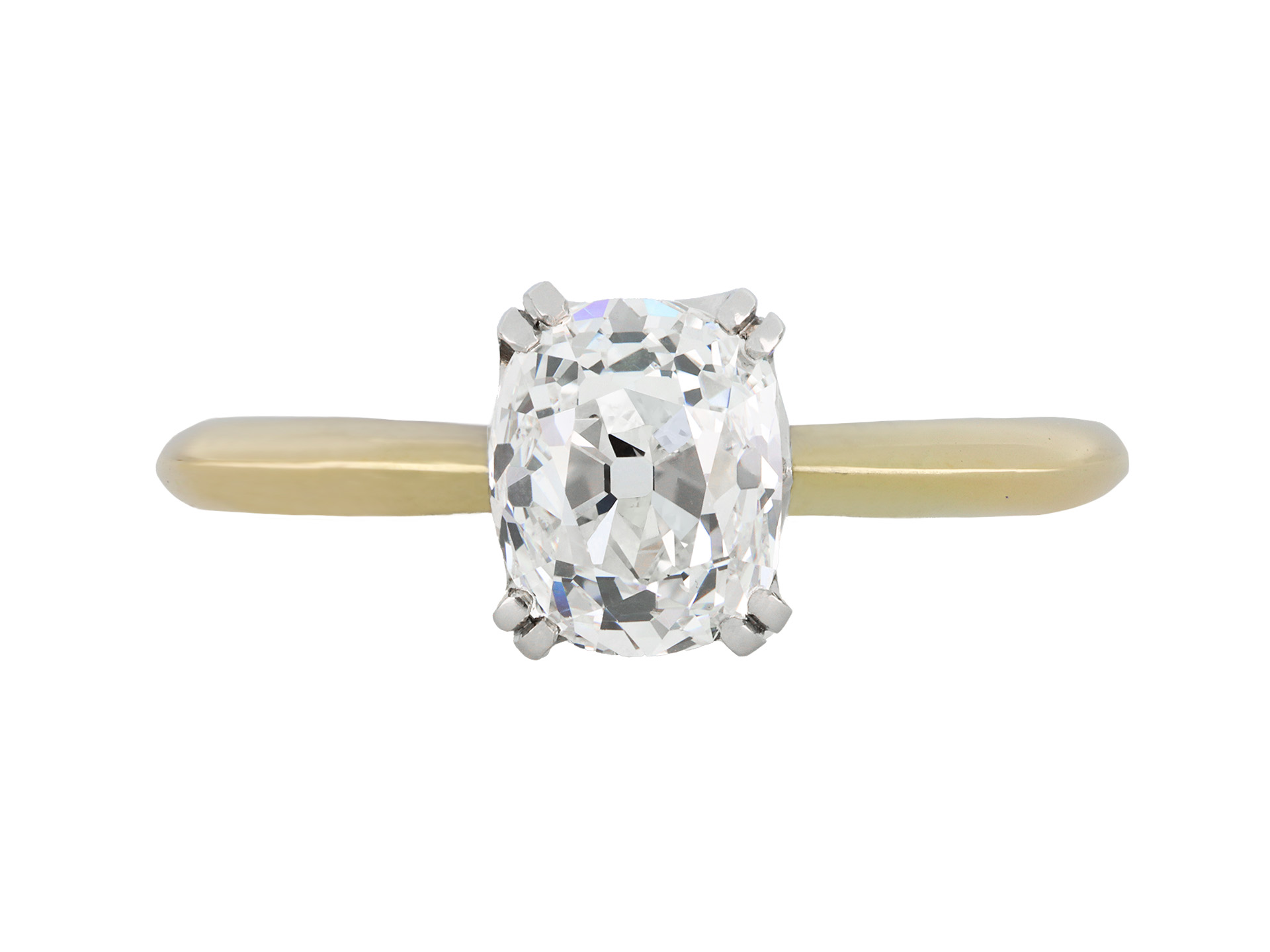 Old mine diamond solitaire ring. Set with a cushion shape old mine diamond, G colour, SI1 clarity, with a weight of 1.53 carats, in an open back claw setting, to an elegant solitaire design featuring curving double claws, a pierced gallery and open backholing, leading to inwardly tapering shoulders and flowing through to a solid knife edge shank. Tested yellow gold and platinum, circa 1905, accompanied by Gemological Institute of America report #5436891602.