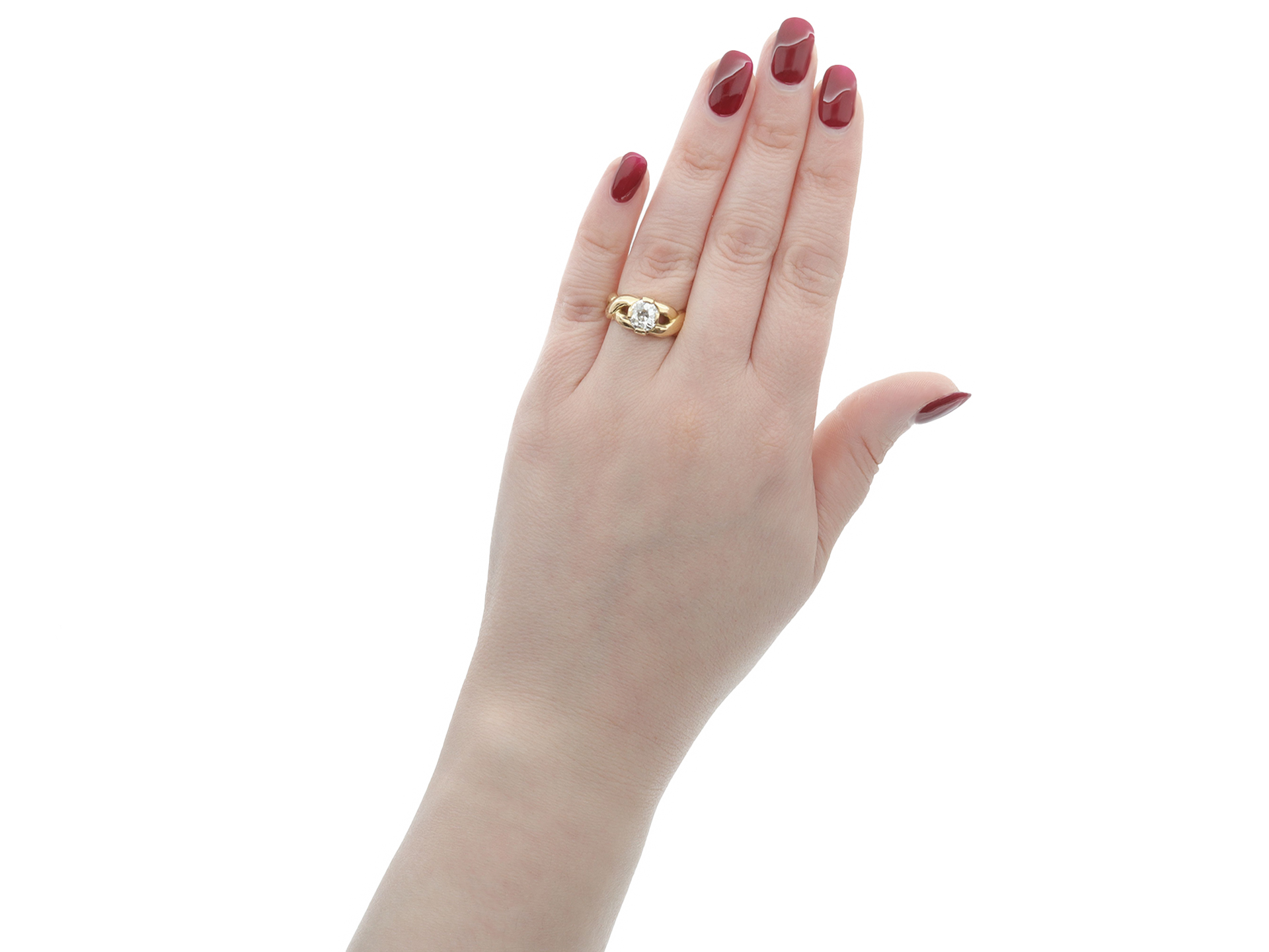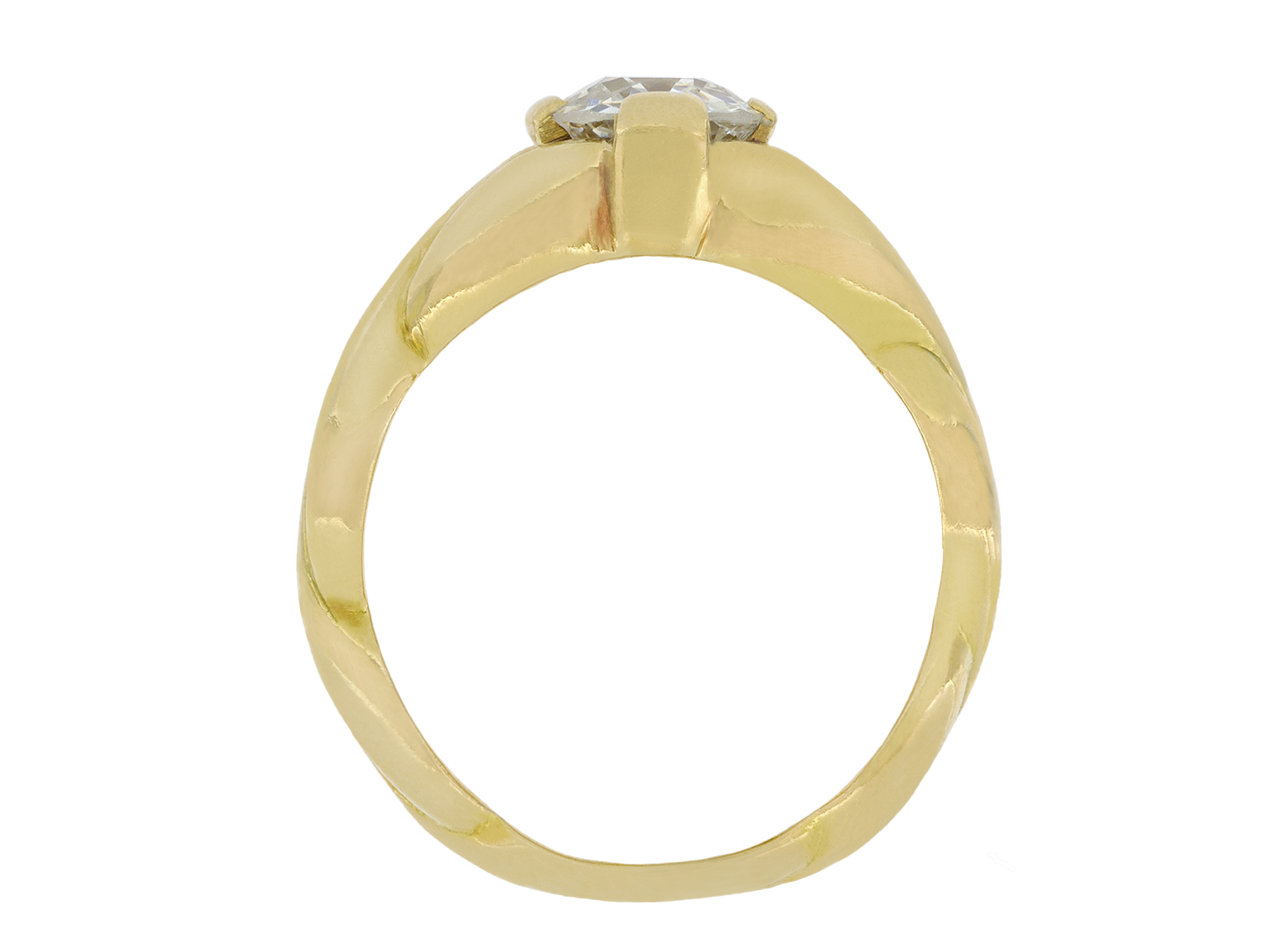 Old mine diamond solitaire ring. Set to centre with a cushion shape old mine diamond in an open back claw setting with an approximate weight of 1.10 carats, to a circular collet with stylised claws, open backholing and a curving openwork twist design flowing around the full shank. Marked 18 carat yellow gold, French control marks, circa 1940.