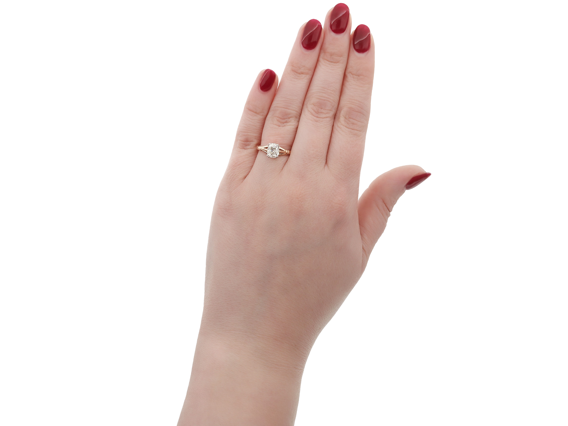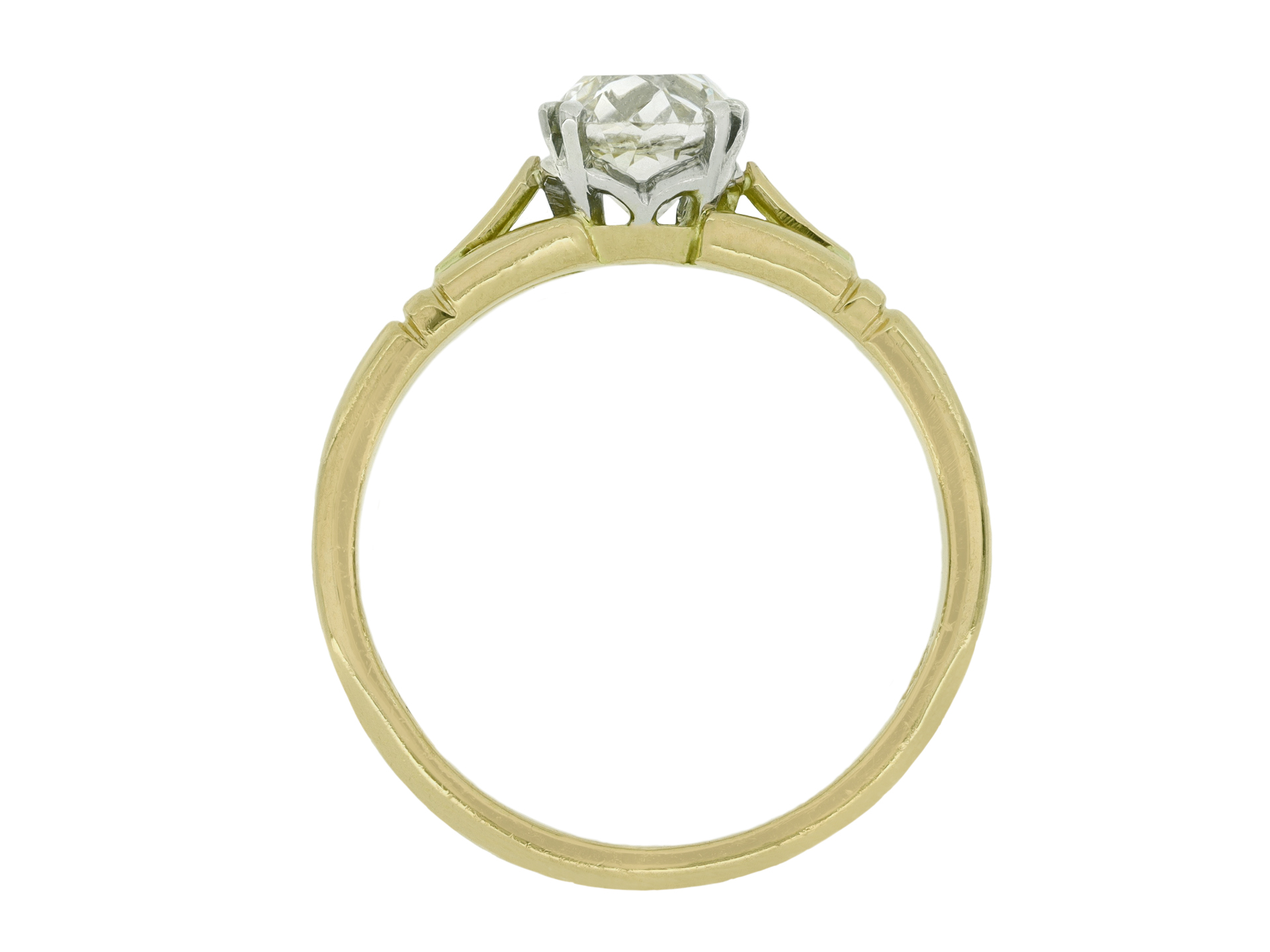 Old mine diamond solitaire ring. Set with a cushion shape old mine diamond, M colour, SI2 clarity with a weight of 1.08 carats in an open back claw setting, to an elegant solitaire design featuring curving split claws, an intricately pierced gallery, and open backholing, the tri-split shoulders with ridge detail flow through to a solid D-shape shank. Marked 18 carat rose yellow gold and platinum, circa 1905, accompanied by Gemological Institute of America (GIA) report #2235221268.