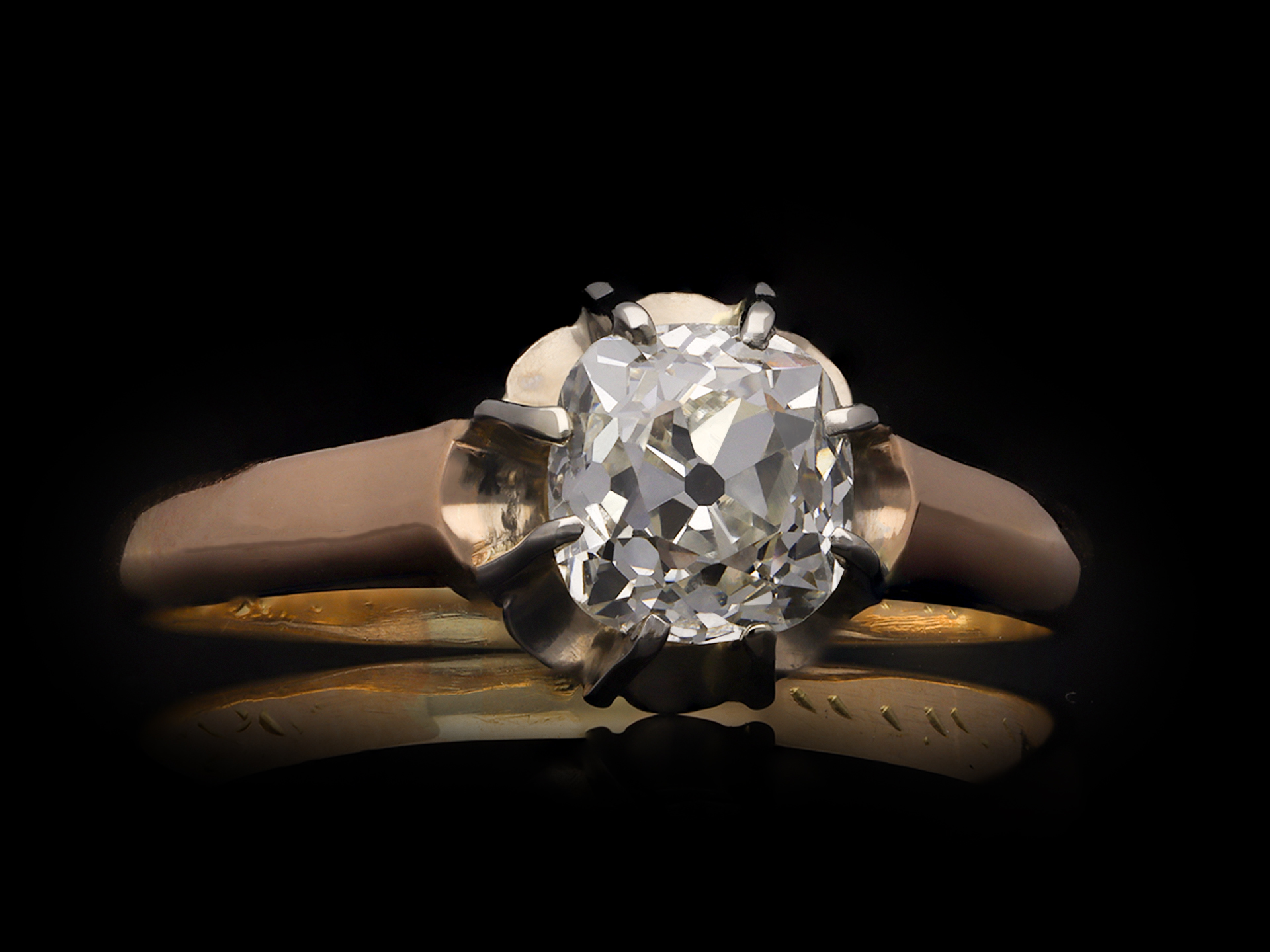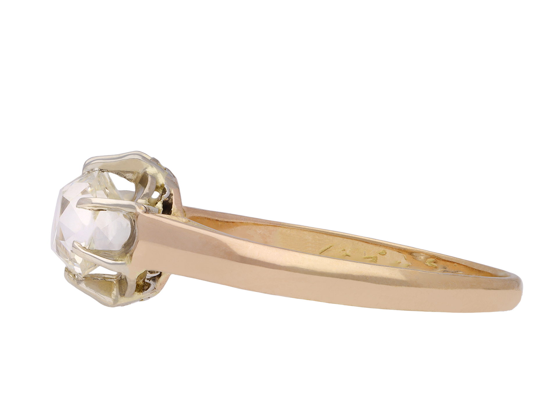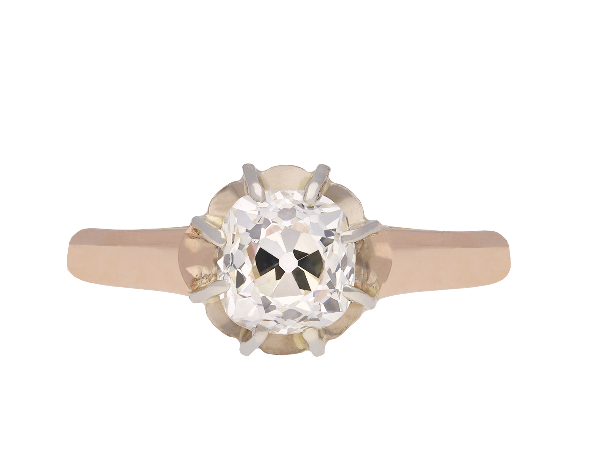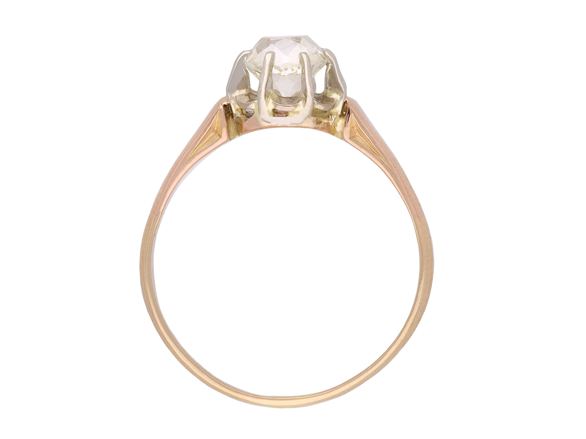 Old mine diamond solitaire ring. Set to centre with a cushion shape old mine diamond, with an approximate weight of 1.00 carat, in an open back claw setting, to an elegant illusion set solitaire design featuring curving claws, an intricately pierced gallery and circular open backholing, leading to smooth shoulders with carved detailing and flowing through to a solid D-shape shank. Tested rose gold and white gold, indistinct engraving to interior, French control marks, circa 1905.