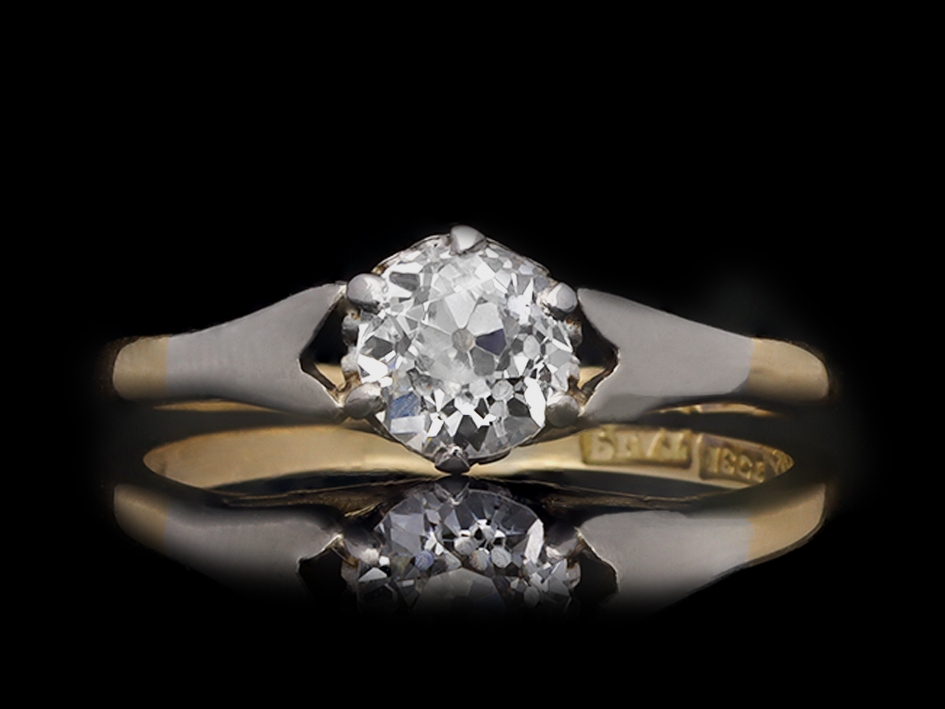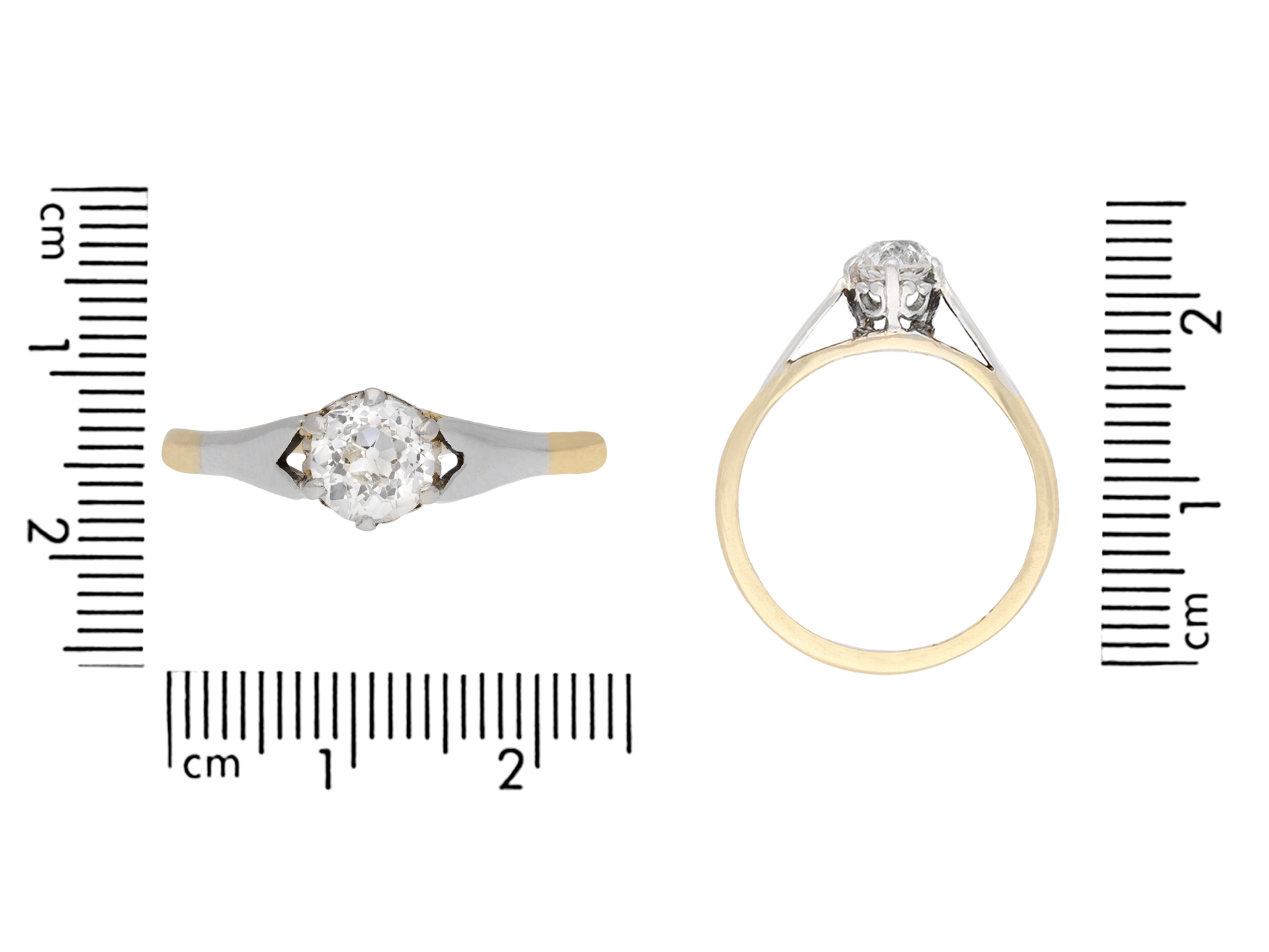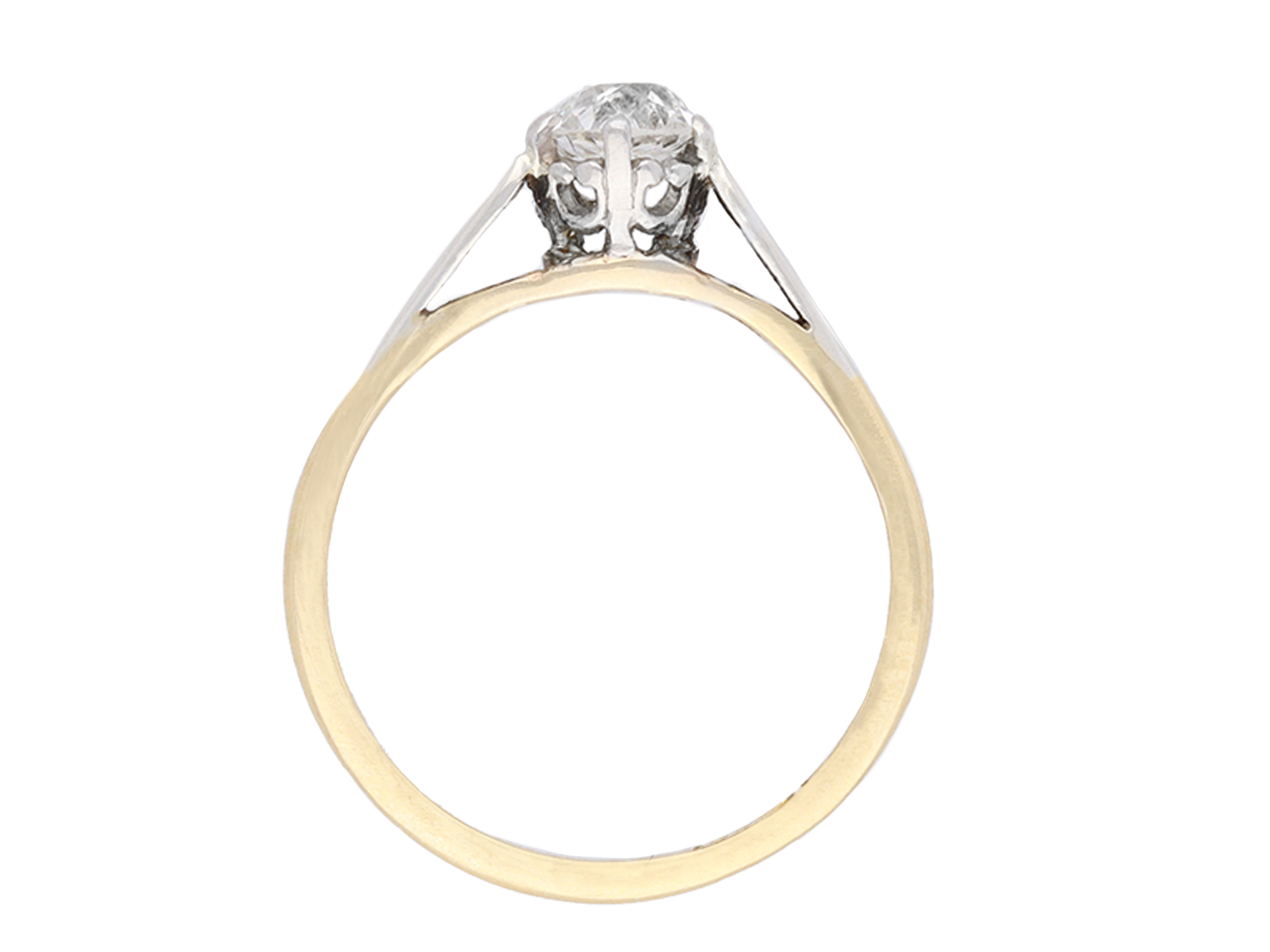 Old mine diamond solitaire ring, circa 1940. Set to centre with a cushion shape old mine cut diamond in an open back claw setting with an approximate weight of 0.85 carats, to an elegant solitaire featuring curving claws, an intricately pierced gallery with heart motifs and open circular backholing, leading to raised split shoulders and following through to a solid D-shape shank. Marked 18 carat yellow gold and platinum, tested white gold, circa 1940.