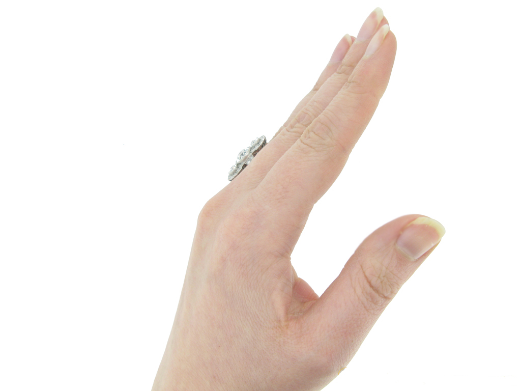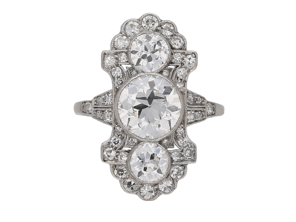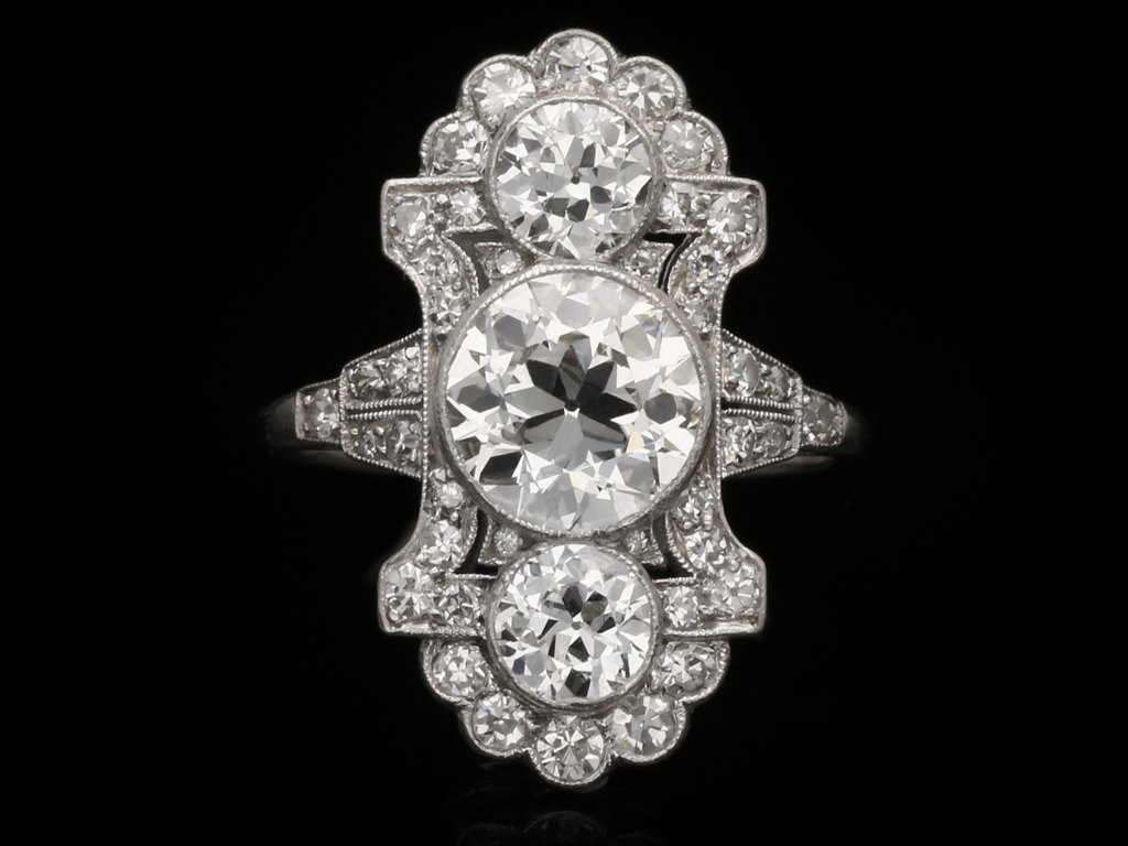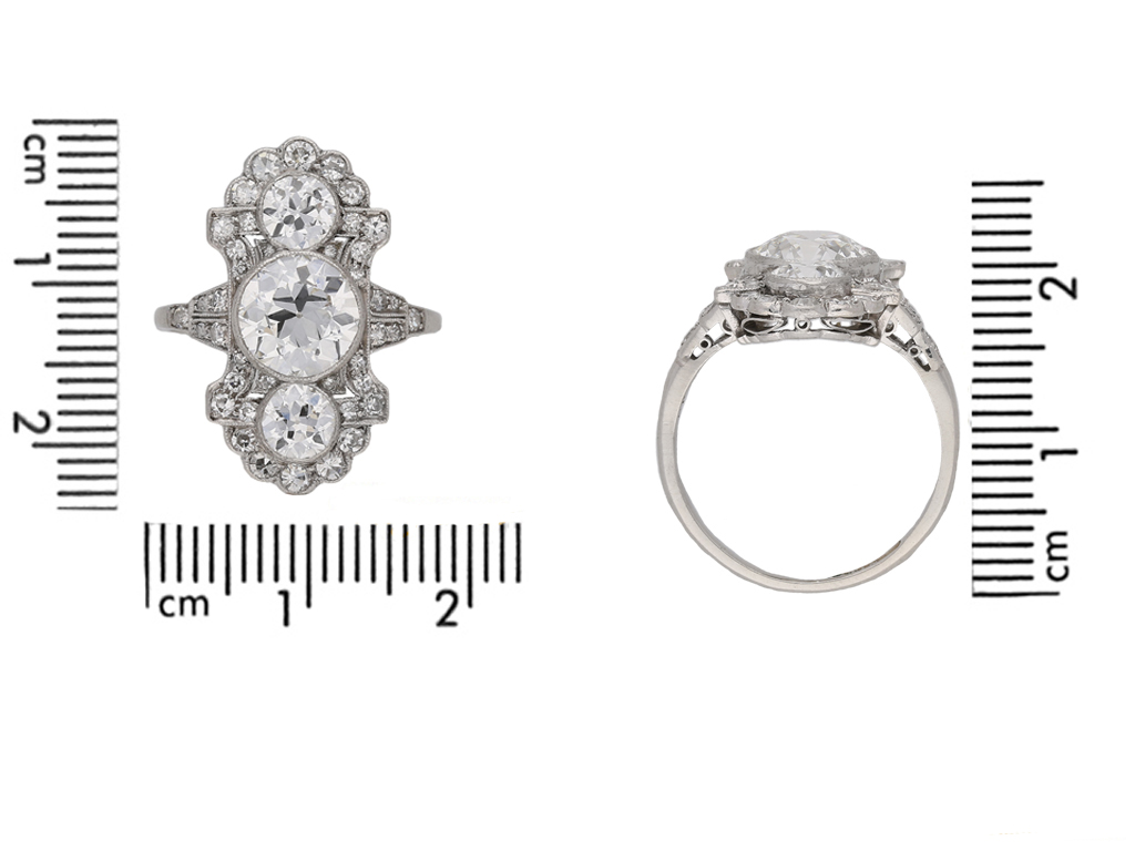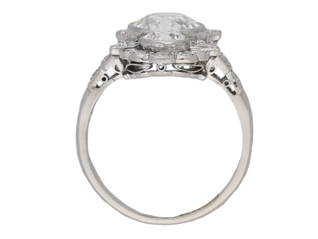 Ornate diamond ring. Set with one central round old cut diamond in an open back rubover setting with a weight of 1.75 carats, set to top and bottom with two round old cut diamonds in similar settings with a combined weight of 0.80 carats, all surrounded by a pierced scalloped frame set with thirty round eight cut diamonds in open back grain settings, flanked by raised split shoulders supported by cheniers and set with ten round eight cut diamonds in open back grain settings, all forty eight cut diamonds with a combined weight of 0.80 carats. The total approximate diamond weight is 3.35 carats, to an ornate cluster ring with millegrain borders, fancy shaped backholing, above an intricate openwork foliate gallery, and on a slim D-section shank. Marked platinum, circa 1915.