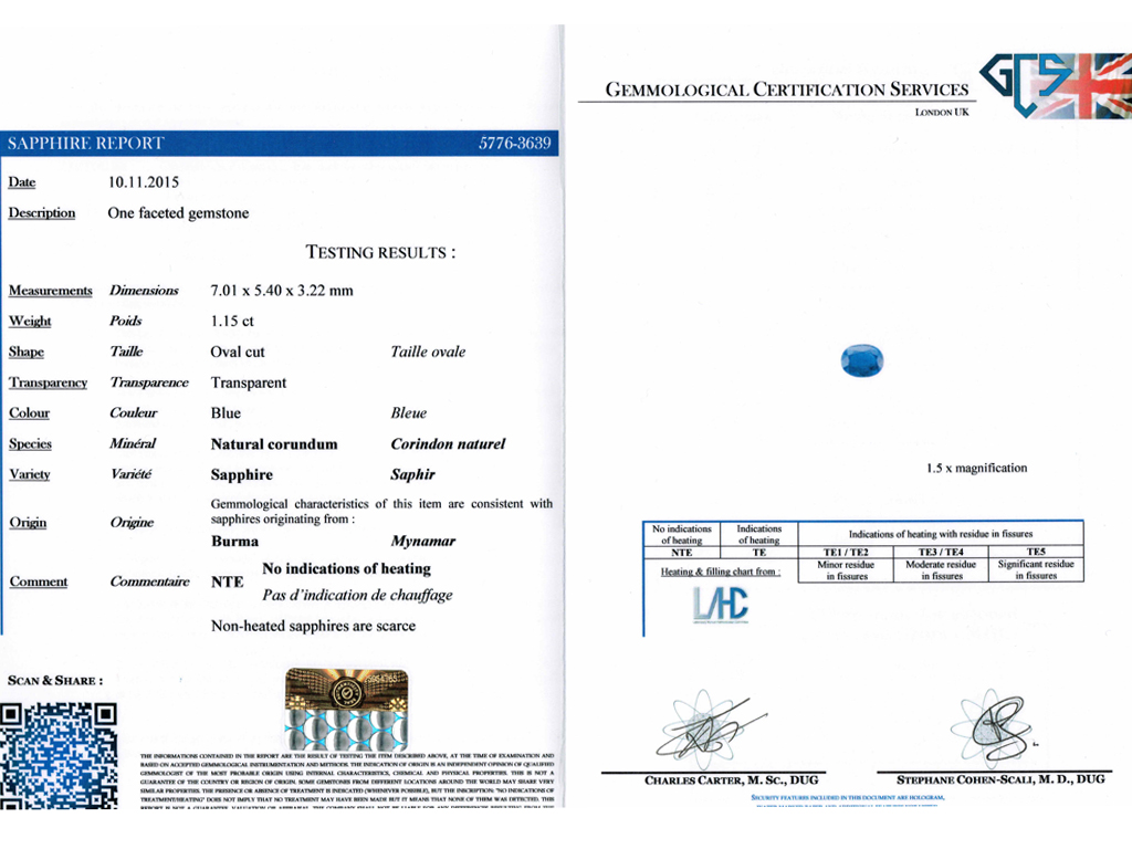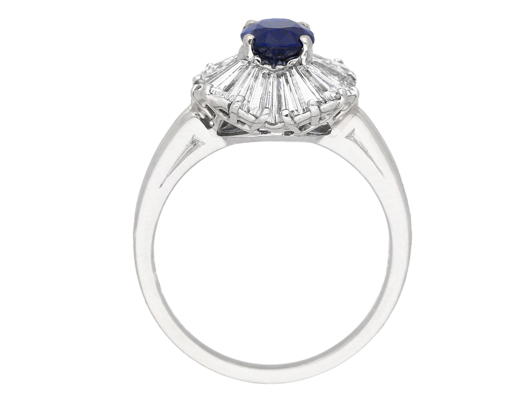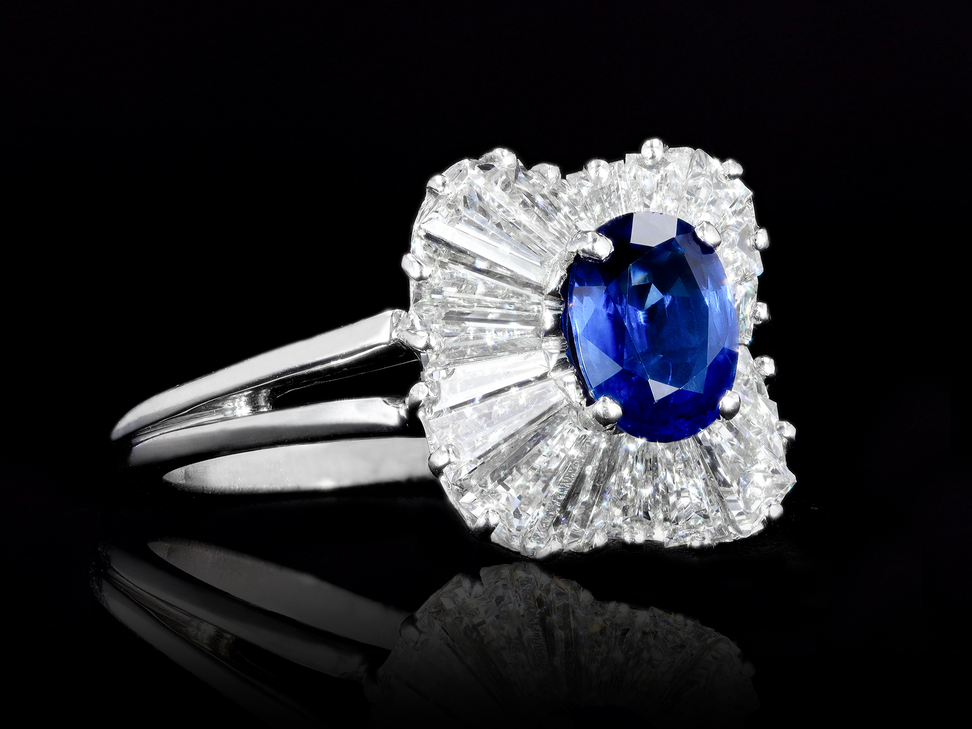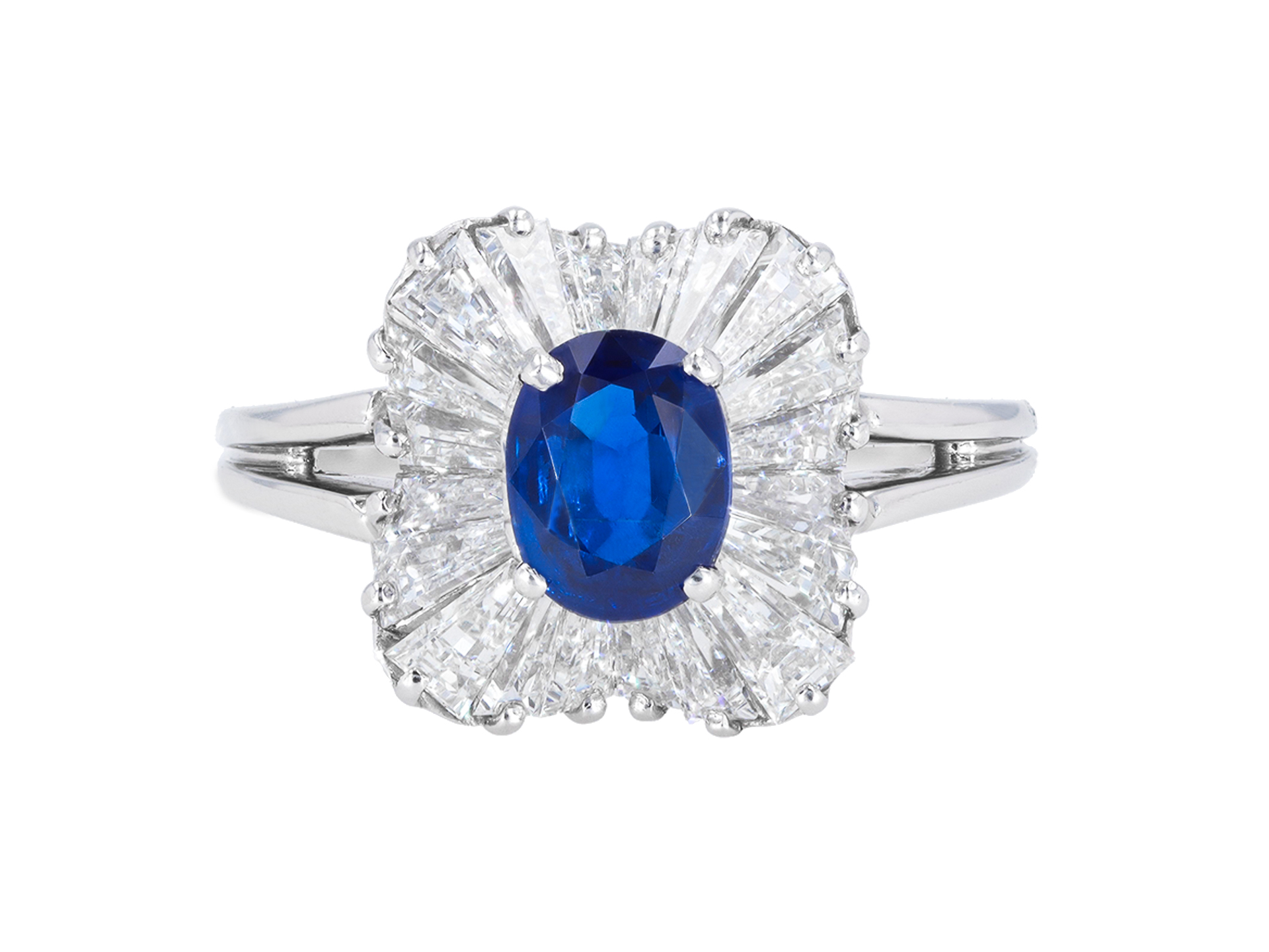 Oscar Heyman Brothers Burmese sapphire and diamond ballerina ring. Centrally set with an oval old cut natural unenhanced Burmese sapphire in an open back claw setting with a weight of 1.15 carats, encircled by an undulating row of twenty tapered baguette cut diamonds in open back claw settings with a combined approximate weight of 1.80 carats, to a ballerina cluster design, featuring curving claws, an intricately pierced gallery and fancy open backholing, flanked by raised split shoulders and flowing down to a solid D-shape tapering shank. Marked platinum and iridium, maker's mark for Oscar Heyman Brothers, numbered '19636', American, circa 1970, accompanied by Gemmological Certification Services (GCS) report #5776-3639.