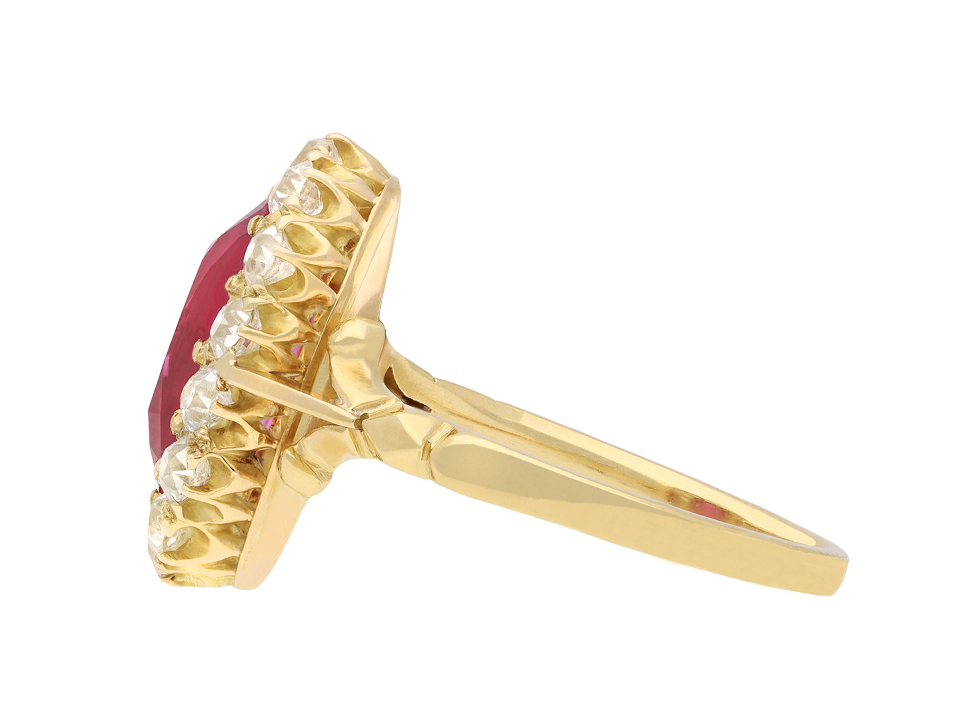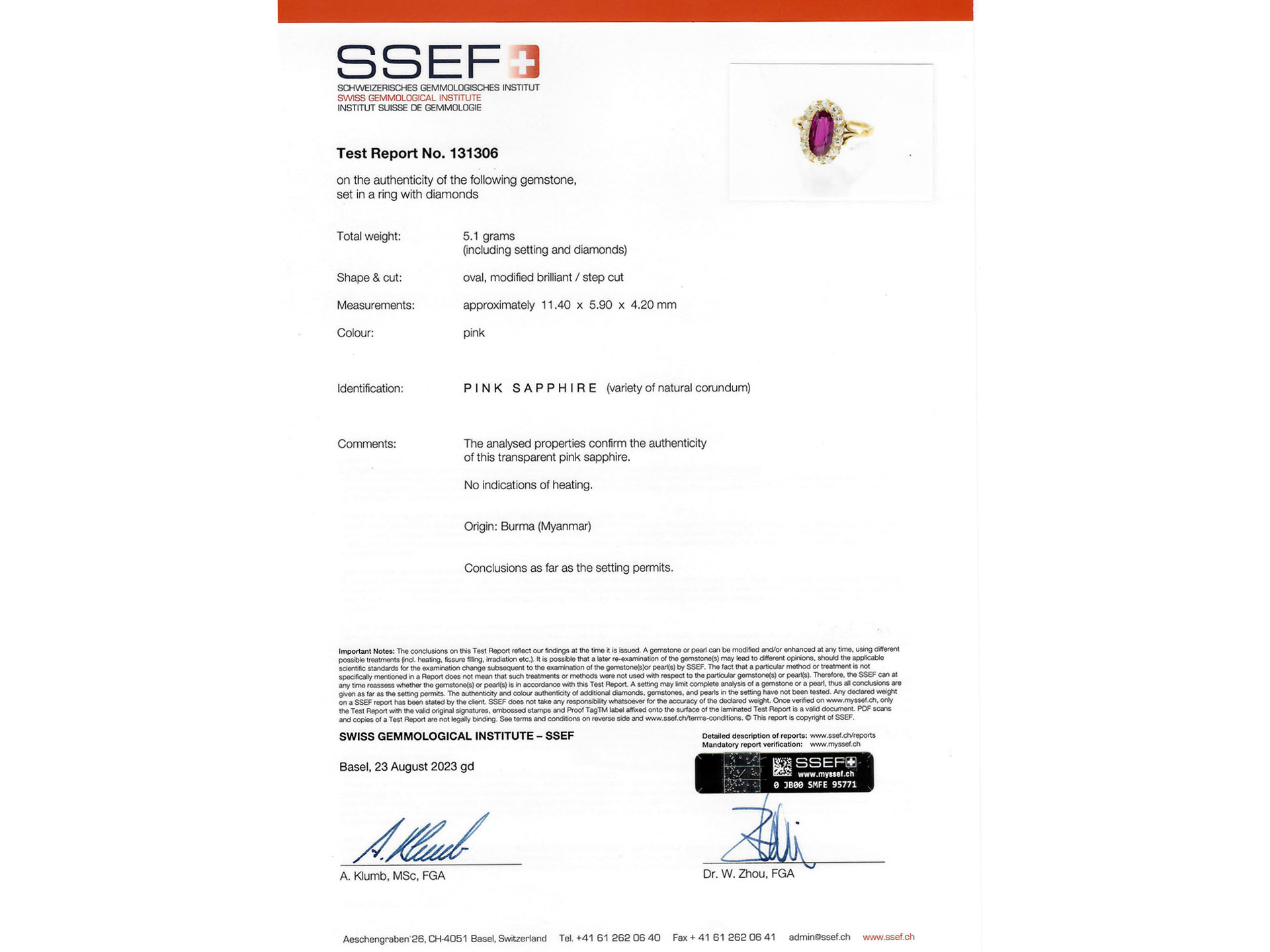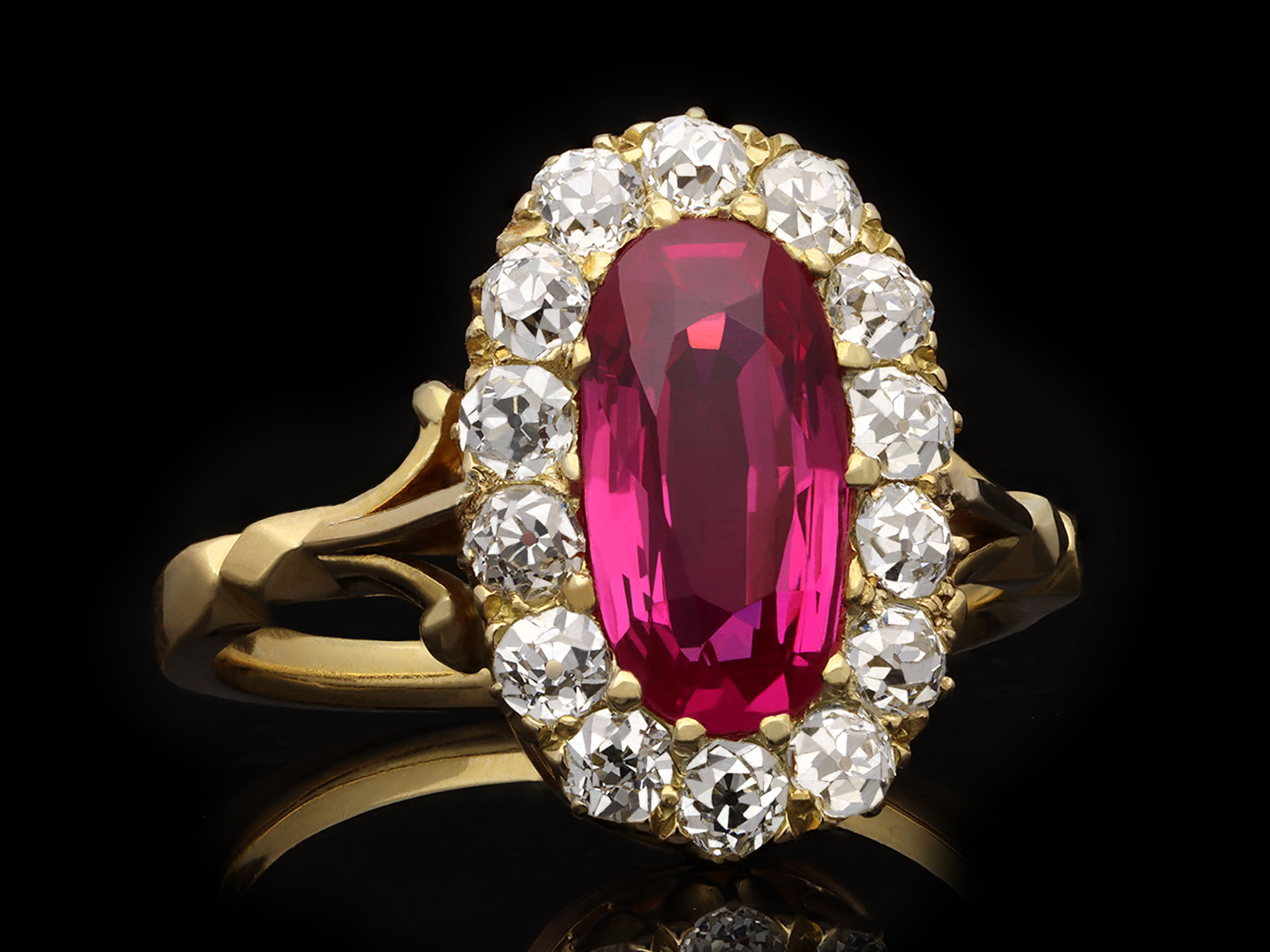 Pink Burmese sapphire and diamond ring. Set to centre with one oval old cut natural unenhanced pink Burmese sapphire in an open back grain setting with an approximate weight of 2.75 carats, encircled by a single row of fourteen cushion shape old mine diamonds in open back claw settings with an approximate total weight of 1.20 carats, to an elegant elongated coronet cluster design with curving claws, an intricately pierced gallery, and fancy open backholing, flanked by tri-split scrolling shoulders which terminate in rhombus shape metalwork detail before flowing through to a solid flat shank. Tested yellow gold, circa 1900, accompanied by Swiss Gemmological Institute (SSEF) report #131306.