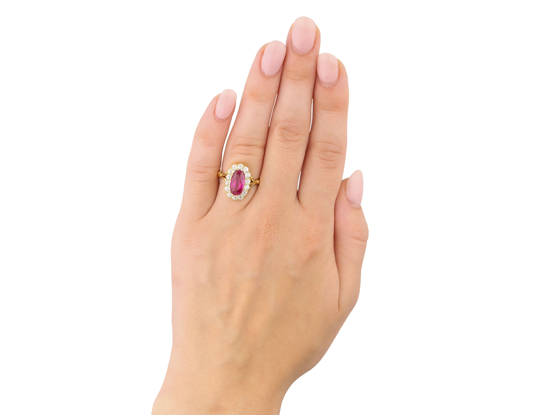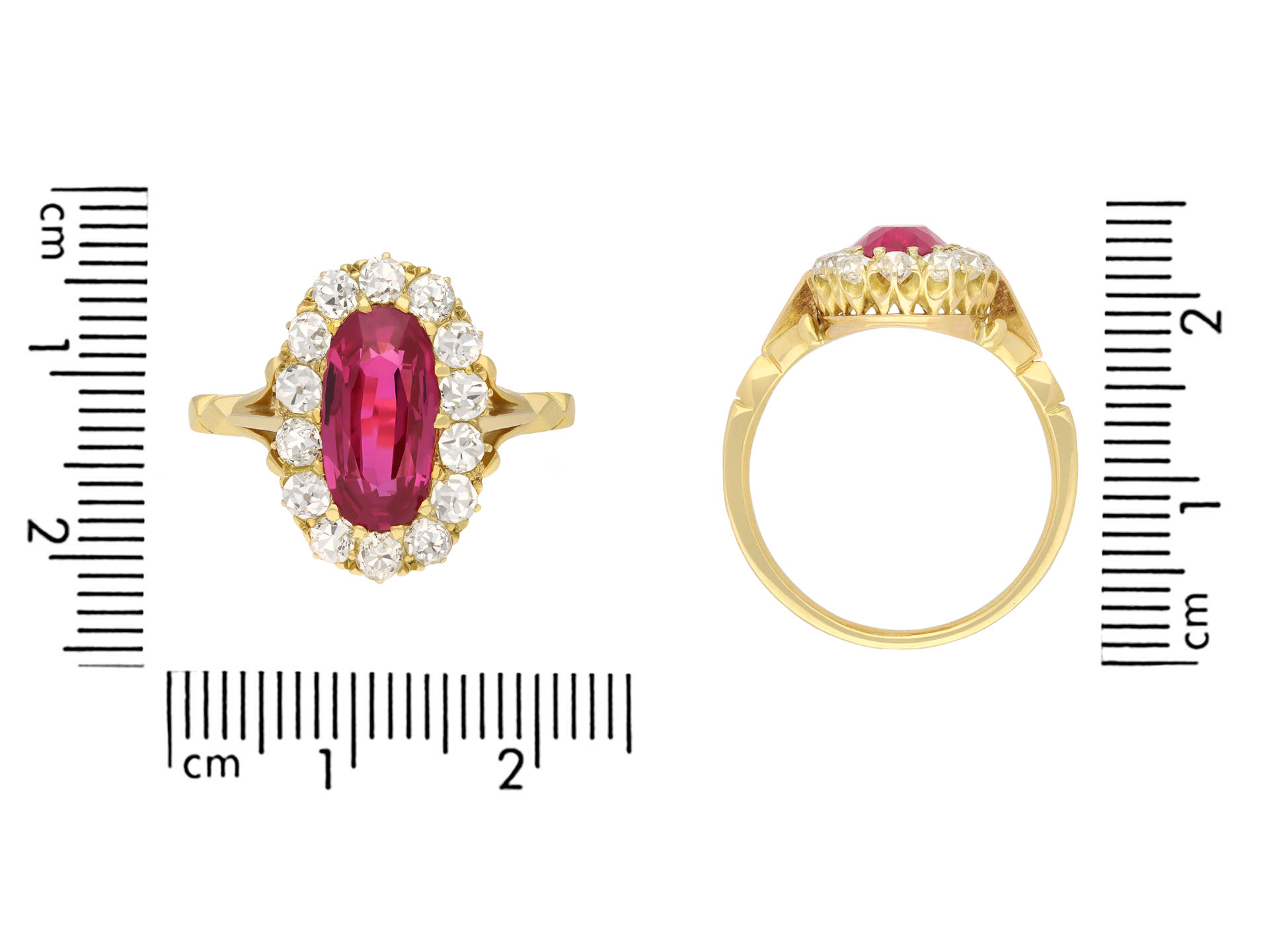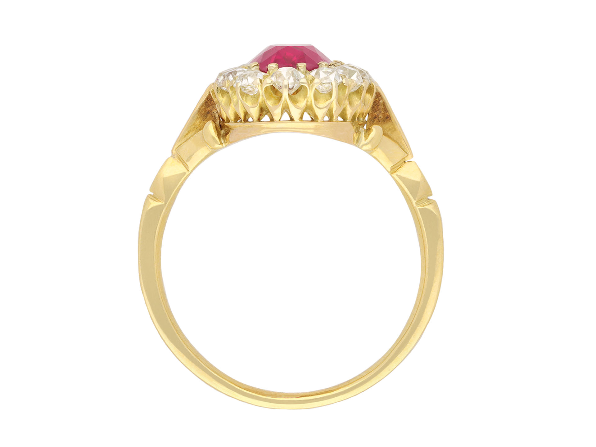 Pink Burmese sapphire and diamond ring. Set to centre with one oval old cut natural unenhanced pink Burmese sapphire in an open back grain setting with an approximate weight of 2.75 carats, encircled by a single row of fourteen cushion shape old mine diamonds in open back claw settings with an approximate total weight of 1.20 carats, to an elegant elongated coronet cluster design with curving claws, an intricately pierced gallery, and fancy open backholing, flanked by tri-split scrolling shoulders which terminate in rhombus shape metalwork detail before flowing through to a solid flat shank. Tested yellow gold, circa 1900, accompanied by Swiss Gemmological Institute (SSEF) report #131306.