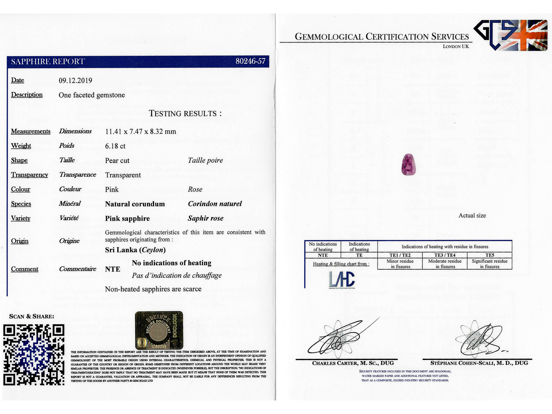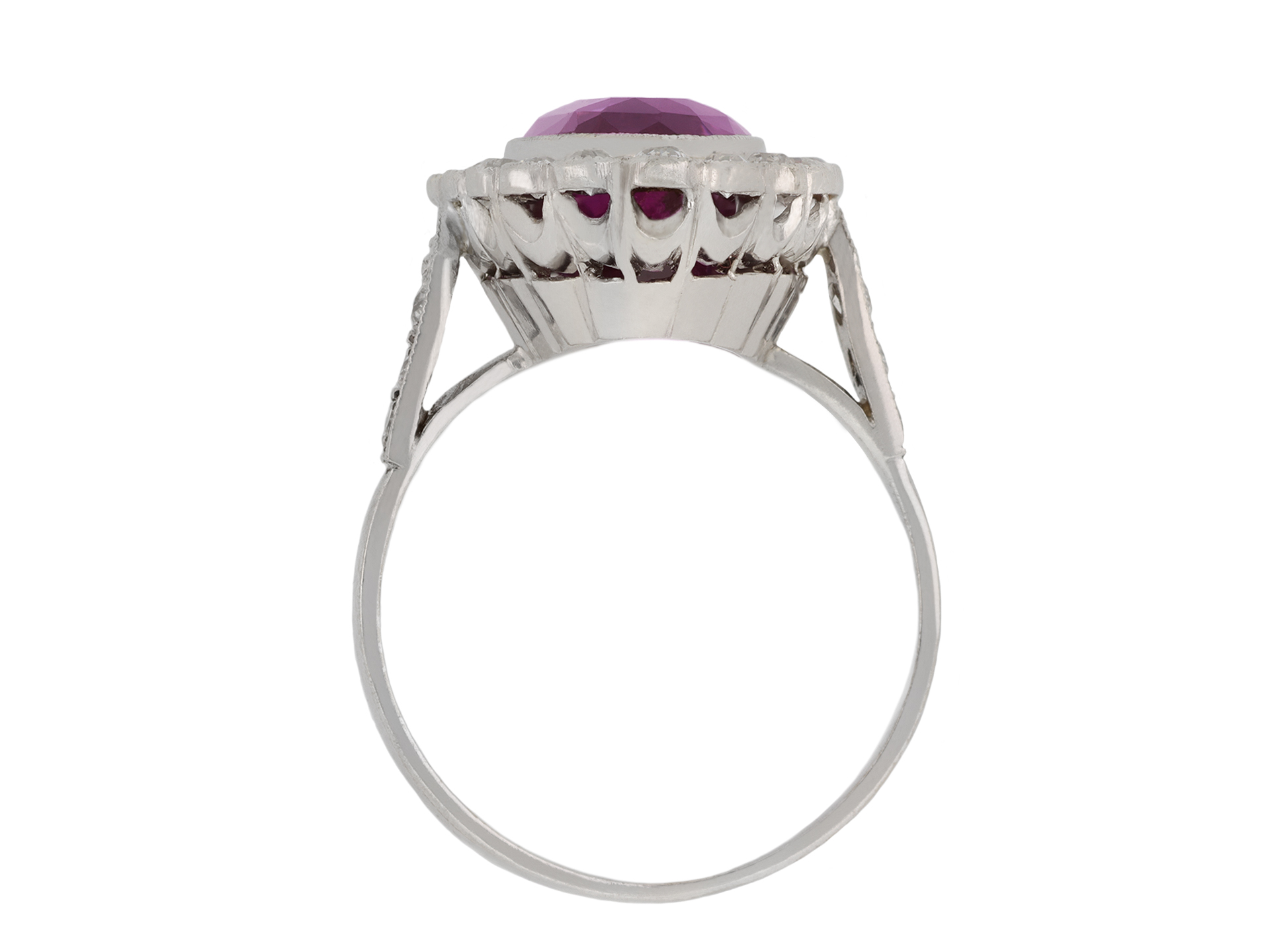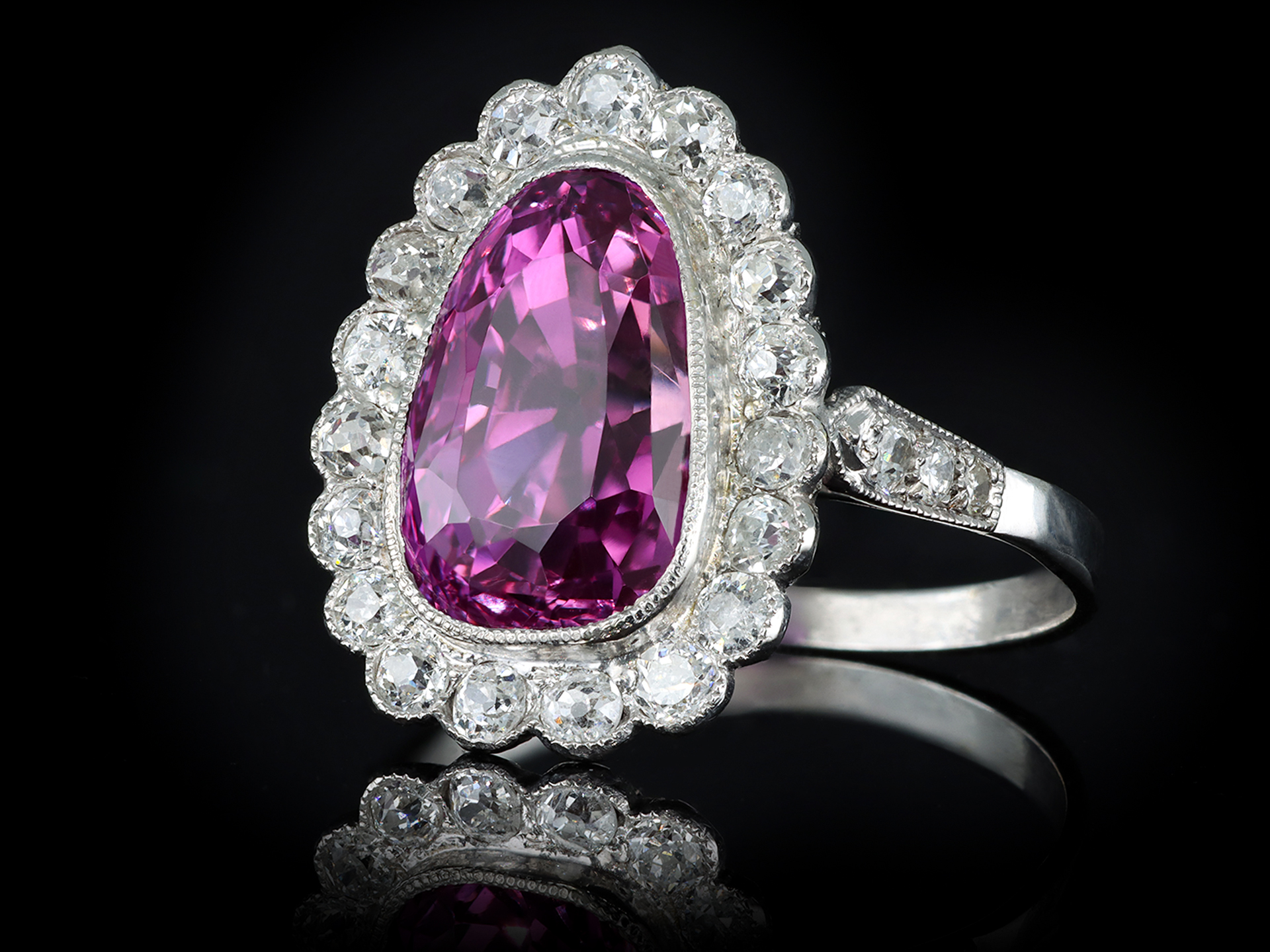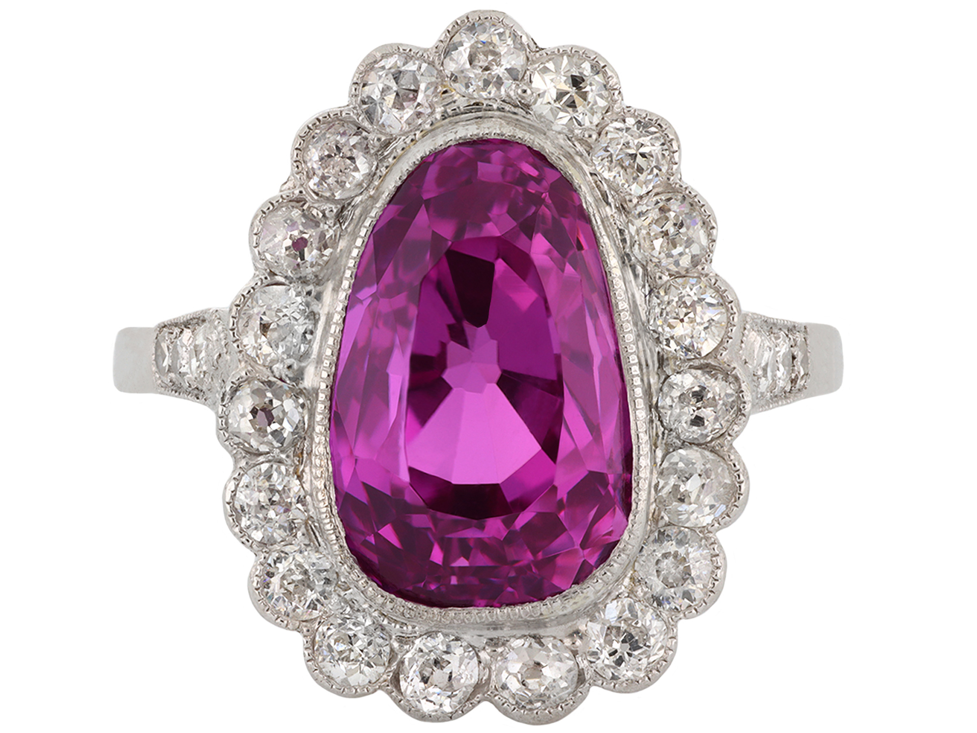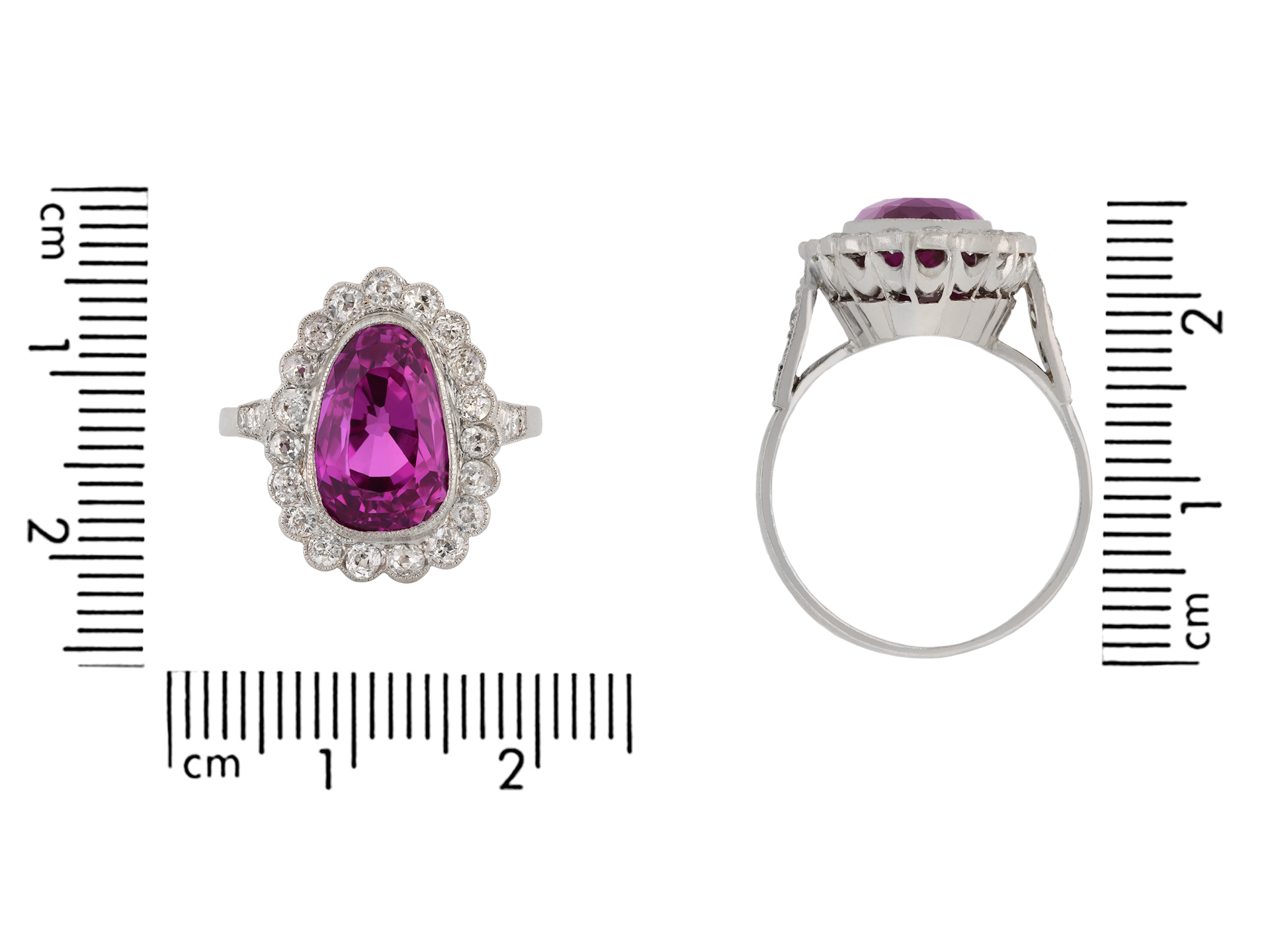 Pink Ceylon sapphire and diamond coronet cluster ring. Set to centre with a drop shape old cut natural unenhanced pink Ceylon sapphire in an open back rubover setting with a weight of 6.18 carats, further set with twenty three cushion shape old mine diamonds in open back rubover and grain settings with a combined approximate weight of 1.05 carats, enhanced with two round eight cut diamonds in open back grain settings, with a combined weight of 0.04 carats. The total approximate diamond weight is 1.09 carats, to an elegant elongated cluster design featuring millegrain edging, a decorative gallery with intricate piercing and ridged detail, and fancy shape open backholing, leading to raised shoulders and flowing through to a solid shank. Tested platinum and white gold, circa 1915, accompanied by Gemmological Certification Services report 80246-57.