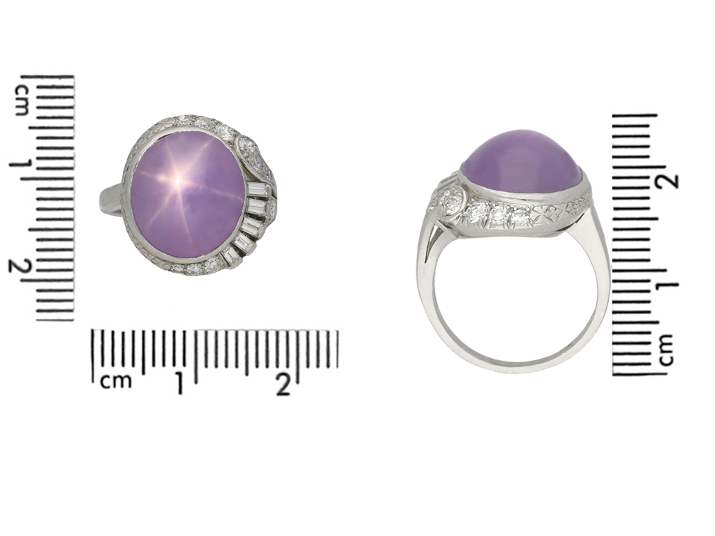 Purple star sapphire and diamond ring by J. Milhening Inc. Set to centre with an oval cabochon natural no heat purple Ceylon star sapphire in an open back rubover setting with an approximate weight of 10.50 carats, further set to one side with five rectangular baguette cut diamonds in open back half rubover settings with a combined approximate weight of 0.20 carats, further adorned with ten round old cut diamonds in open back grain settings with a combined weight of 0.35 carats. The total approximate diamond weight is 0.55 carats, to an elegant dress ring with asymmetric design featuring polished edges, engraved detailing o the gallery and open backholing, leading to trumpeting raised split shoulders and flowing through to a solid D-shape shank. Marked platinum and iridium, maker's mark for J. Milhening Inc., American, circa 1935, accompanied by Gemmological Certification Services report #78156-02.