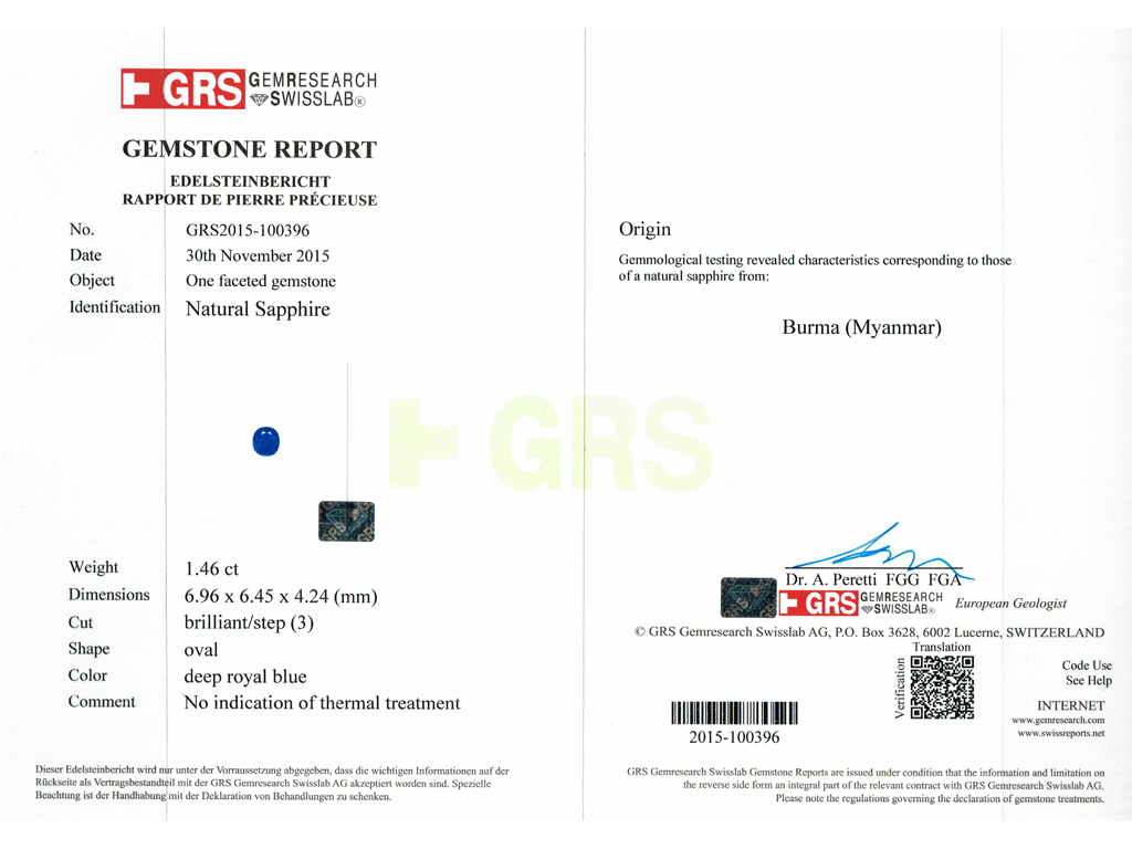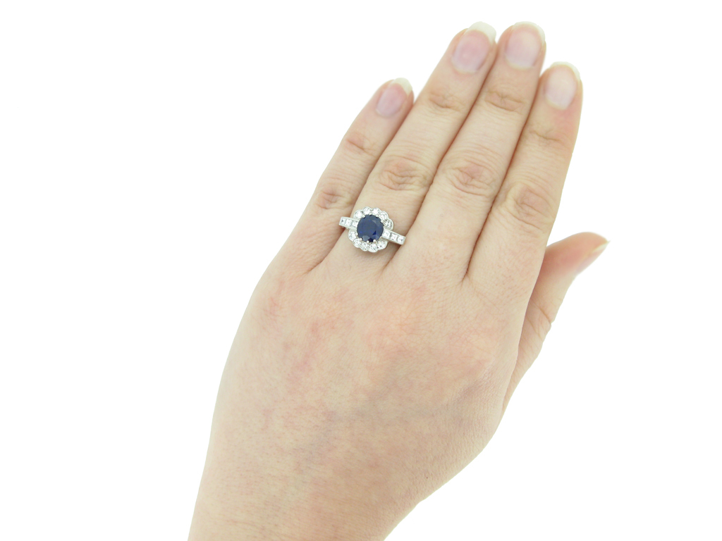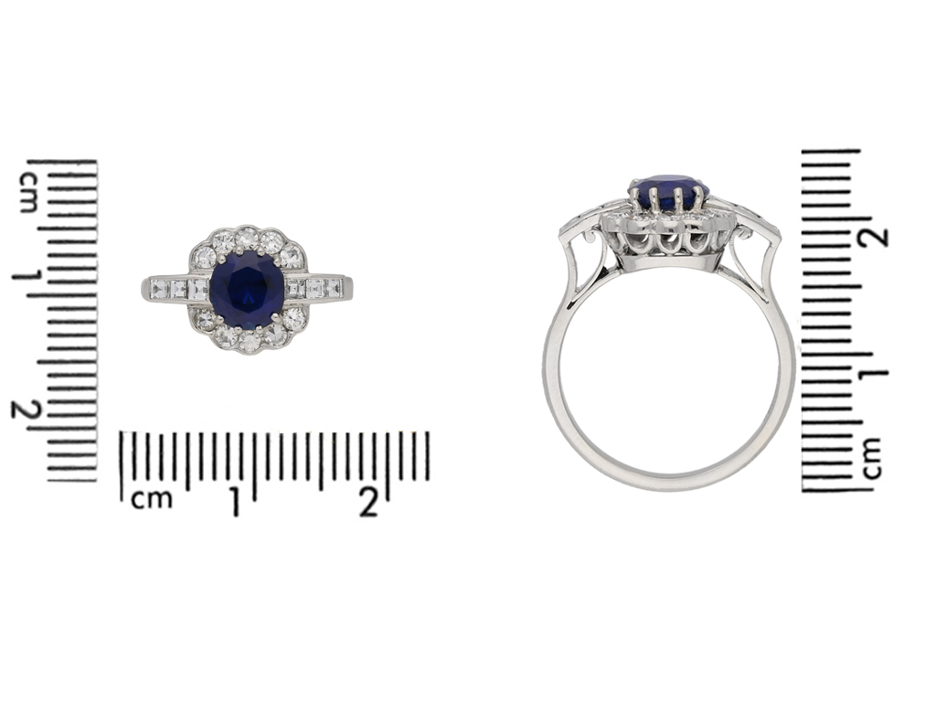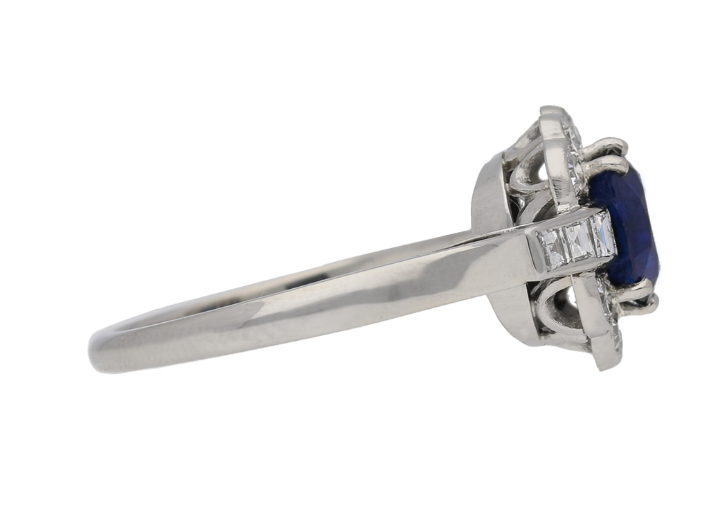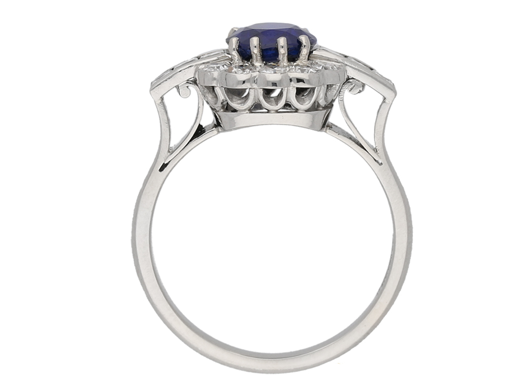 Royal Blue Burmese sapphire and diamond ring. Set to centre with one cushion shape old cut natural no heat royal blue Burmese sapphire in an open back claw setting with an approximate weight of 1.46 carats, surrounded by ten round eight cut diamonds in open back grain and rubover settings with a combined approximate weight of 0.30 carats, further enhanced with six square baguette cut diamonds in open back channel settings with a combined weight of 0.20 carats. The total approximate diamond weight is 0.50 carats, to an oval cluster design with scalloped edging, an elegantly pierced gallery and fancy open backholing, flanked by raised diamond set shoulders with scrolling open work detail, smoothing down to a solid D-shape shank. Marked platinum, circa 1935, accompanied by Gem Research SwissLab (GRS) report #2015-100396.