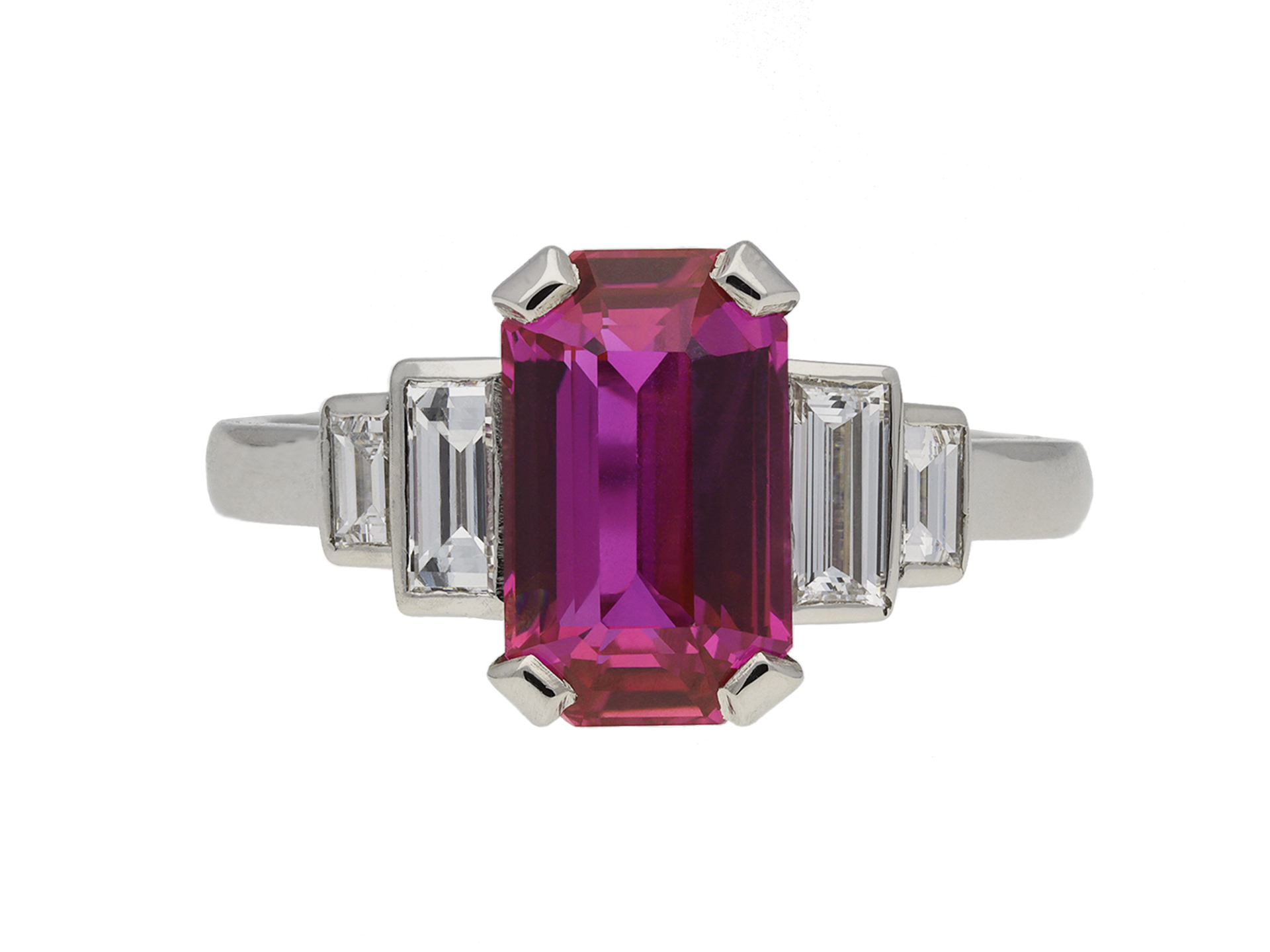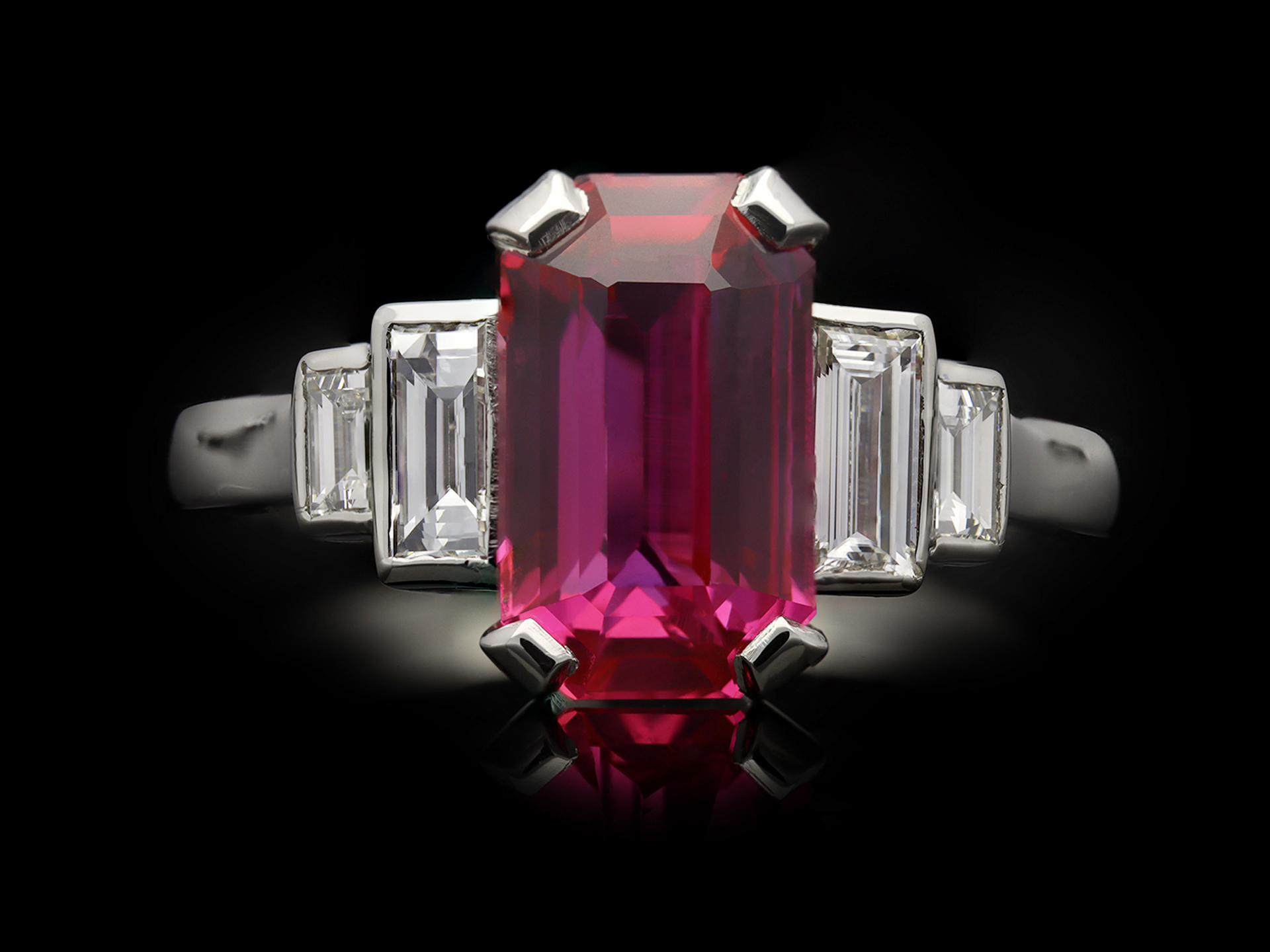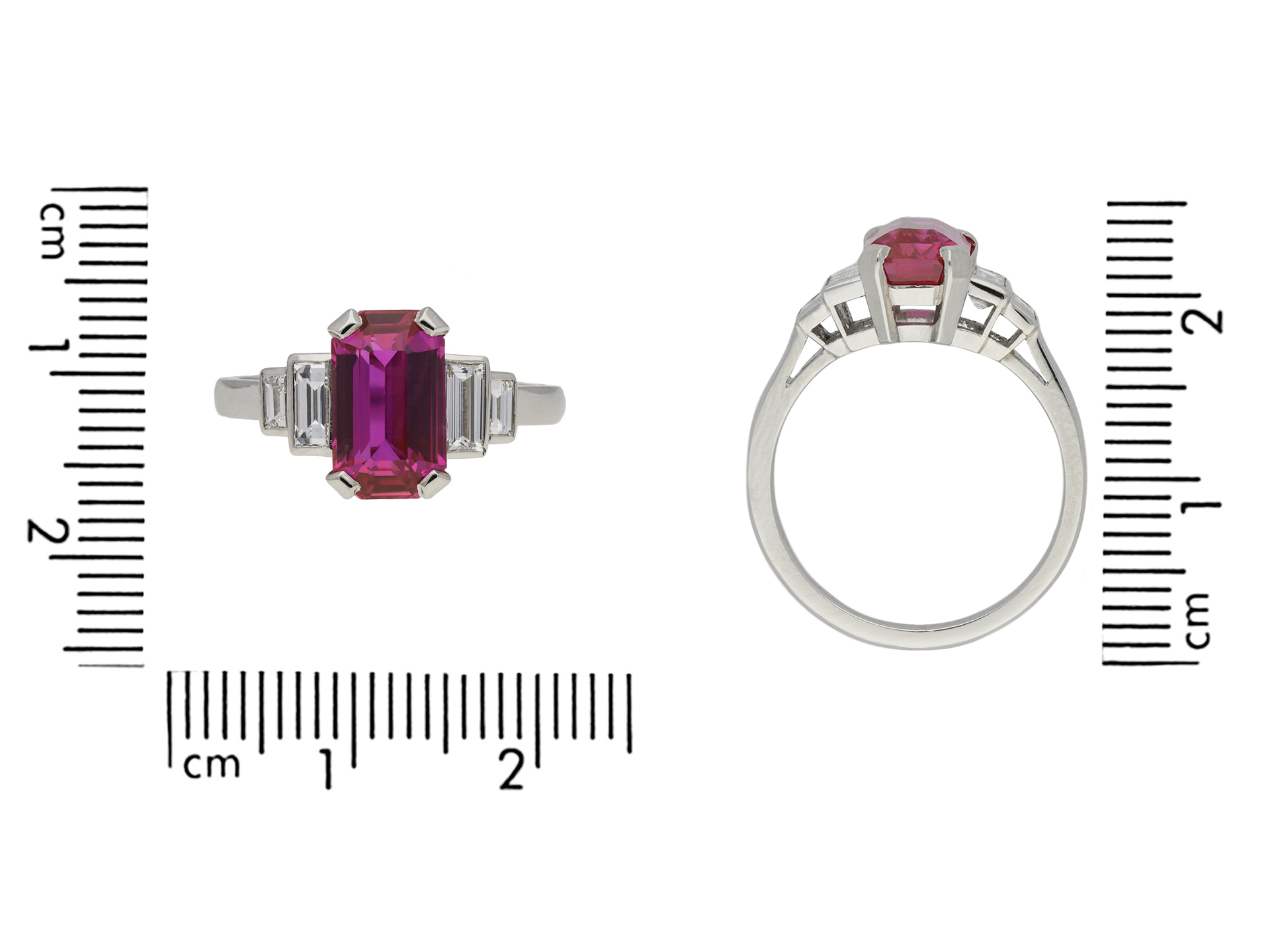 Gemstone Mozambique Unheated Ruby, Emerald Cut, approximately 2.6ct 4 x Diamonds, Baguette Cut, approximately 0.5ct total