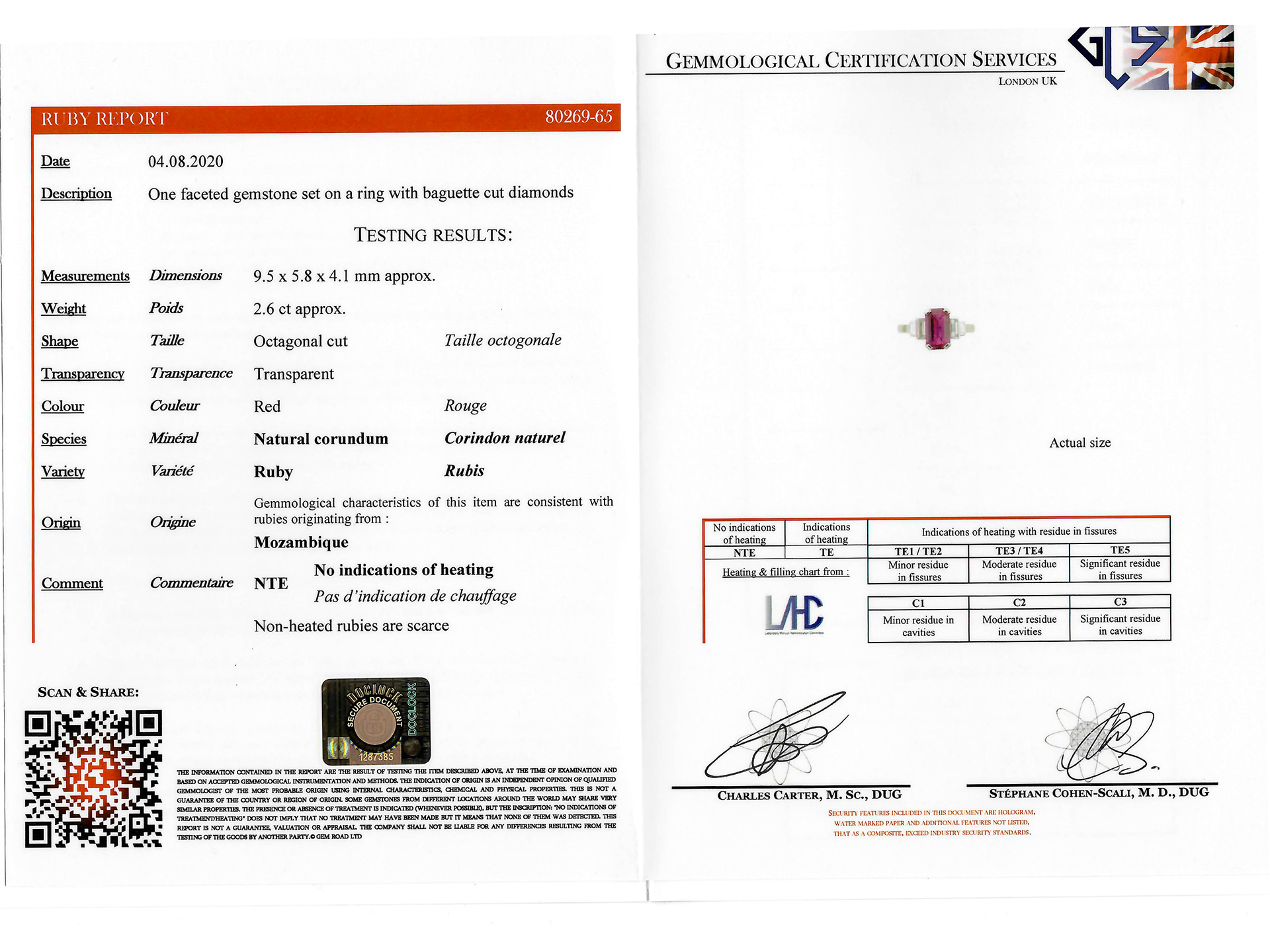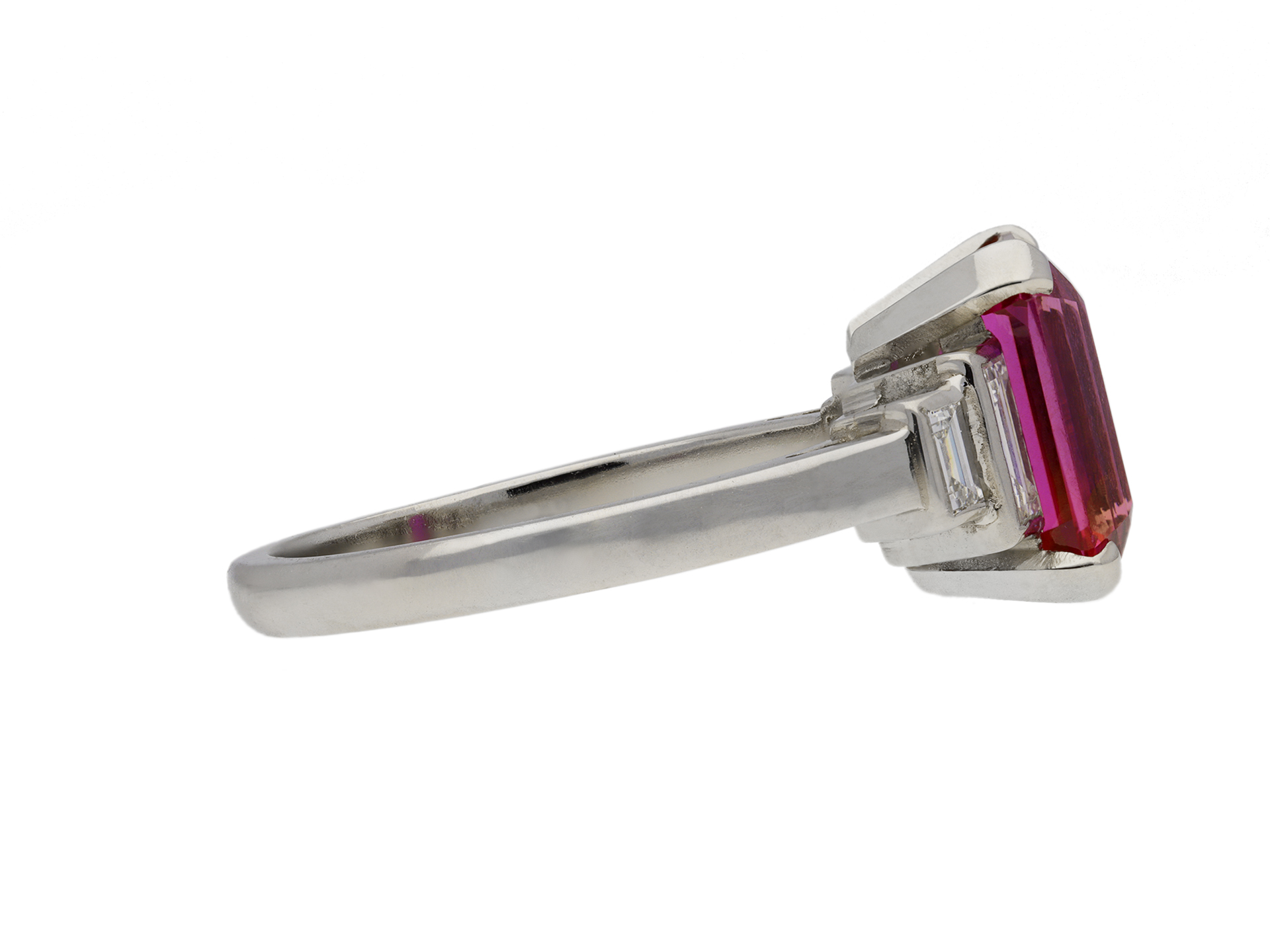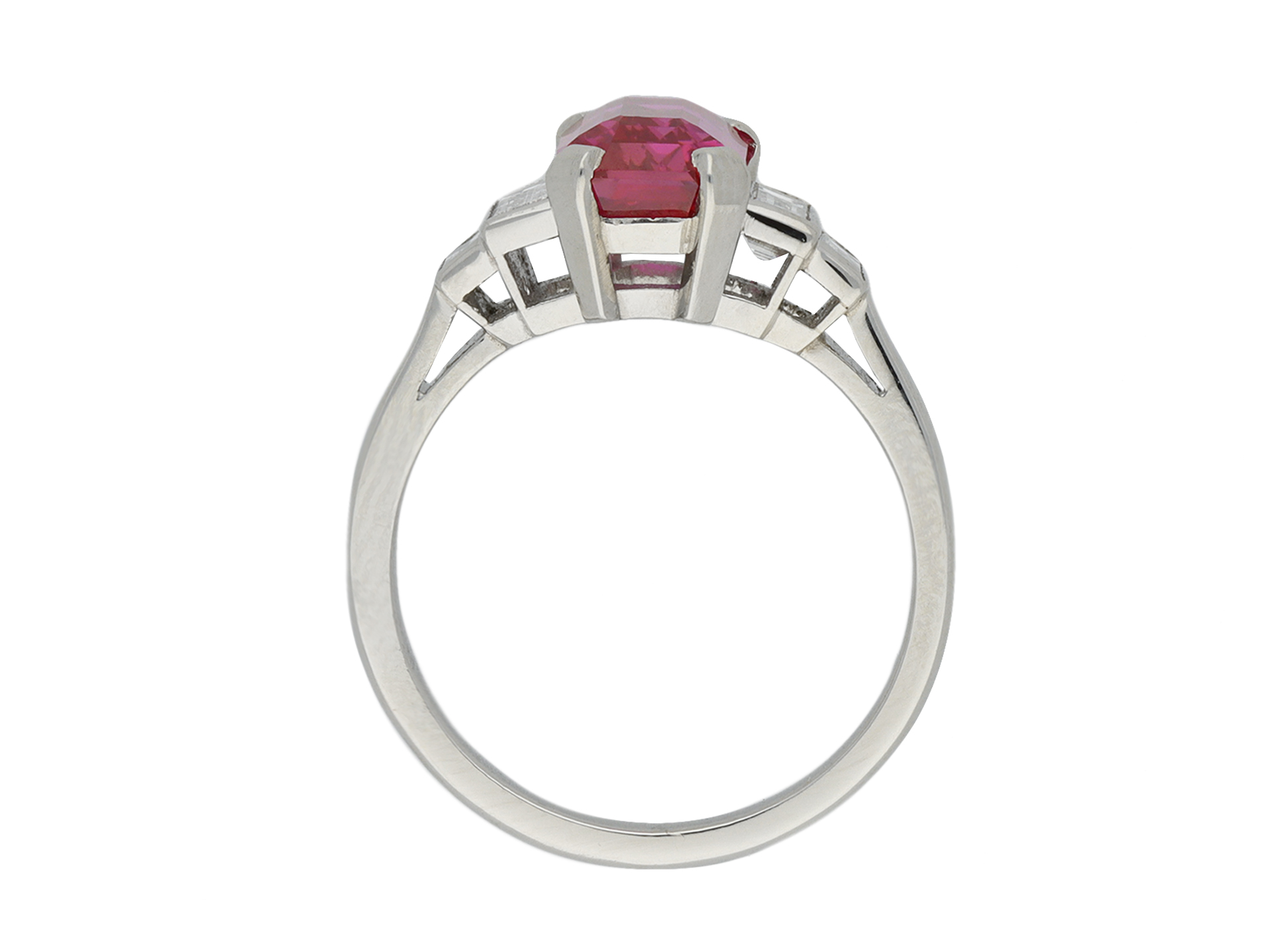 Ruby and diamond flanked solitaire ring. Set to centre with an octagonal emerald-cut natural unenhanced Mozambique ruby in an open back claw setting with an approximate weight of 2.60 carats, flanked by four rectangular baguette cut diamonds in open back rubover settings with an approximate combined weight of 0.50 carats, all to a geometric flanked solitaire design featuring polished edges, an open structural gallery and open backholing, leading to smooth shoulders and flowing through to a solid shank. Hallmarked platinum, English, 2020, accompanied by Gemmological Certification Services report #80269-65.