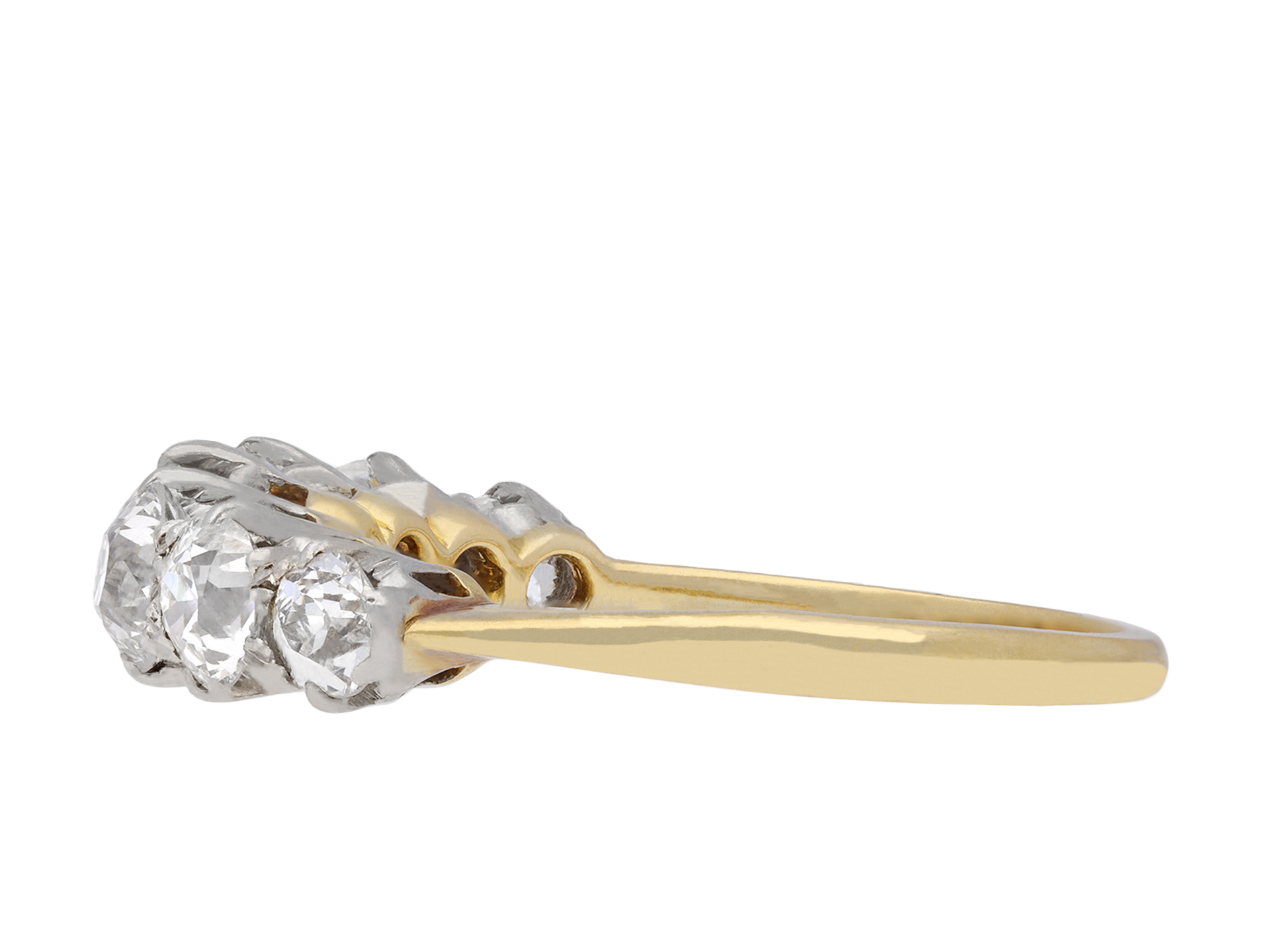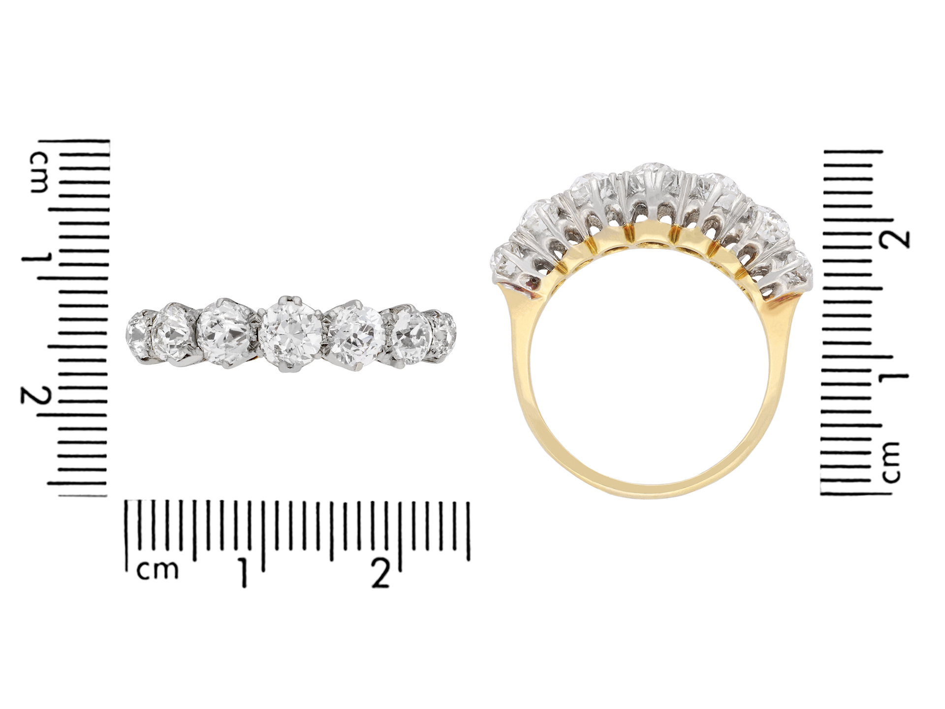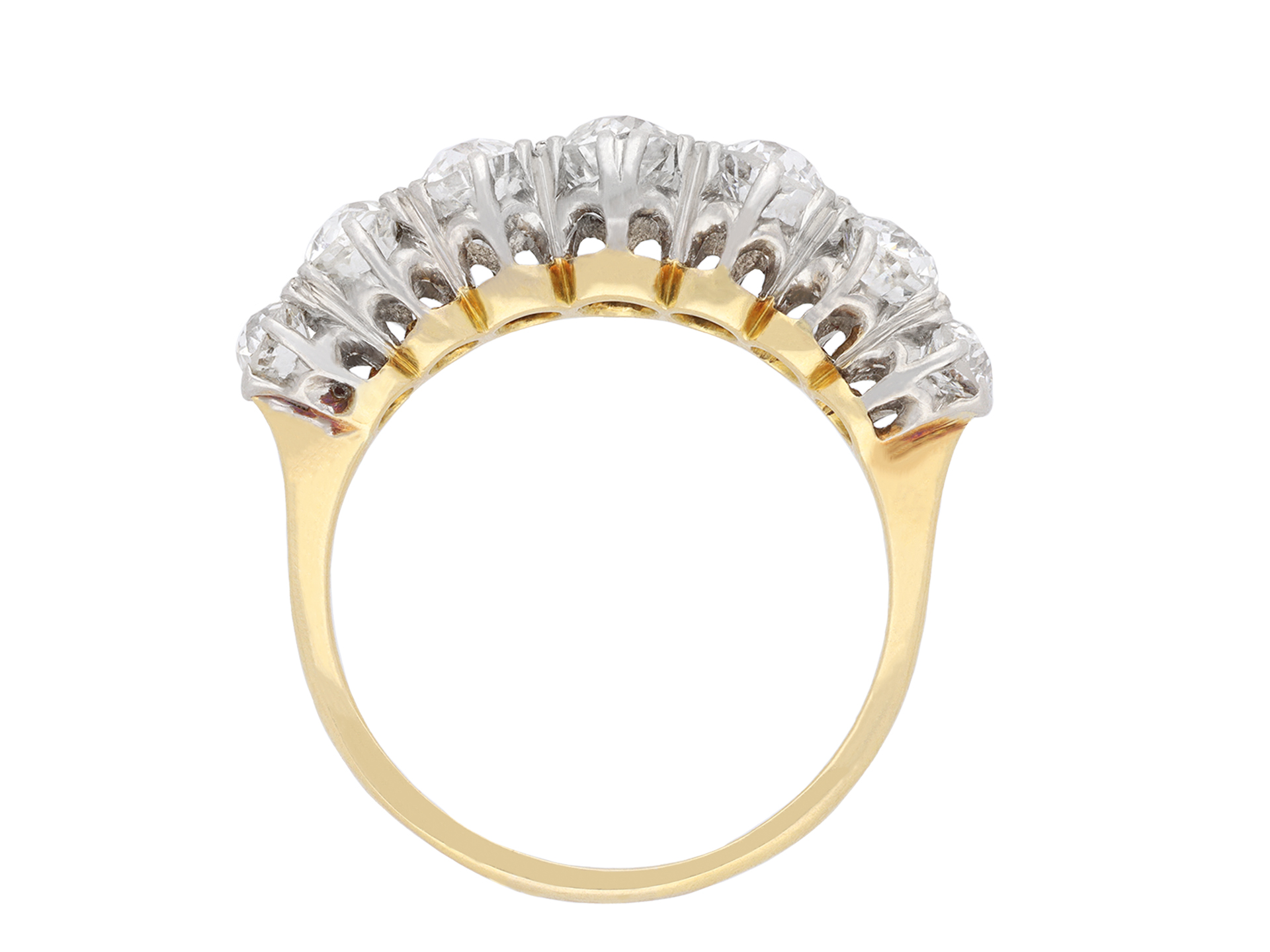 S Blanckensee & Son Ltd diamond seven stone ring. Horizontally set with seven round old cut diamonds in open back claw settings with a combined approximate weight of 2.50 carats, to an elegant seven stone design featuring curving claws, a carved gallery and fancy open backholing, leading to inwardly tapering shoulders and flowing through to a solid D-shape shank. Makers mark 'S.B & S' for S. Blanckensee & Son marked, marked 'G', indistinct hallmarks, tested yellow gold and platinum, English, circa 1910.