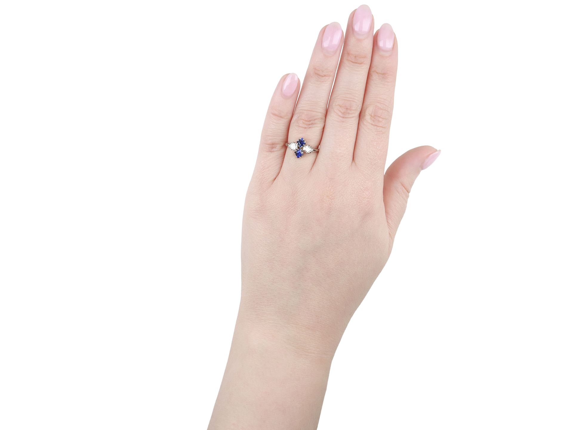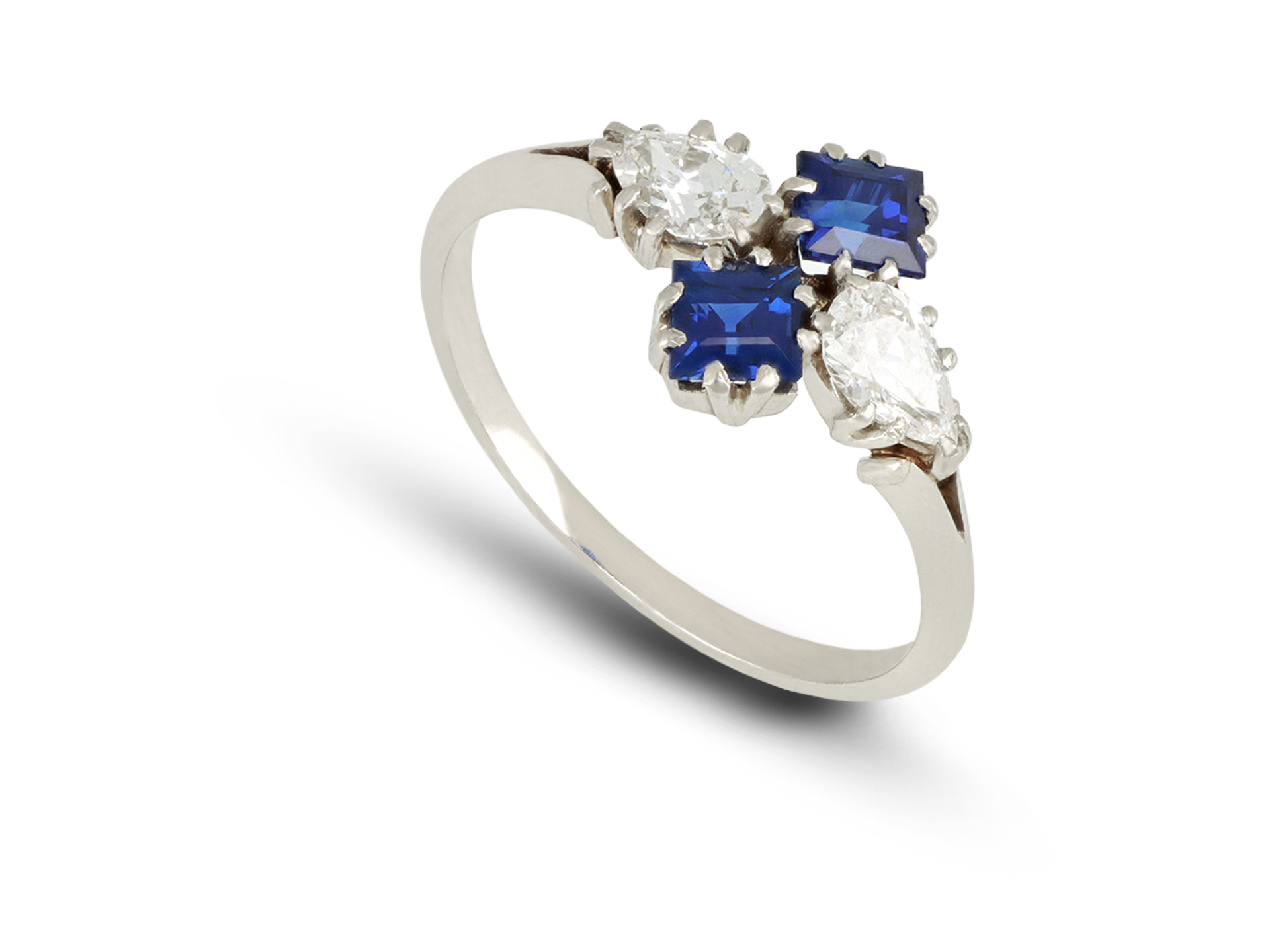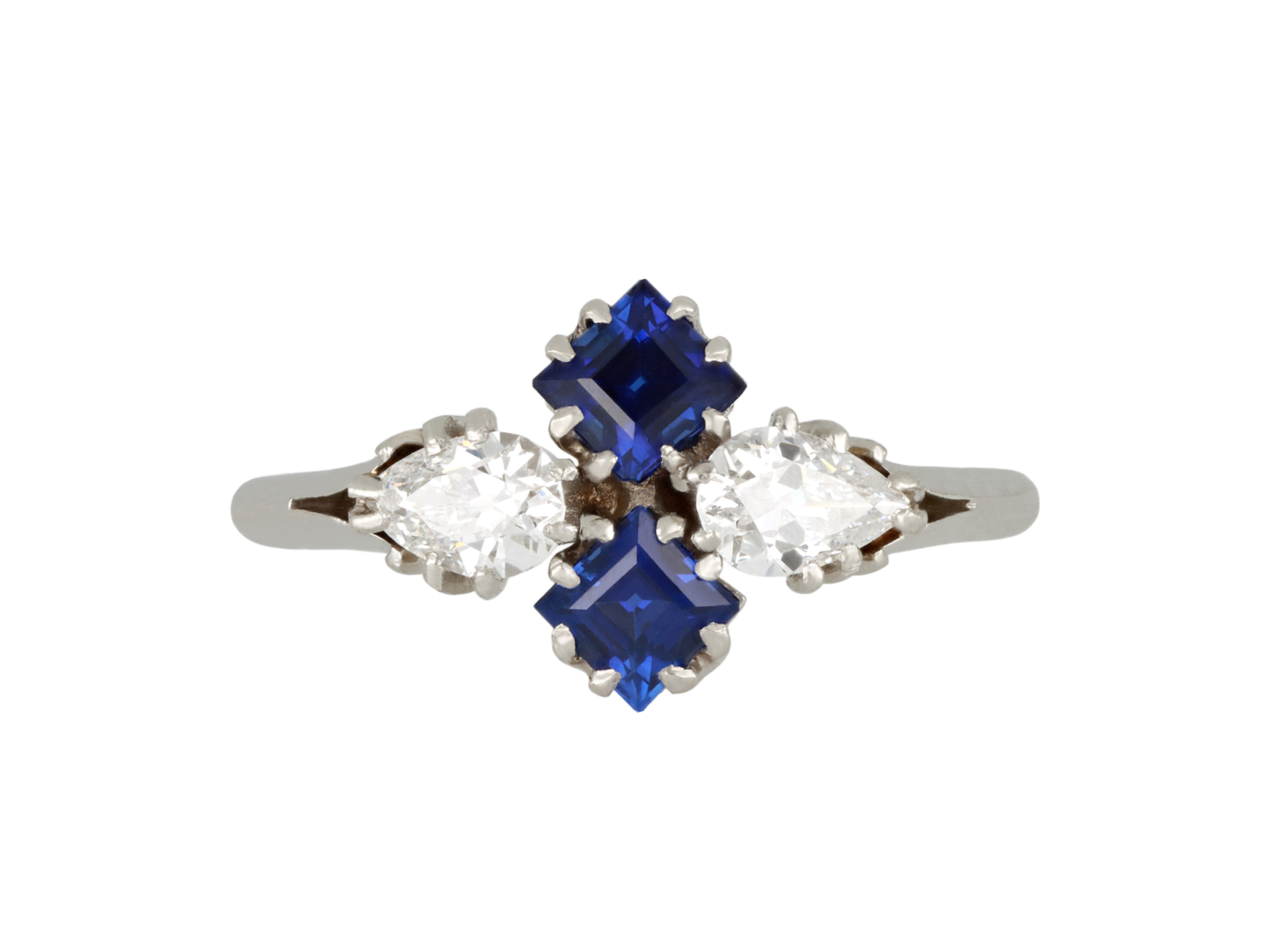 Sapphire and diamond cluster ring. Set with two square step cut natural no heat sapphires in open back claw settings with a combined approximate weight of 0.70 carats, flanked by two drop shape old cut diamonds in open back claw settings with a combined approximate weight of 0.40 carats, to a unique cluster design featuring curving double claws, a pierced gallery and fancy open backholing, the split scrolling shoulders leading through to a solid slim D-shape shank. Tested platinum, circa 1930.