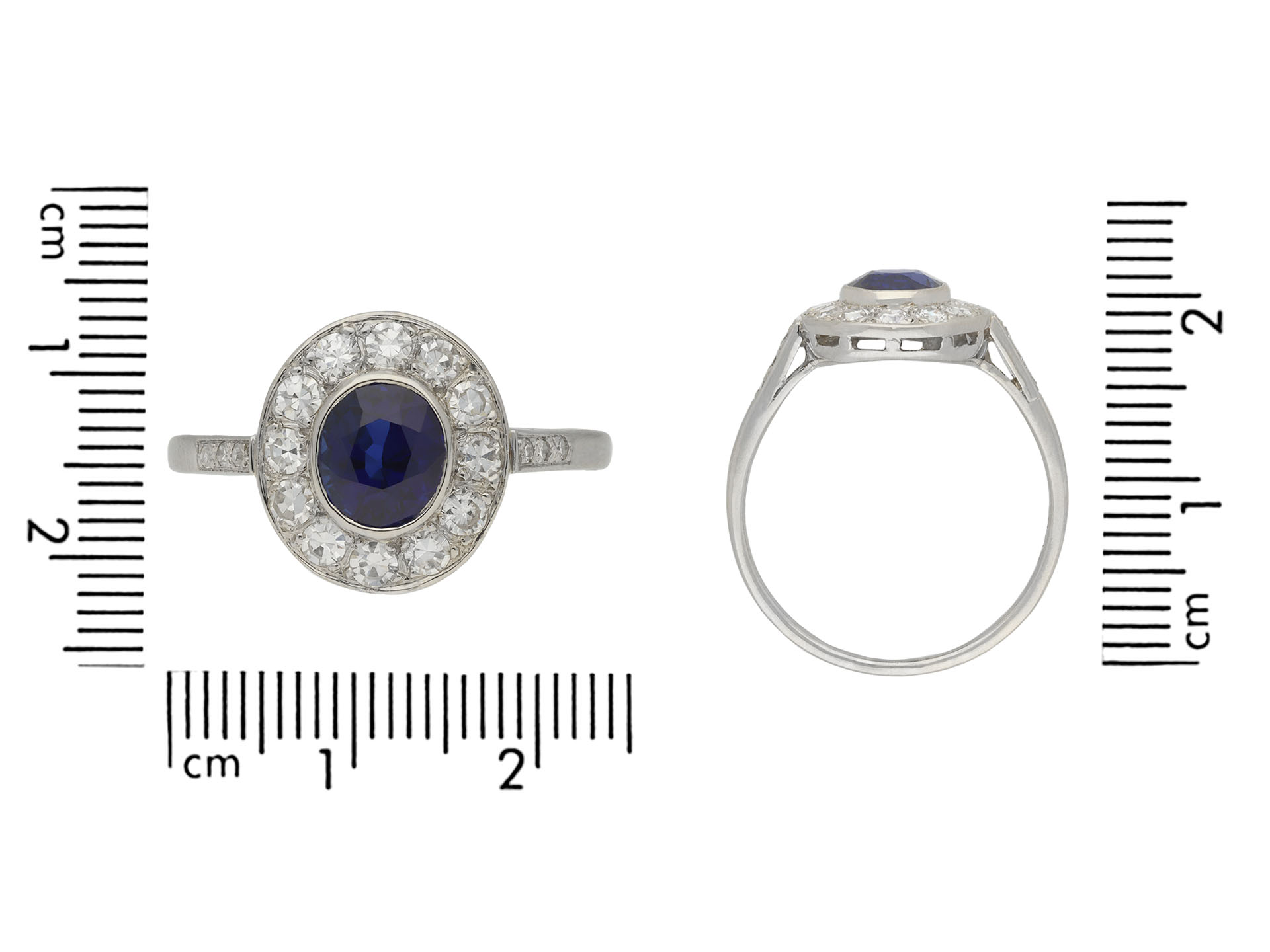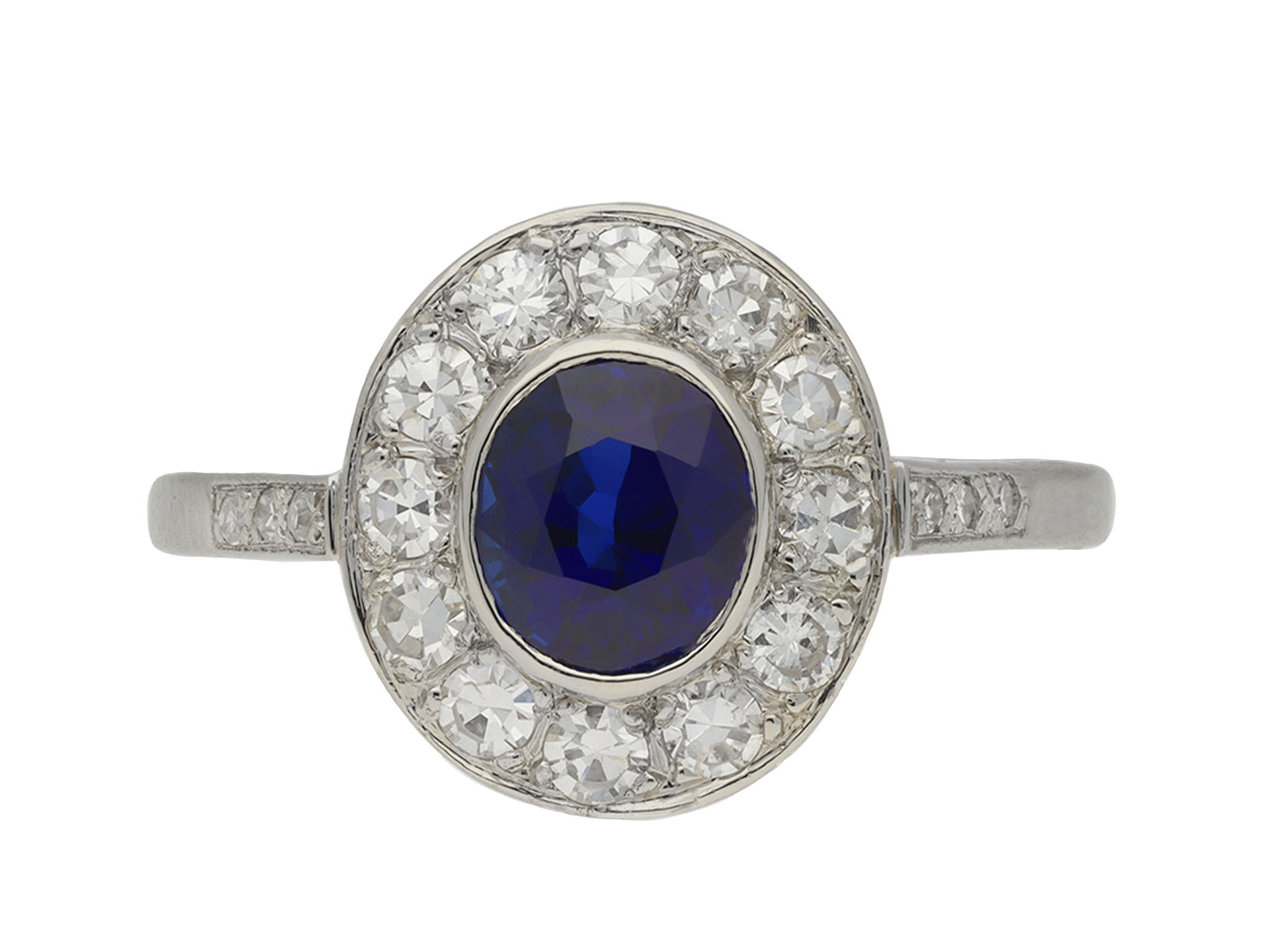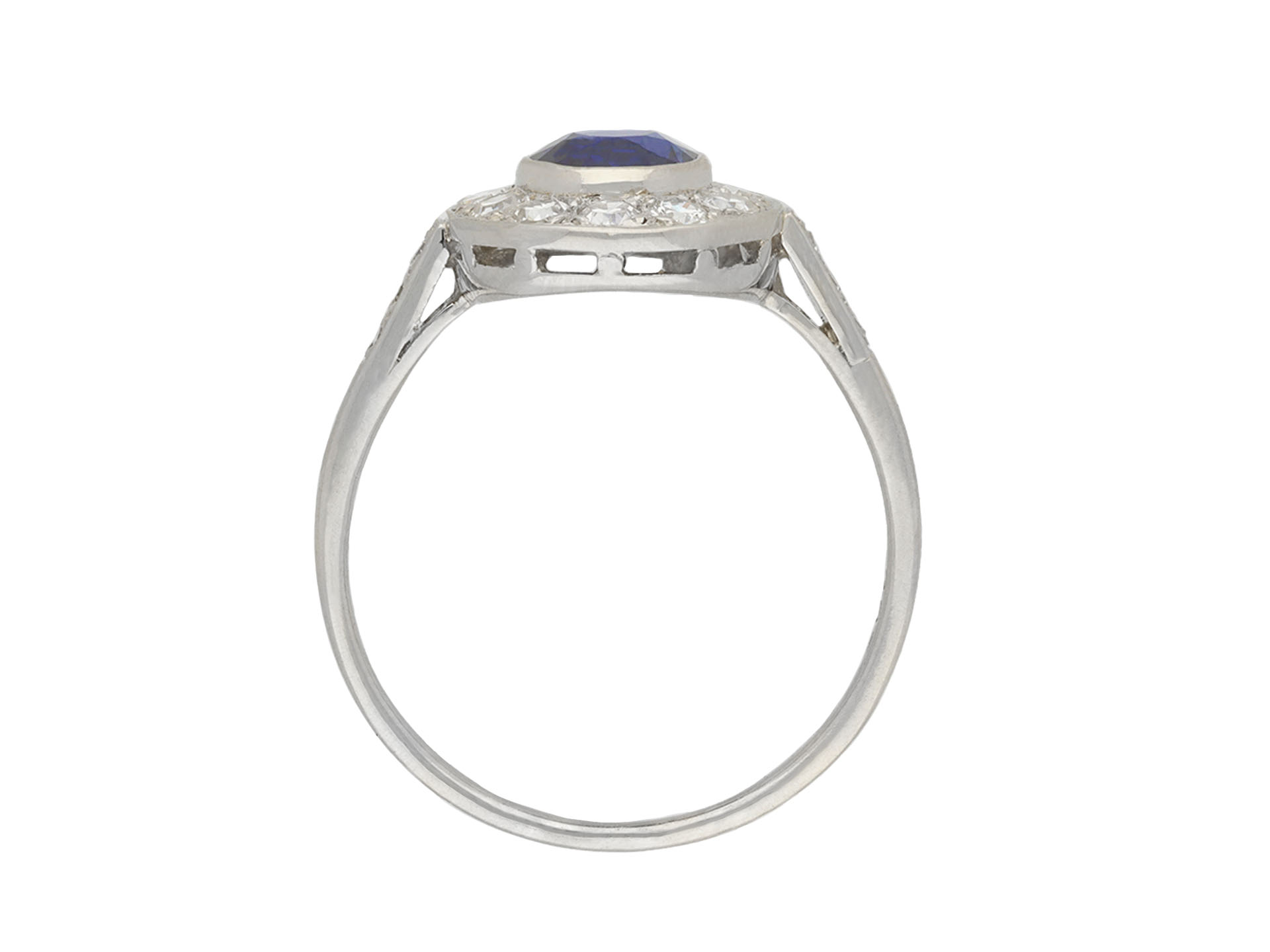 Sapphire and diamond cluster ring. Set to centre with a cushion shape old cut natural unenhanced sapphire in an open back rubover setting with an approximate weight of 1.20 carats, encircled by twelve round eight cut diamonds in open back grain settings with an approximate combined weight of 0.40 carats, further flanked by six round eight cut diamonds in open back grain settings with a combined weight of 0.10 carats. The total approximate diamond weight is 0.50 carats, to an elegant oval coronet cluster design featuring polished borders, an intricately pierced gallery and open shaped backholing, leading to slightly raised shoulders and flowing through to a smooth solid shank. Tested platinum, numbered '205', circa 1920, accompanied by Gemmological Certification Services (GCS) report #5782-1255.