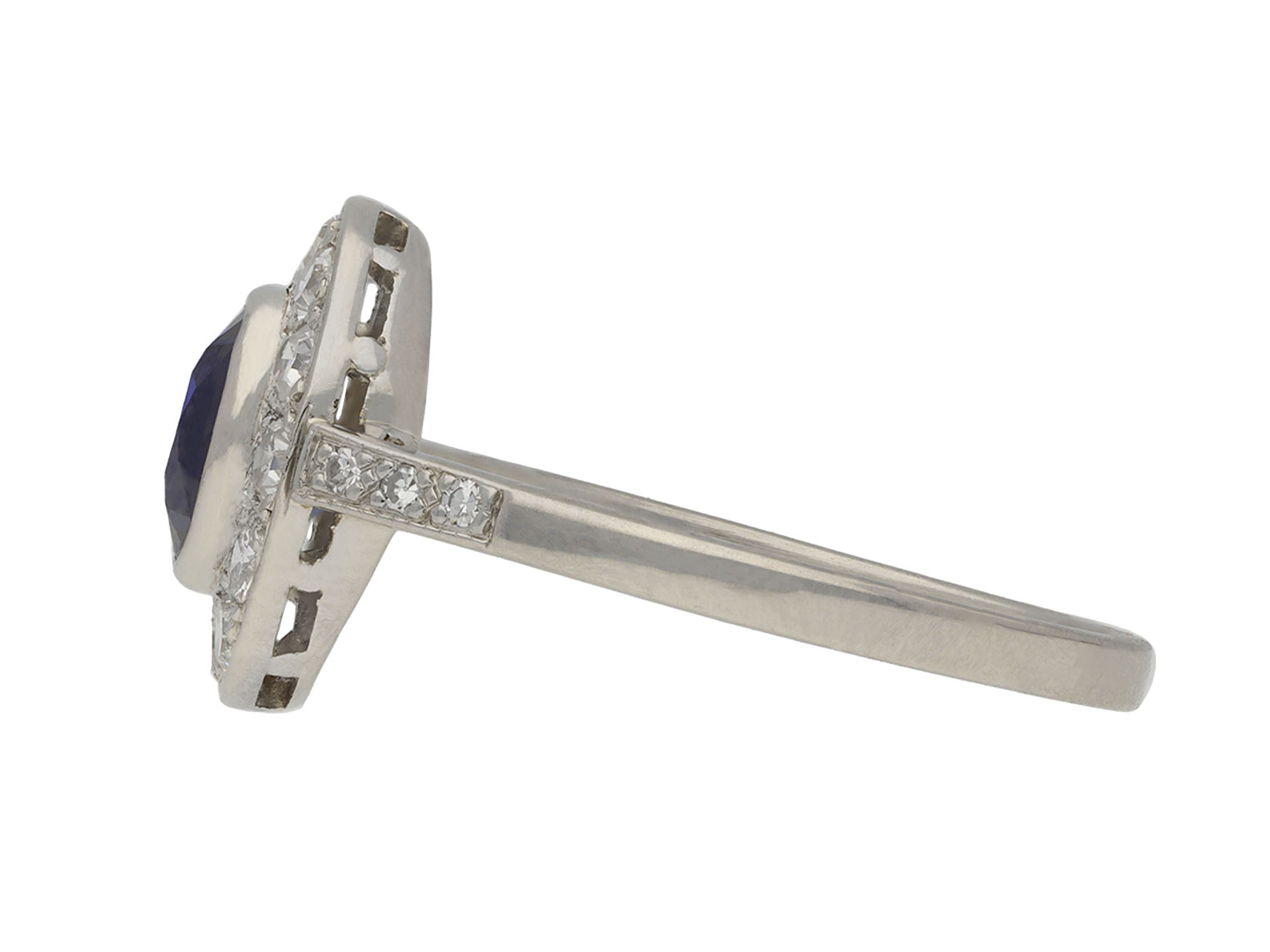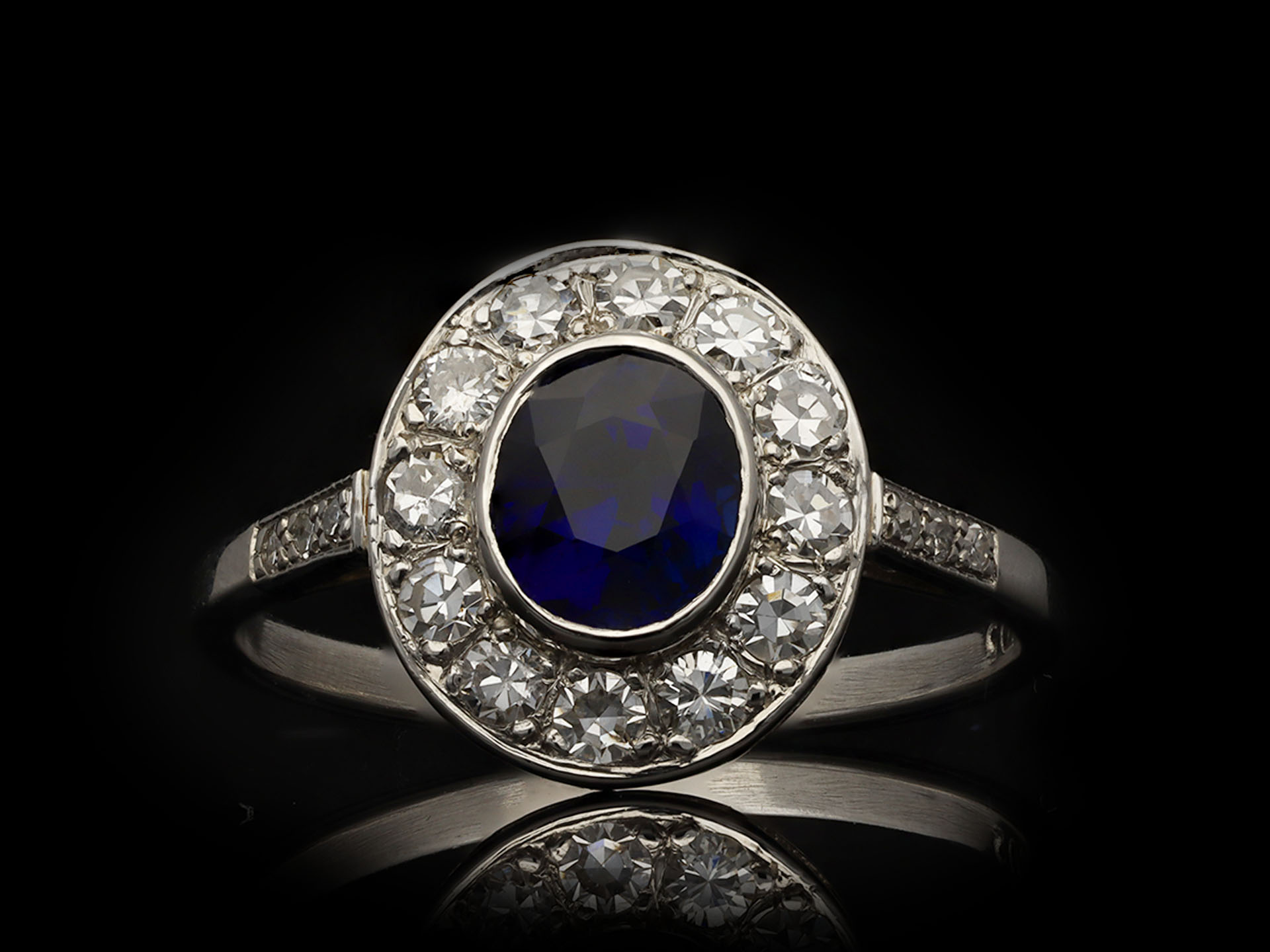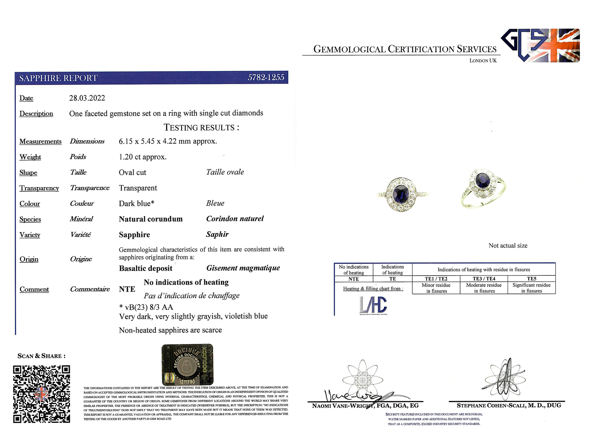Sapphire and diamond cluster ring. Set to centre with a cushion shape old cut natural unenhanced sapphire in an open back rubover setting with an approximate weight of 1.20 carats, encircled by twelve round eight cut diamonds in open back grain settings with an approximate combined weight of 0.40 carats, further flanked by six round eight cut diamonds in open back grain settings with a combined weight of 0.10 carats. The total approximate diamond weight is 0.50 carats, to an elegant oval coronet cluster design featuring polished borders, an intricately pierced gallery and open shaped backholing, leading to slightly raised shoulders and flowing through to a smooth solid shank. Tested platinum, numbered '205', circa 1920, accompanied by Gemmological Certification Services (GCS) report #5782-1255.