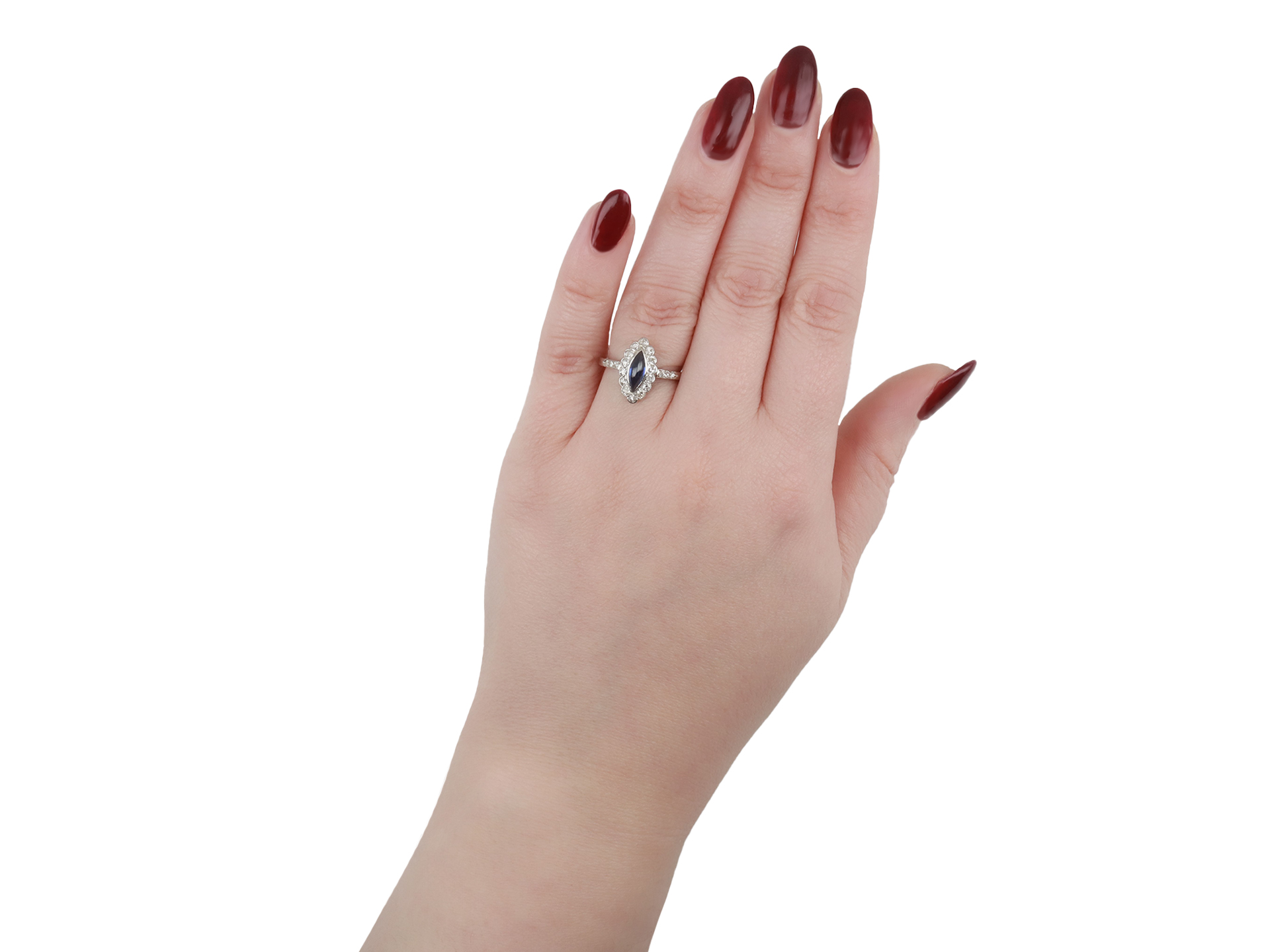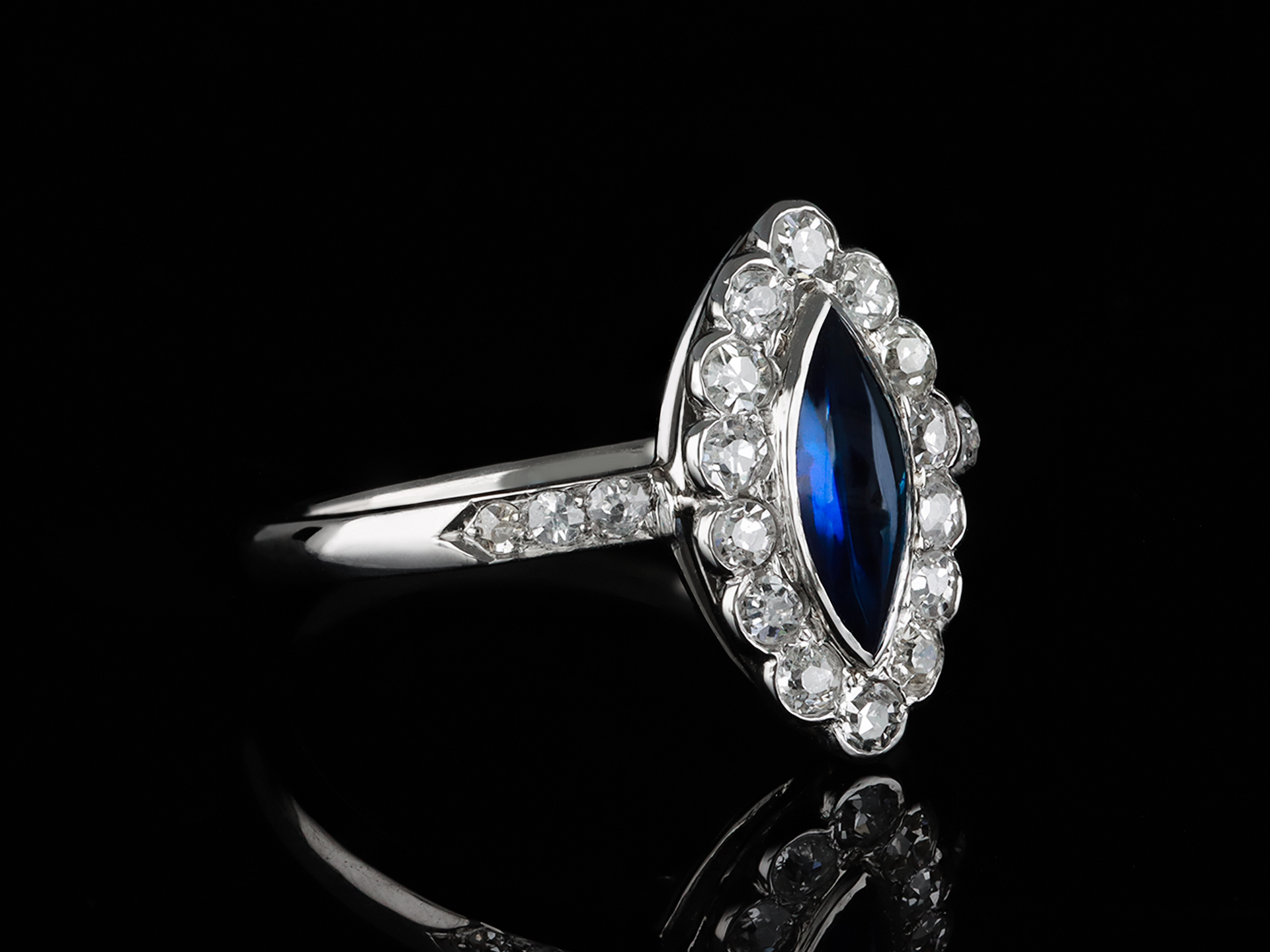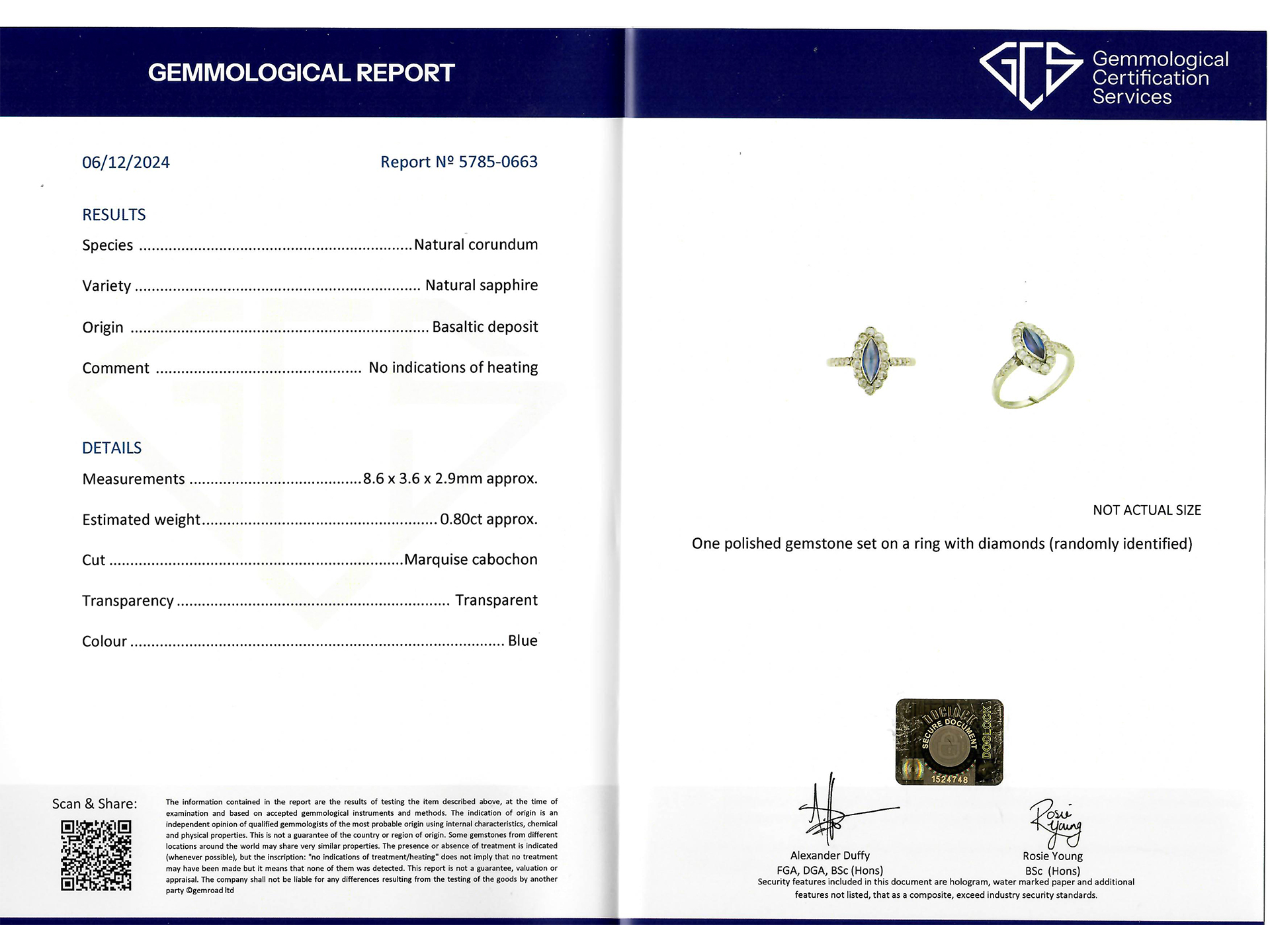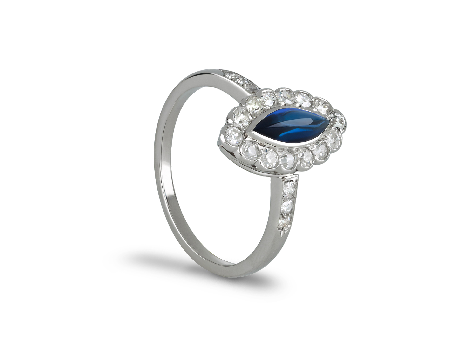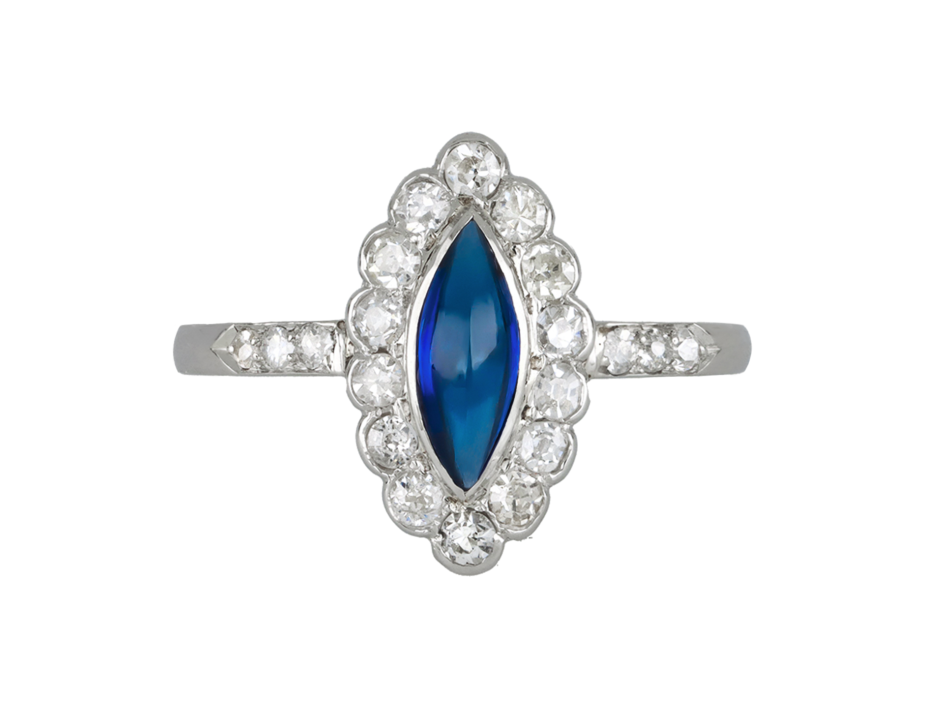 Sapphire and Diamond Cluster ring. Centrally set with a marquise shape cabochon cut natural unenhanced sapphire in an open back rubover setting with an approximate weight of 0.80 carats, surrounded by a single row of fourteen cushion shape old mine diamonds in open back rubover and grain settings with an approximate combined weight of 0.42 carats and further set with six round eight cut diamonds in open back grain settings with a combined weight of 0.18 carats. The total approximate diamond weight is 0.60 carats, to an elegant marquise shape cluster design featuring scalloped borders, a decoratively pierced gallery and open backholing, leading to smooth shoulders which flow through to a solid D-shape shank. Tested platinum, circa 1905, accompanied by Gemmological Certification Services Report #5785-0663.