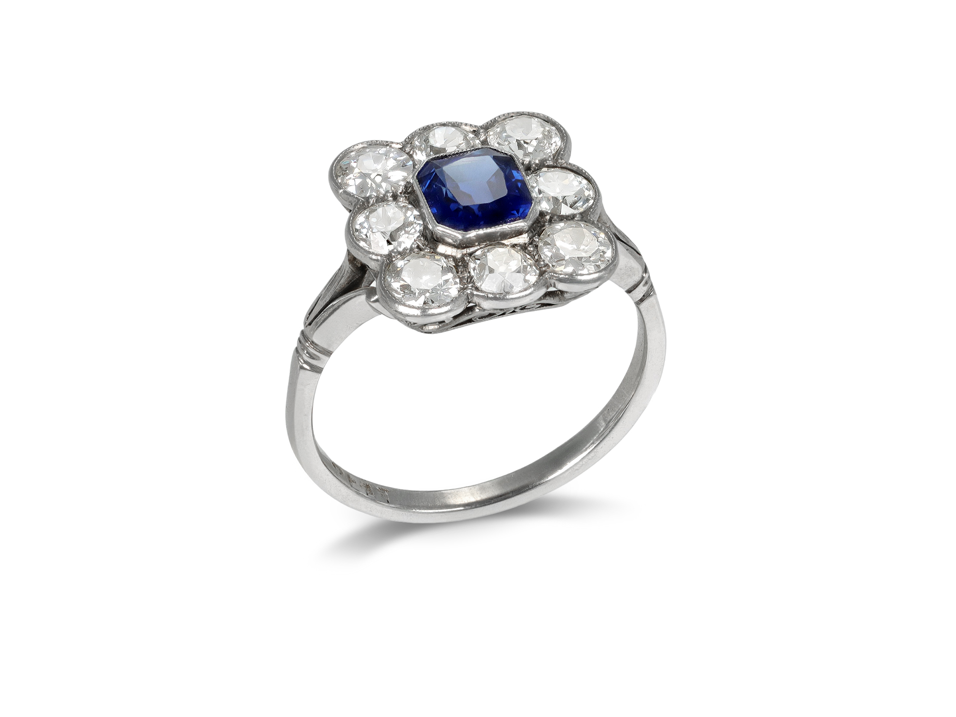 Sapphire and diamond coronet cluster ring. Set to centre with an octagonal mixed cut cut natural no heat sapphire in an open back rubover setting with an approximate weight of 0.90 carats, surrounded by eight round old cut diamonds in open back rubover and grain settings with an approximate combined weight of 1.40 carats, to a square coronet cluster design featuring scalloped millegrain edging, an ornately pierced gallery with scrolling details and fancy open backholing, flanked by elegant tri-split shoulders with grooved detailing flowing smoothly down to a solid D-shape shank. Marked platinum, circa 1920, accompanied by Gemmological Certification Services report #5784-0458.