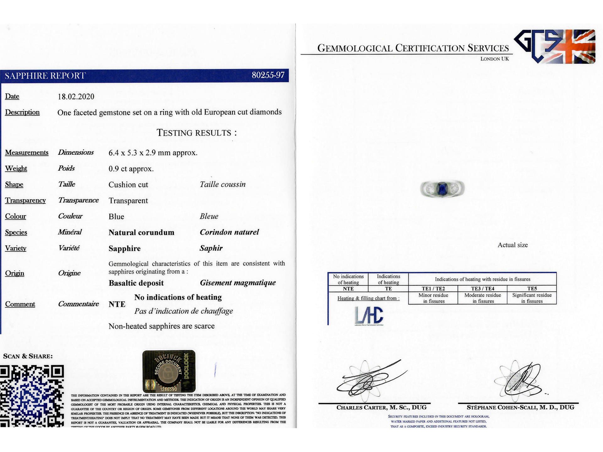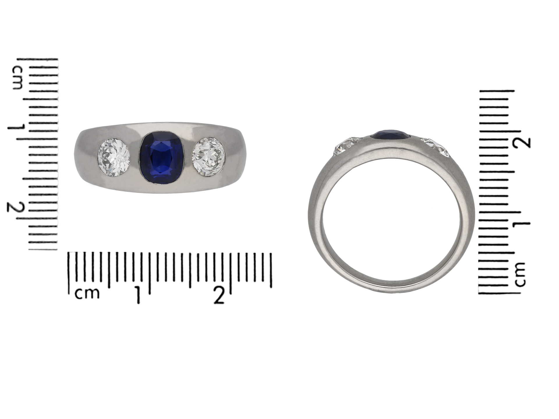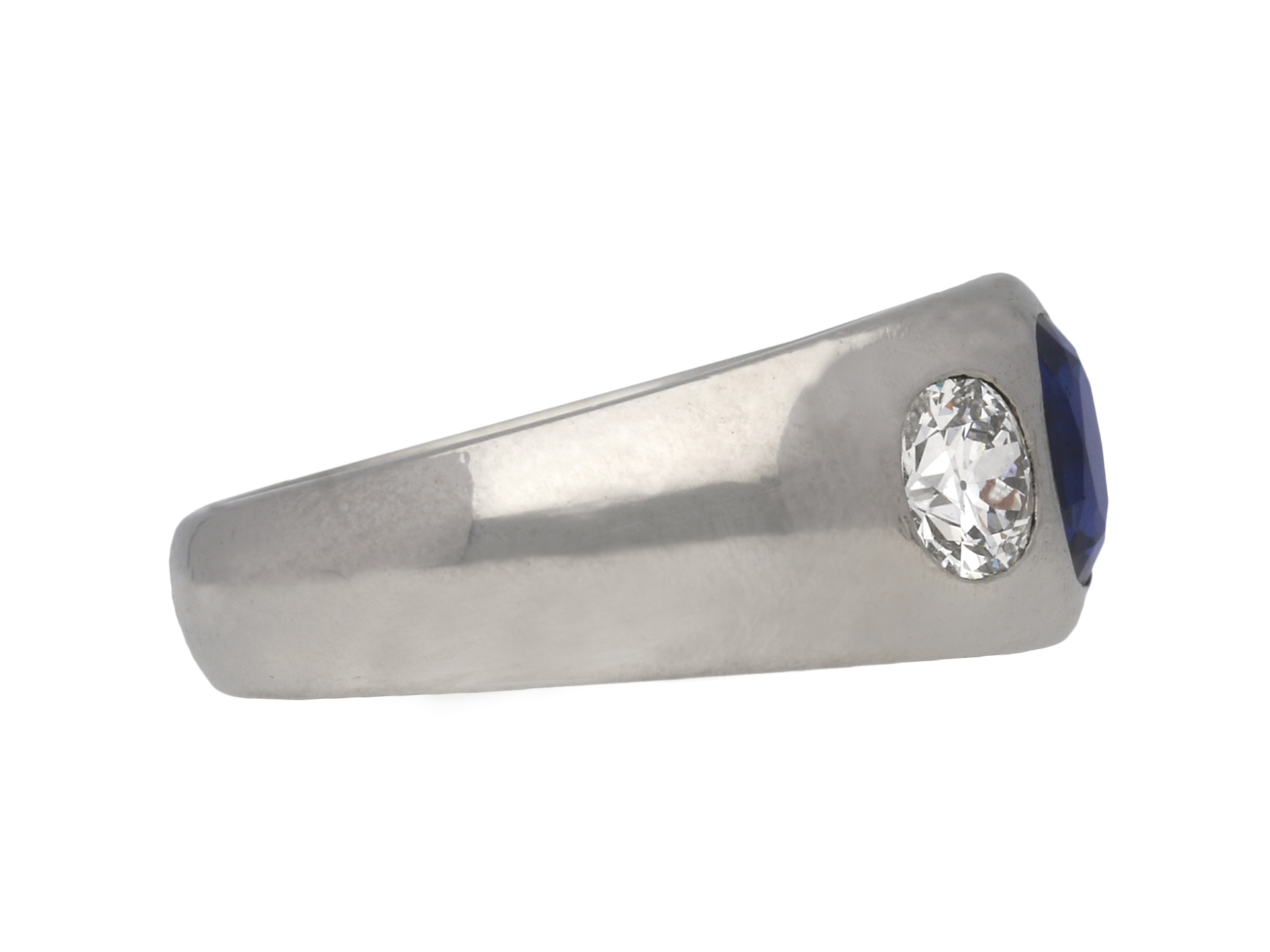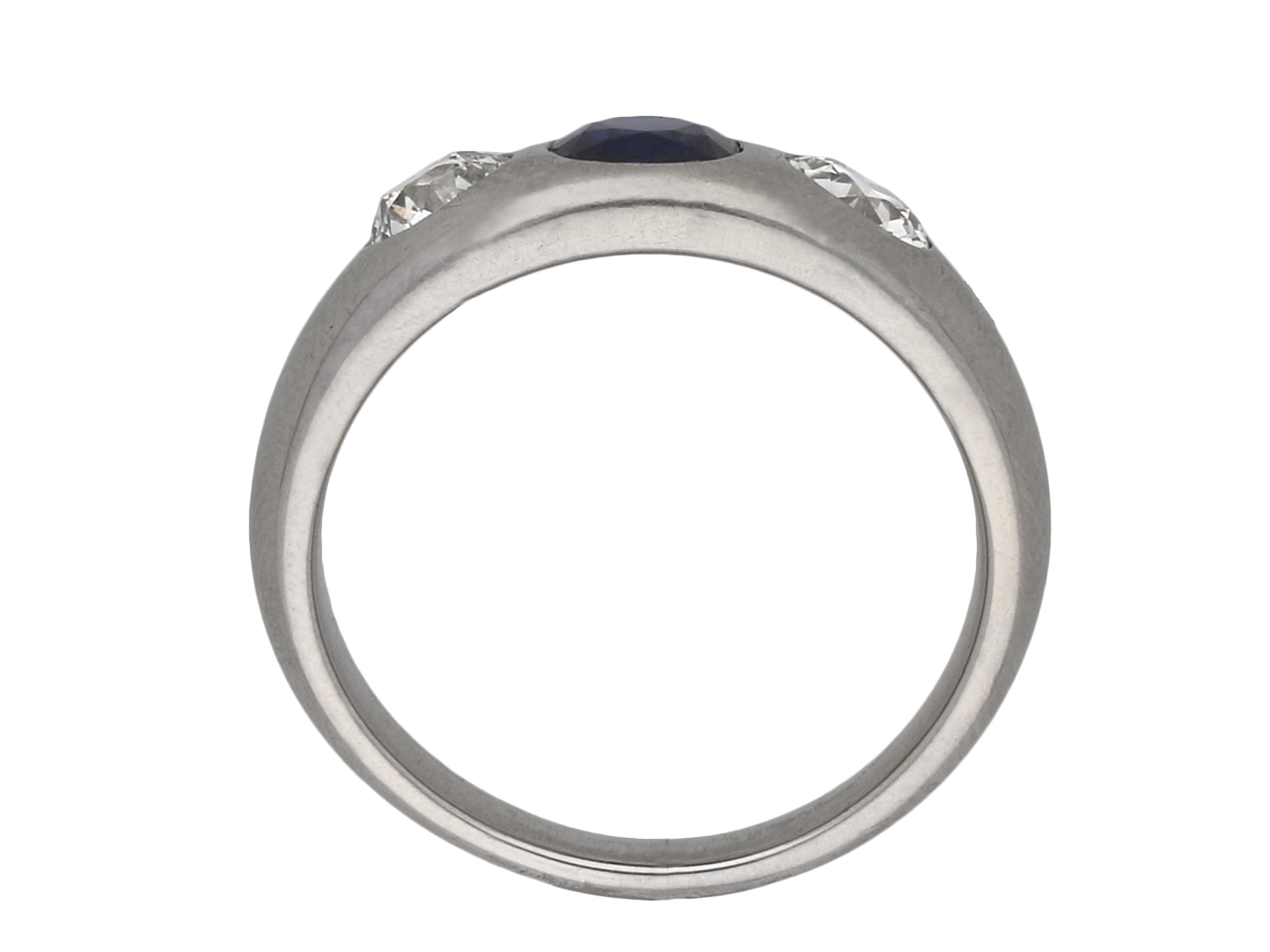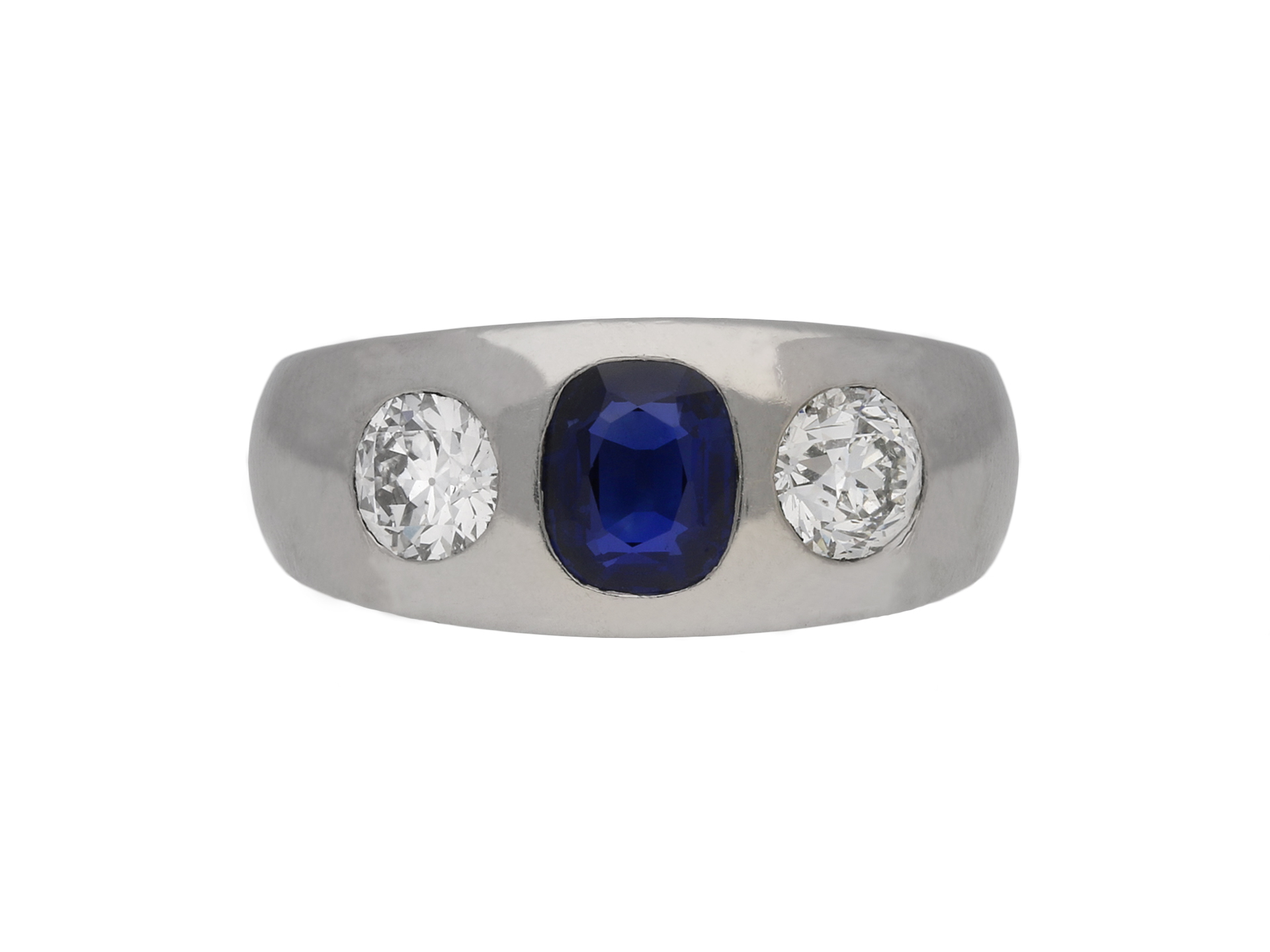 Sapphire and diamond gypsy ring. Set to centre with a cushion shape old cut natural no heat sapphire in an open back rubover setting with an approximate weight of 0.90 carats, further set with two round old cut diamonds in open back rubover settings with a combined approximate weight of 0.80 carats, to a conforming three stone design featuring polished edges and round open backholing, flanked by trumpeting smooth integrated shoulders flowing down to a solid tapering D-shape shank. Tested platinum, circa 1920, accompanied by Gemmological Certification Services report #80255-97.