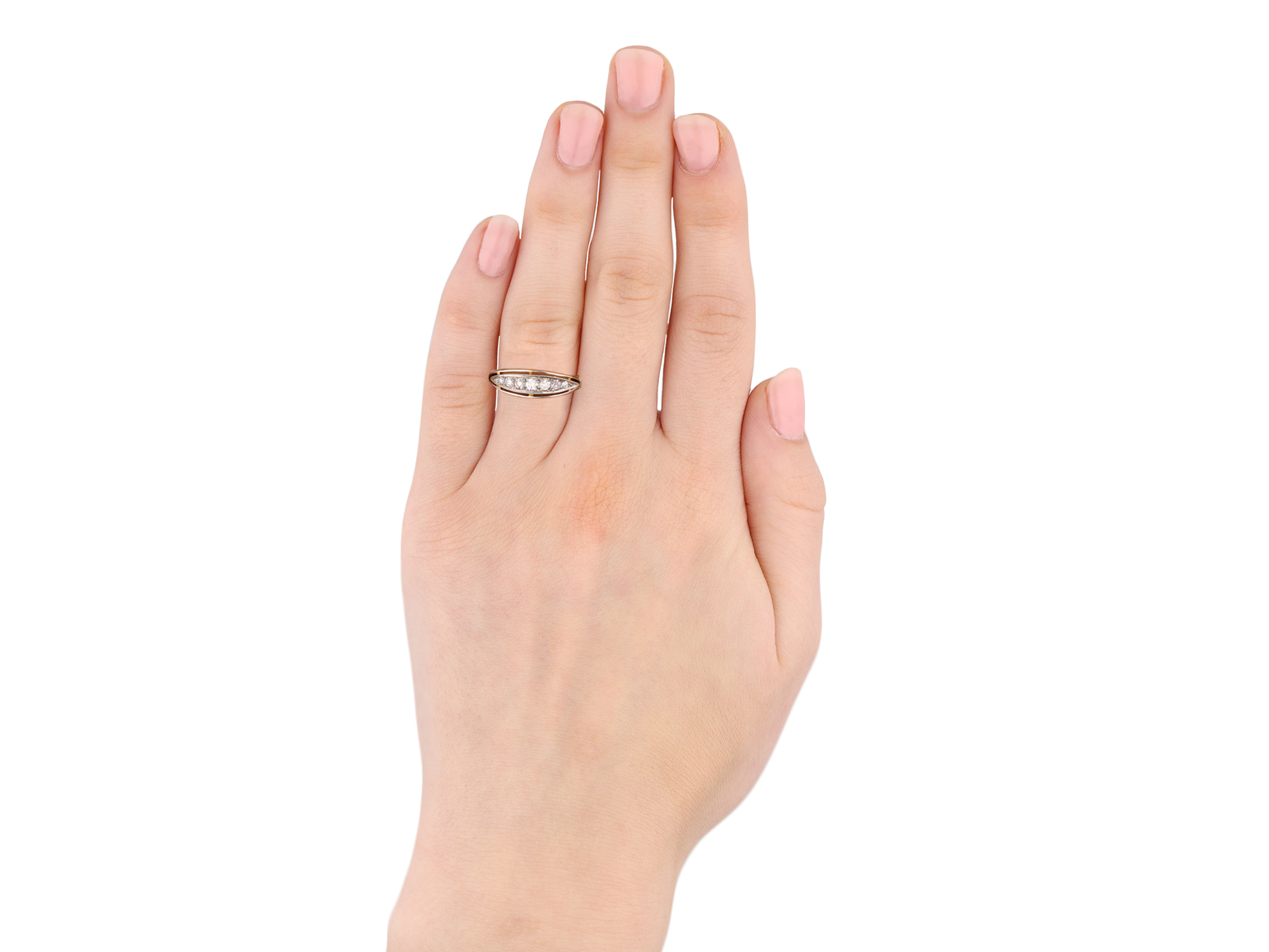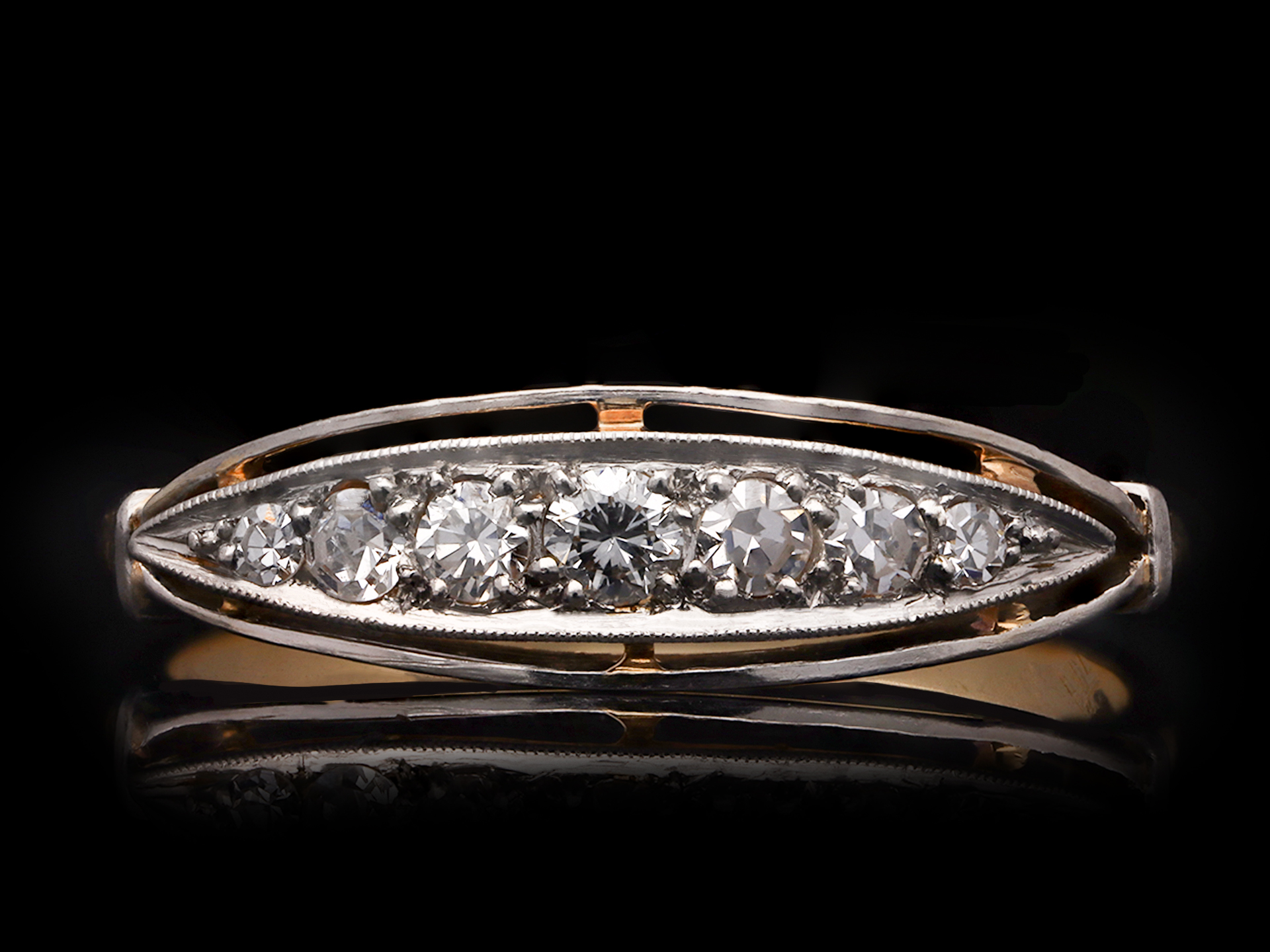 Seven stone diamond ring. Horizontally set with seven graduating round old cut diamonds in open back grain settings, with an approximate total weight of 0.20 carats, to an elegant seven stone design featuring millegrain edging, a solid gallery, and linear open backholing, flanked by slightly raised shoulders, through to a solid D-shape shank. Marked 18 carat yellow gold, tested platinum setting, makers mark 'JB', French, circa 1915.