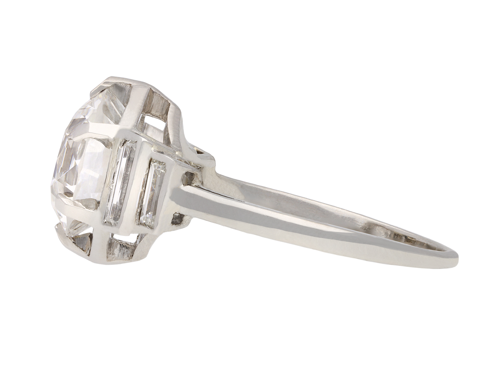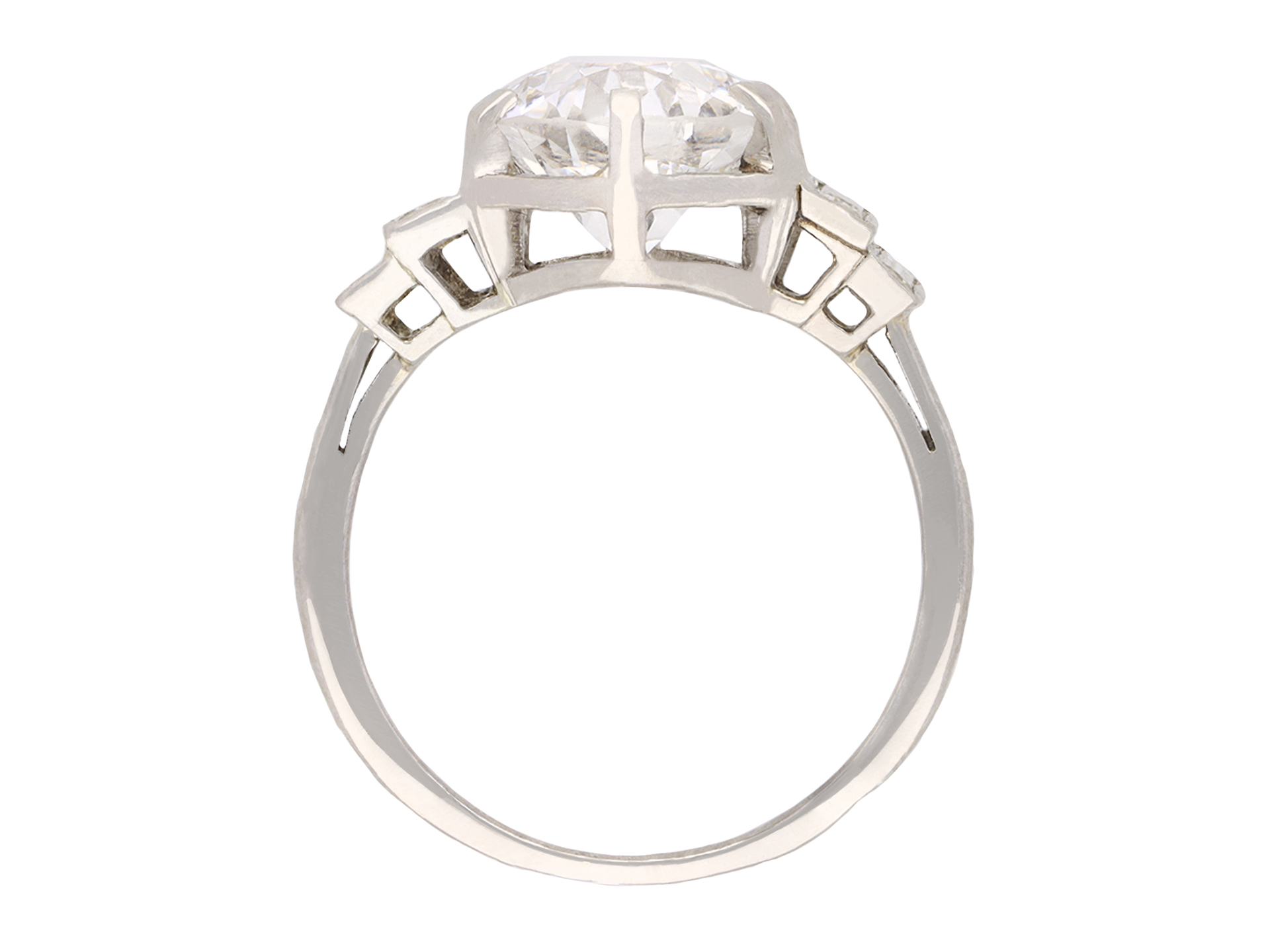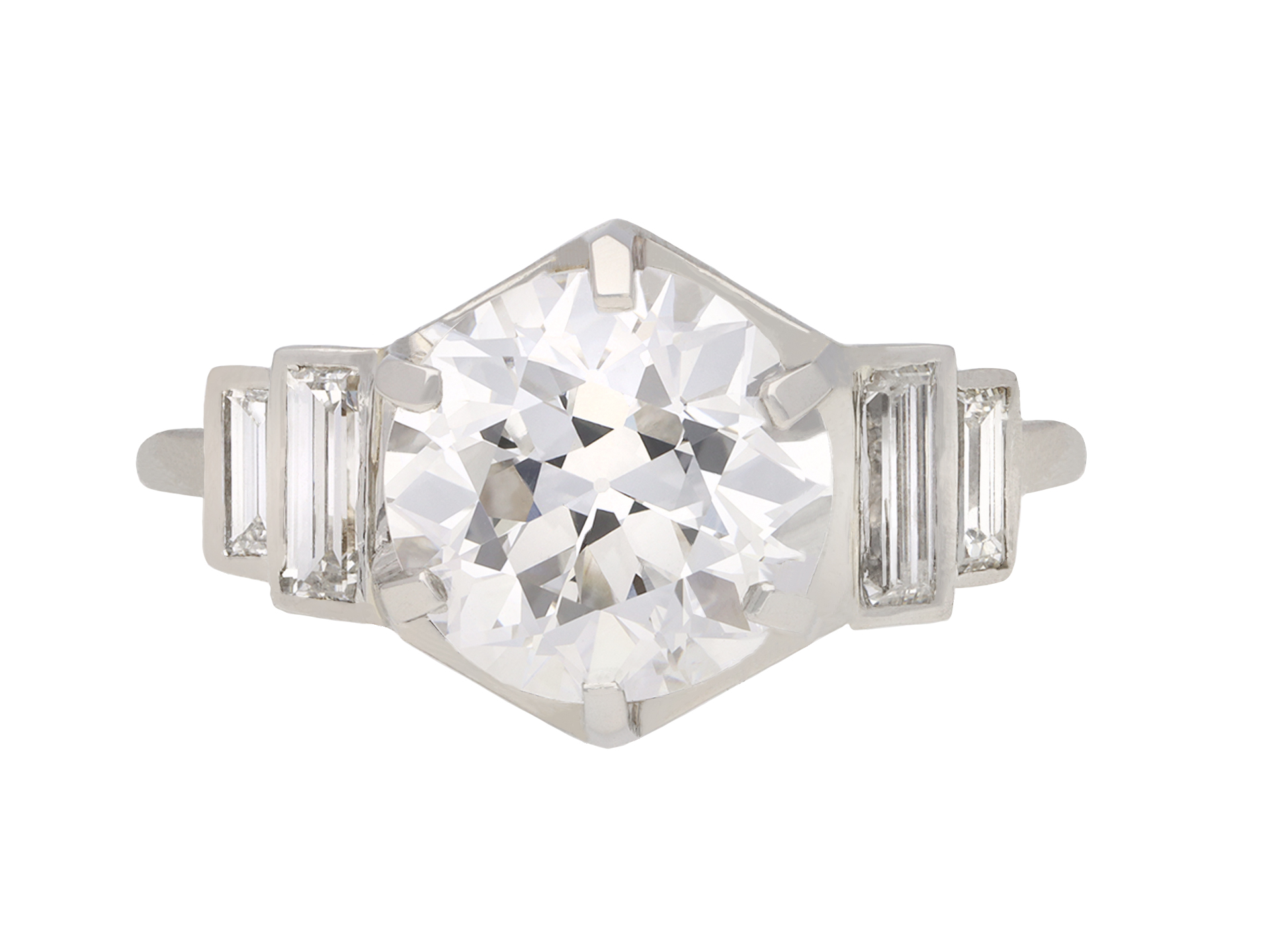 Solitaire diamond engagement ring with diamond set shoulders. Centrally set with a round old cut diamond, E colour, VS2 clarity, with a weight of 3.02 carats in an open back claw setting, flanked by four rectangular baguette cut diamonds in open back rubover settings with a combined weight of 0.60 carats. The total approximate diamond weight is 3.62 carats, to an elegant stepped form with a hexagonal geometric openwork gallery and intricate backholing, flowing down to a tapering solid D-shape shank. Marked 18 carat white gold, French, circa 1930, accompanied by Gemological Institute of America (GIA) report #2225797984 and HRD Antwerp report #14007100001.
