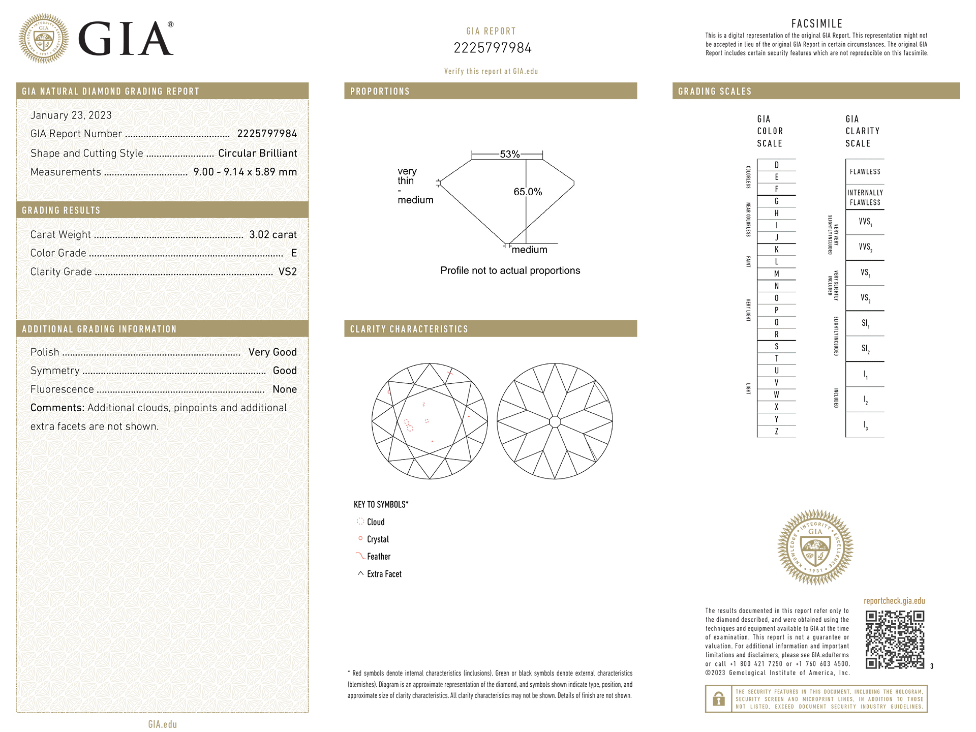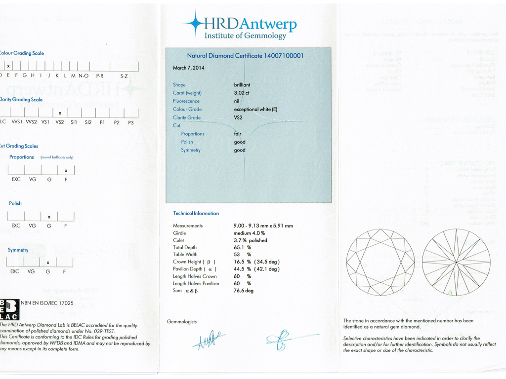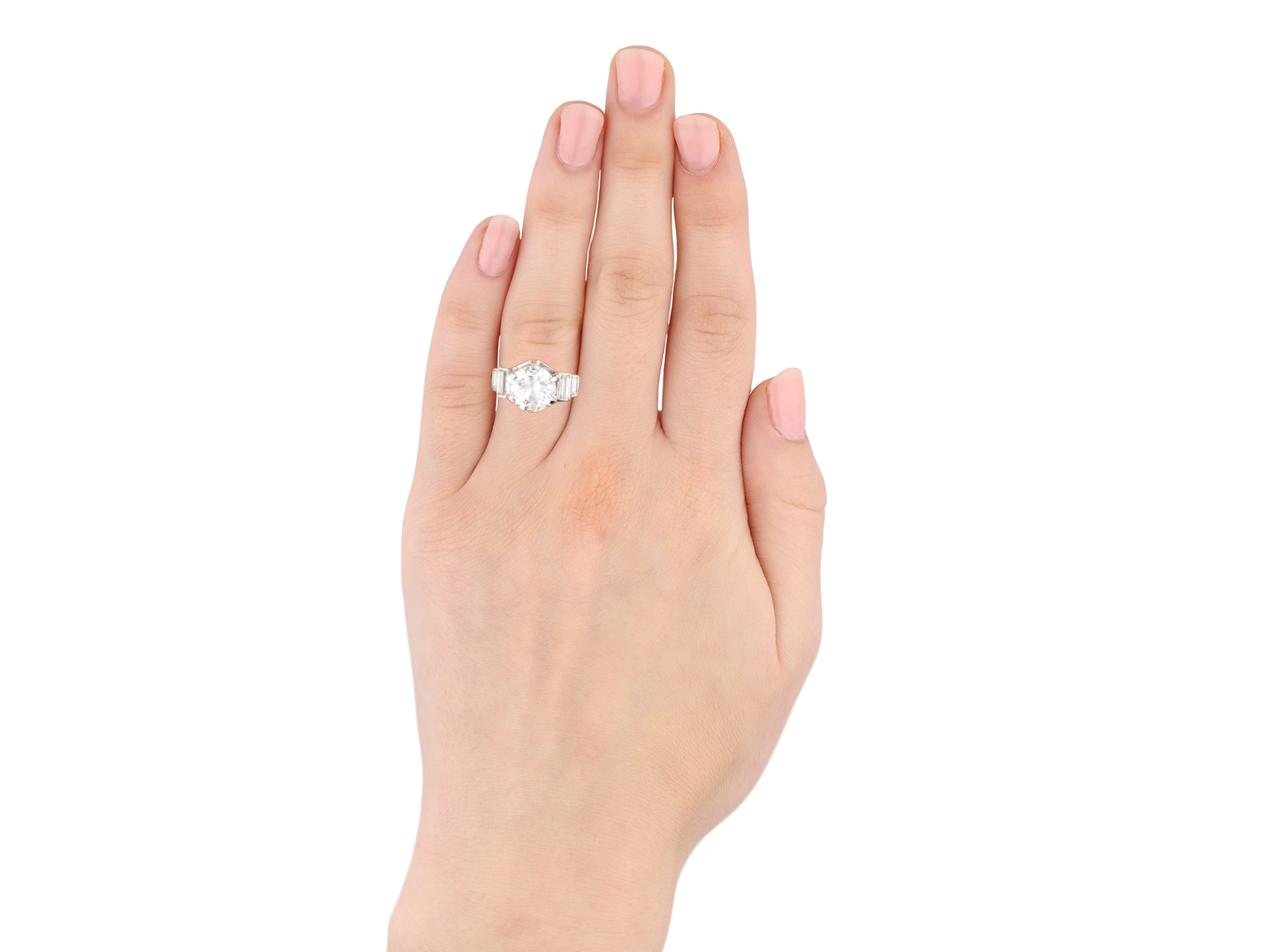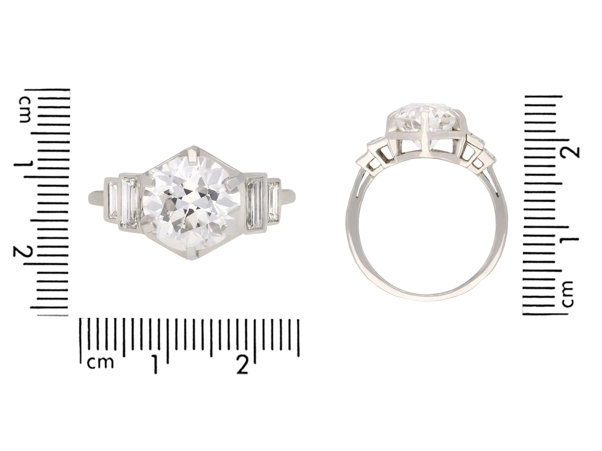 Solitaire diamond engagement ring with diamond set shoulders. Centrally set with a round old cut diamond, E colour, VS2 clarity, with a weight of 3.02 carats in an open back claw setting, flanked by four rectangular baguette cut diamonds in open back rubover settings with a combined weight of 0.60 carats. The total approximate diamond weight is 3.62 carats, to an elegant stepped form with a hexagonal geometric openwork gallery and intricate backholing, flowing down to a tapering solid D-shape shank. Marked 18 carat white gold, French, circa 1930, accompanied by Gemological Institute of America (GIA) report #2225797984 and HRD Antwerp report #14007100001.