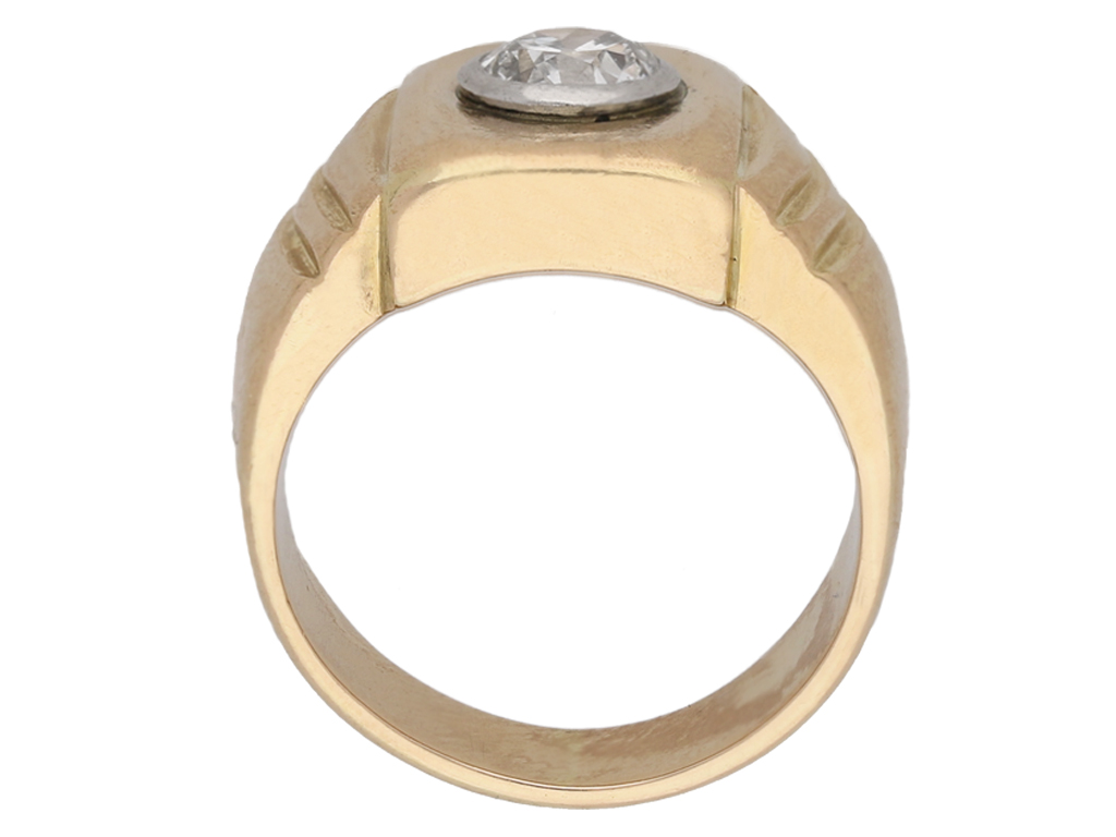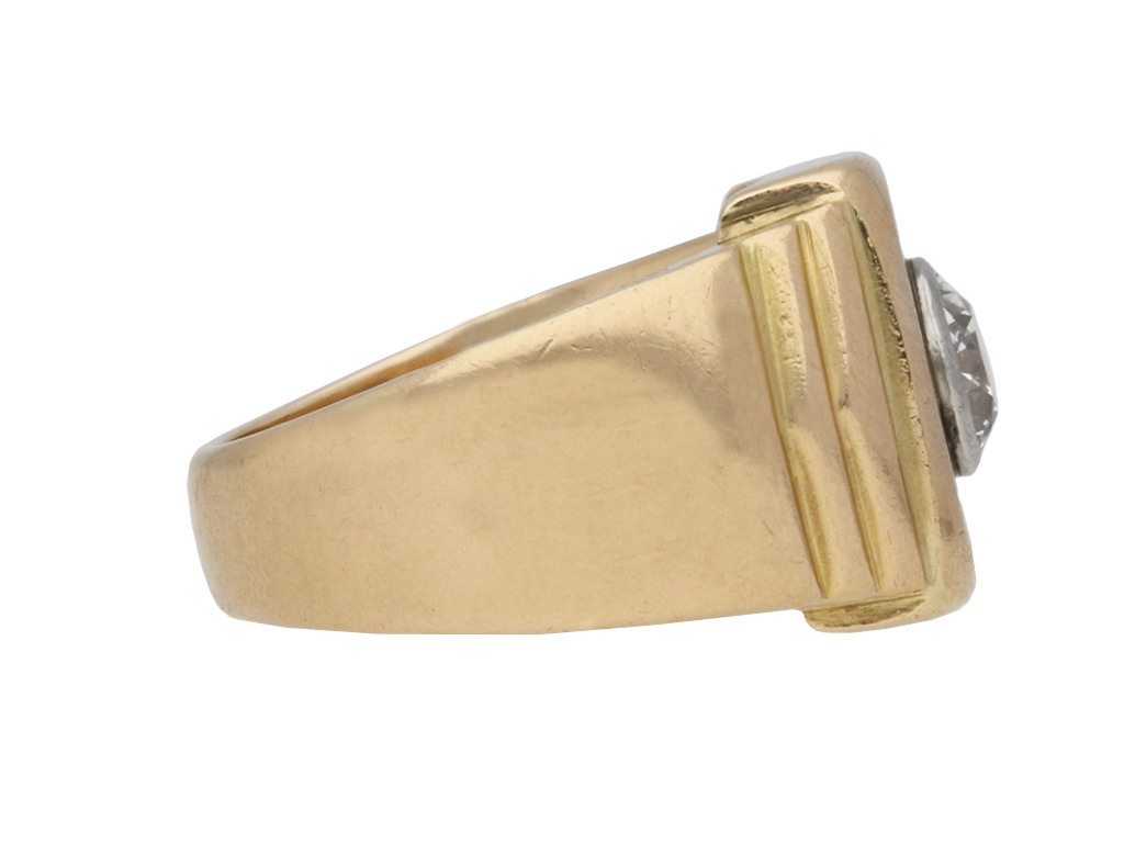 Solitaire diamond ring. Set with a central round old cut diamond in an open back rubover setting, with an approximate weight of 1.00 carats, to a striking rectangular bezel with polished edges and round backholing, flowing through to stepped trumpeting shoulders leading to a solid flat shank. Tested yellow gold and platinum, circa 1940.