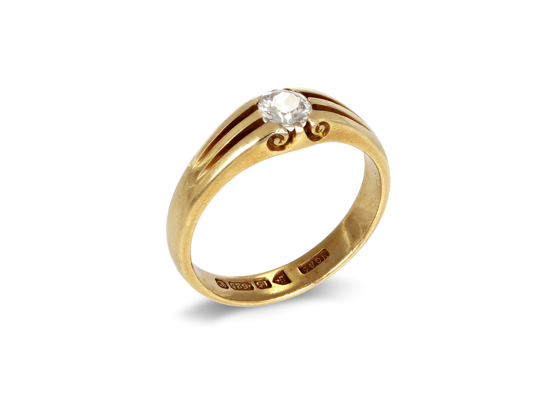 Diamond solitaire ring by Henry Griffith & Sons. Set to centre with a round old cut diamond in an open back claw setting with an approximate weight of 0.50 carats, to a solitaire design featuring integrated claws, elegant scrollwork detail to the gallery and open backholing, the linear tri-split shoulders leading down to a solid D-shape heavy shank. Marked 15 carat yellow gold, maker's mark for Henry Griffith & Sons, full hallmarks for Chester, English, 1914.