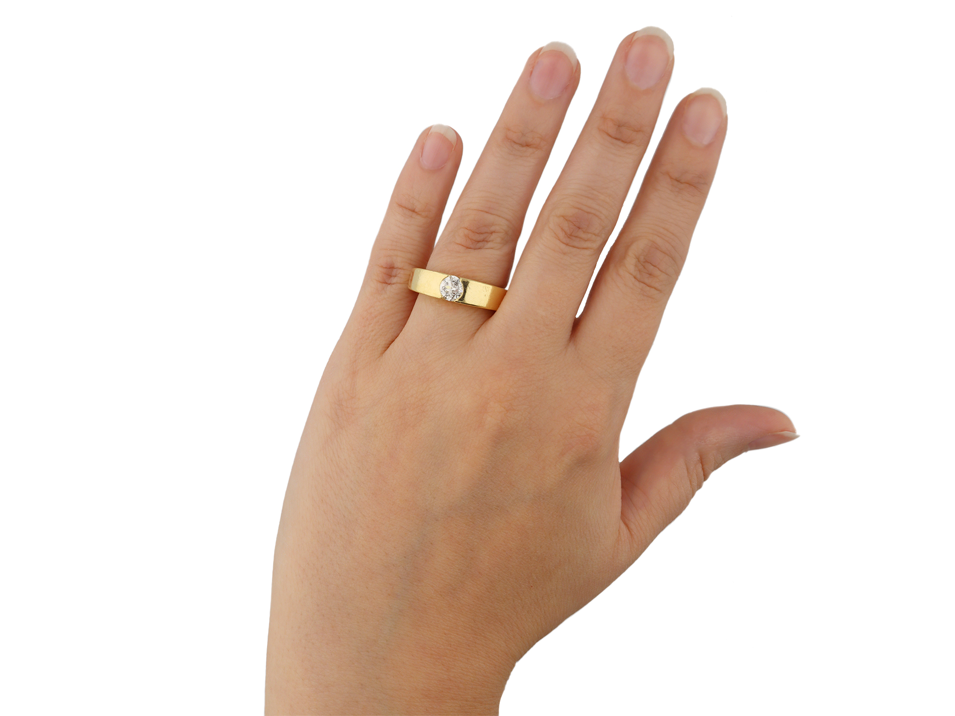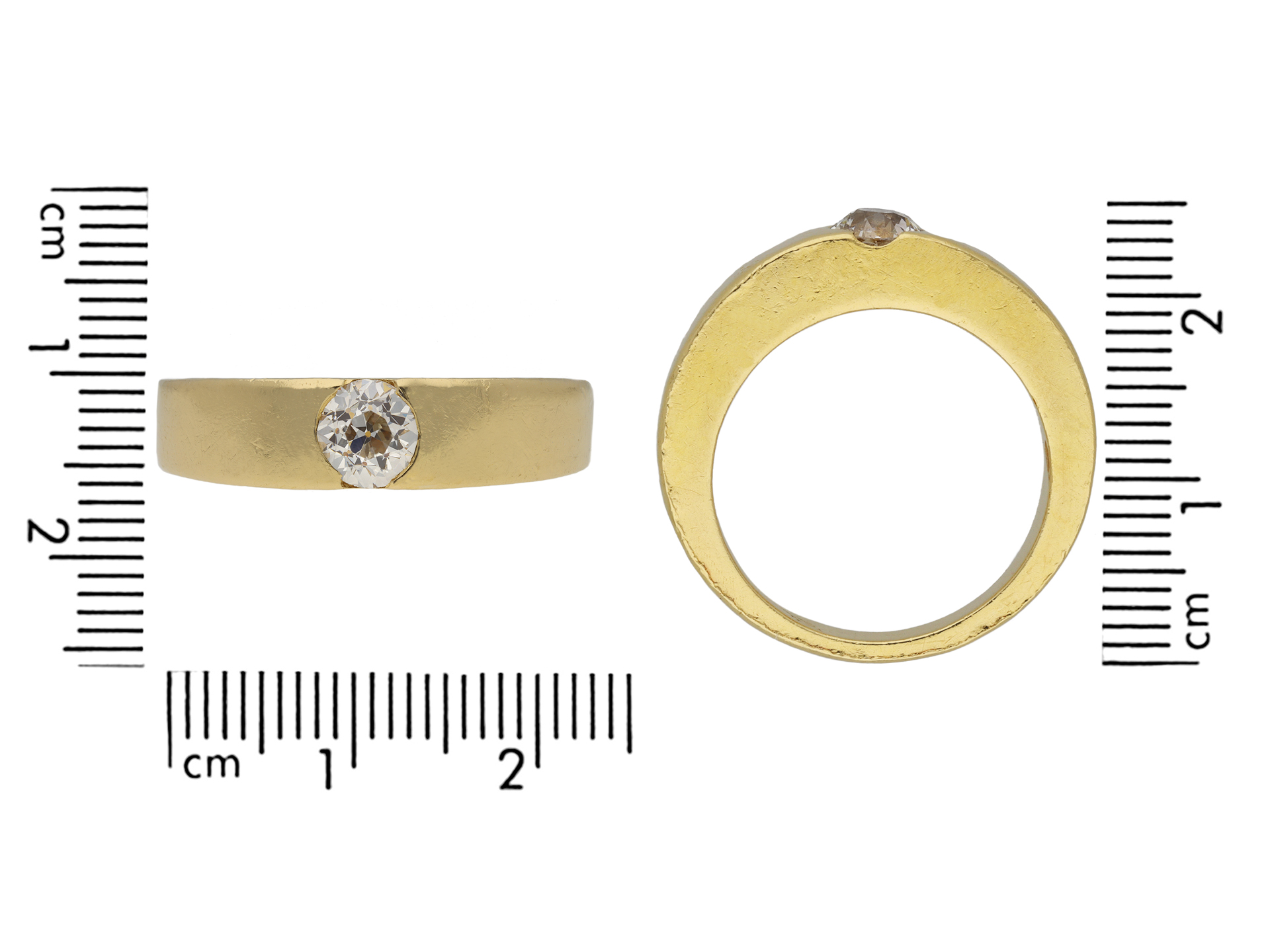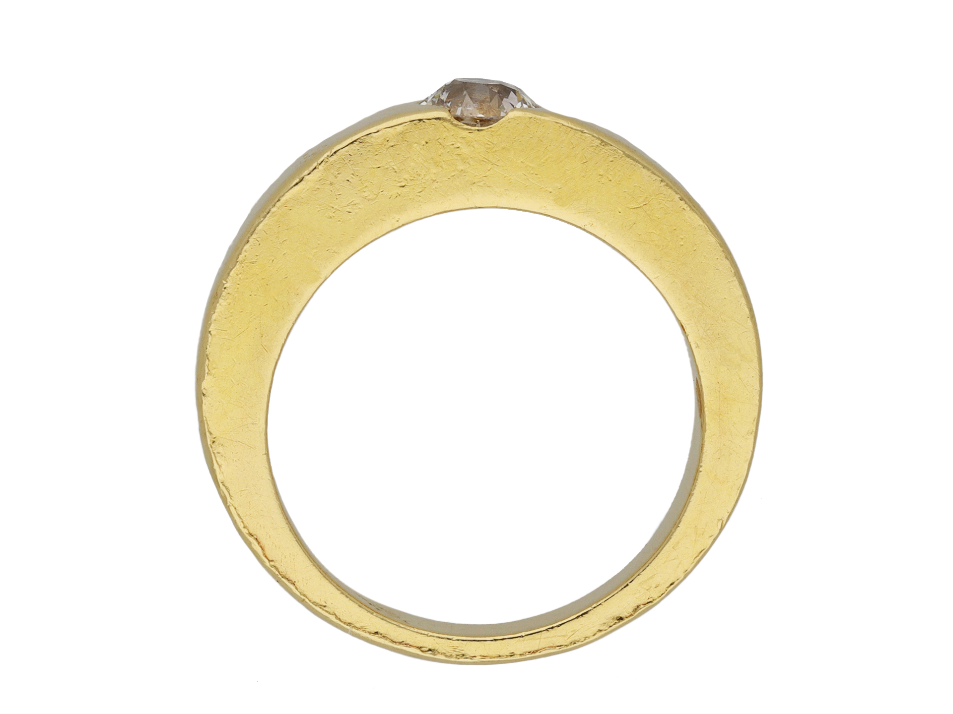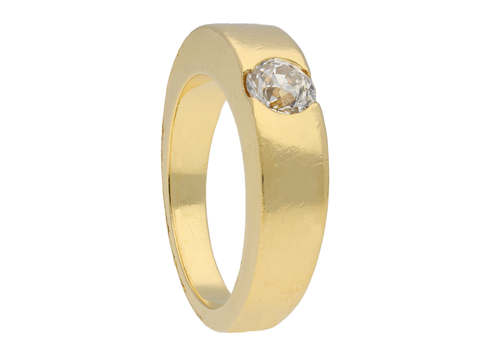 Solitaire old cut diamond ring. Set to centre with a round old cut diamond in an open back rubover setting, with an approximate weight of 0.75 carats, to a solitaire gypsy design featuring polished edges and circular open backholing, the heavy integrated shoulders tapering to a solid square shank. Marked 18 carat yellow gold, indistinct maker's mark, French, circa 1950.