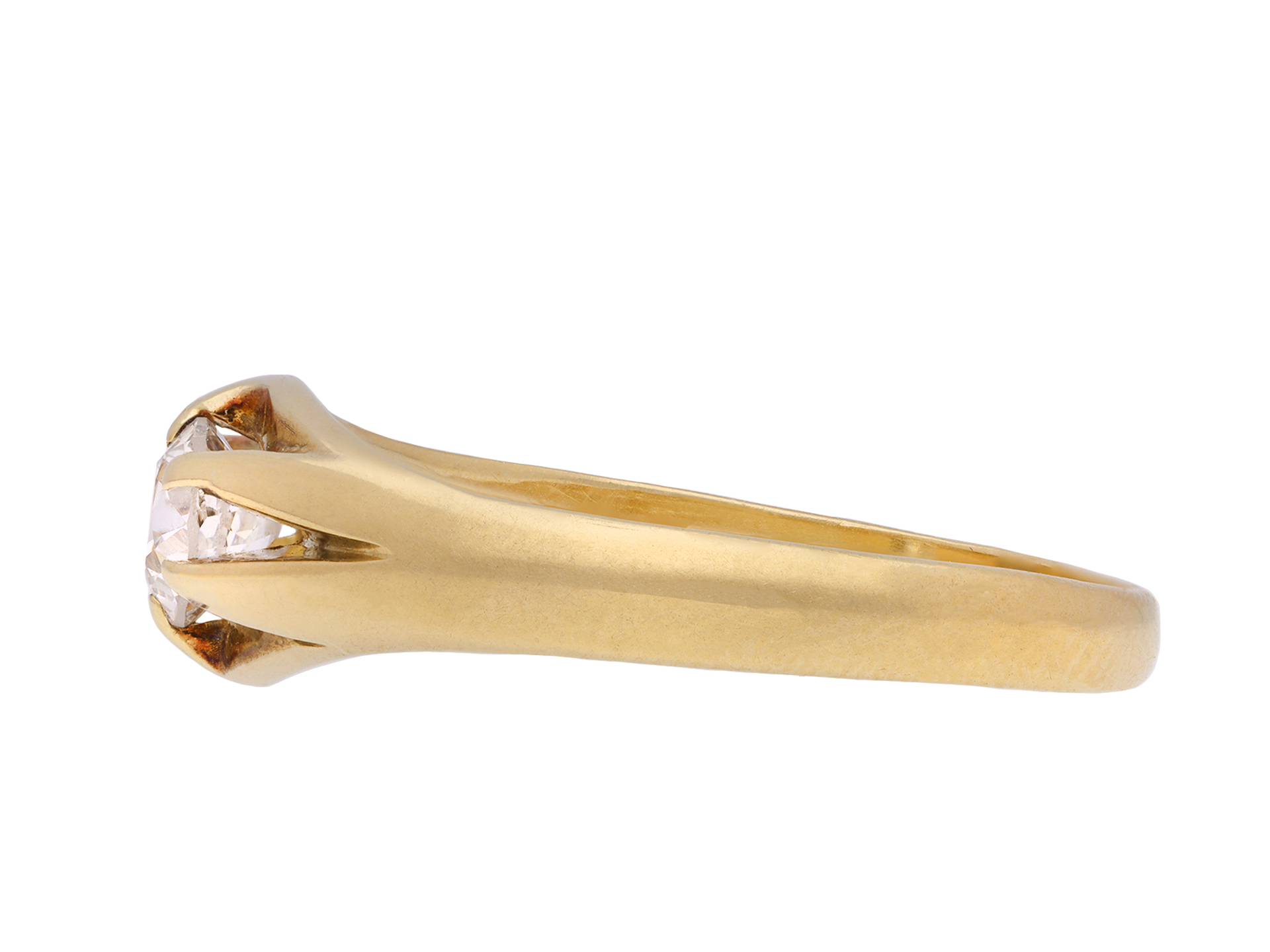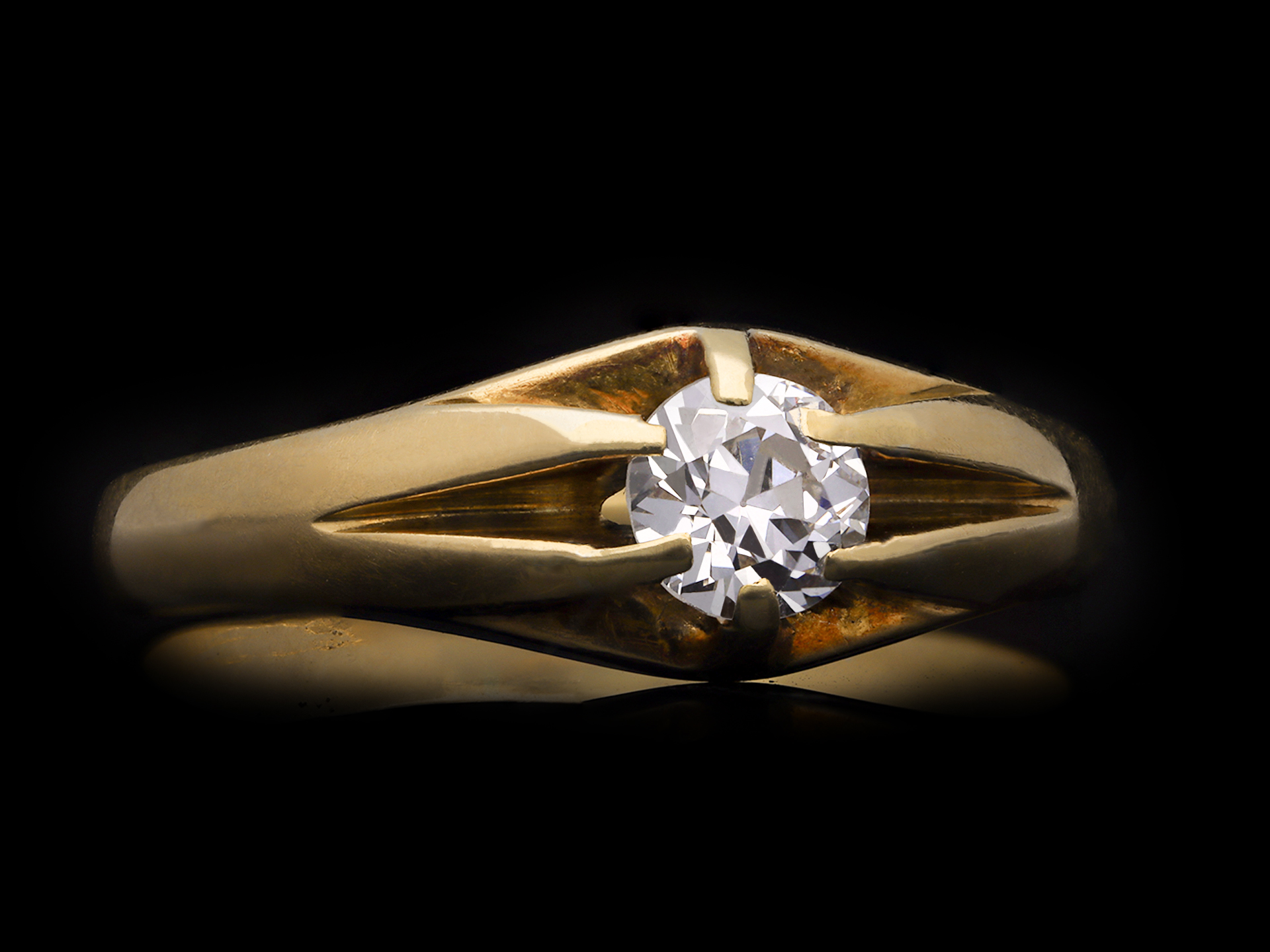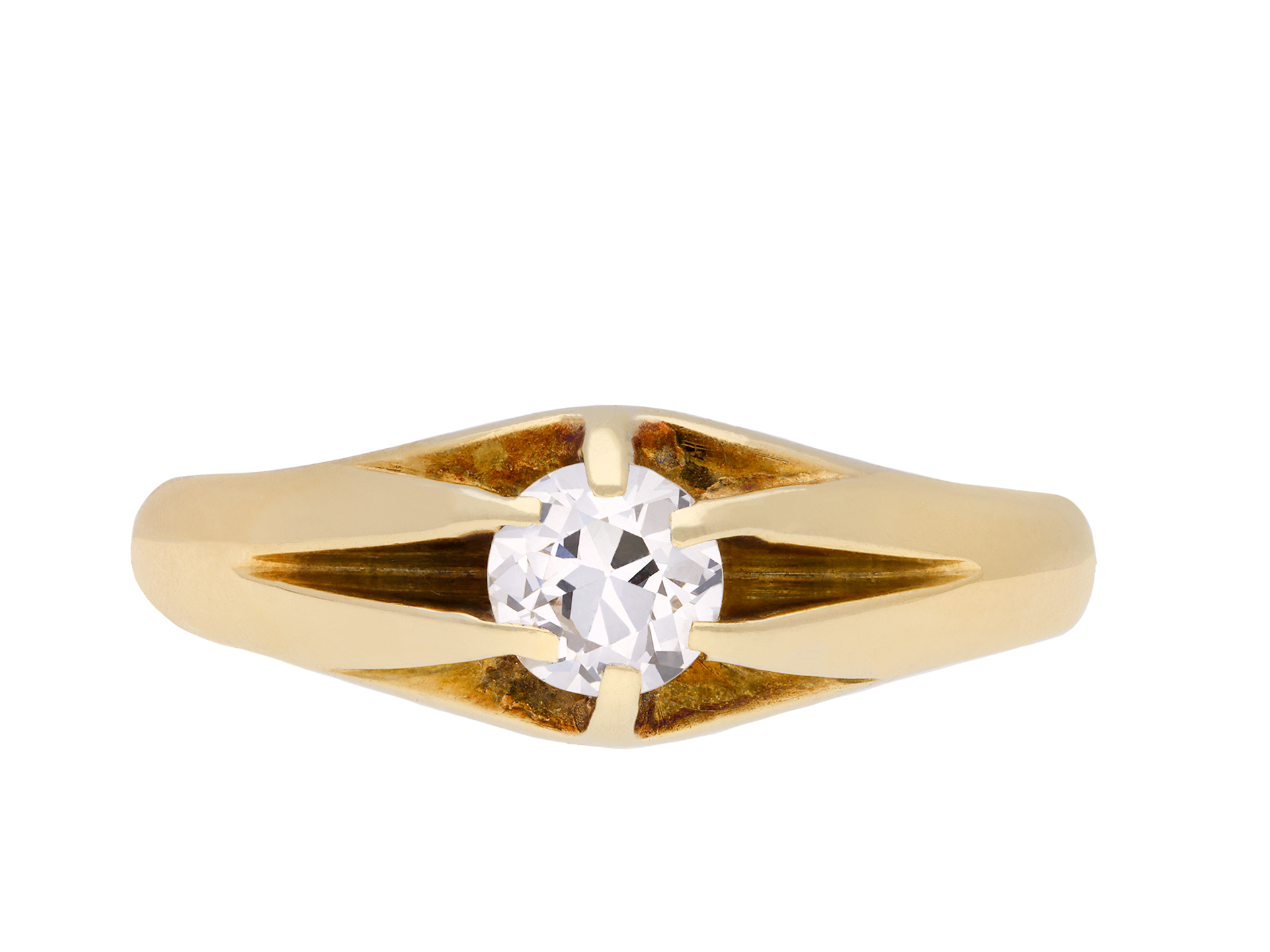 Solitaire old cut diamond ring. Set to centre with a round old cut diamond in an open back claw setting with an approximate weight of 0.60 carats, to a solitaire design featuring integrated curving claws, open gallery and circular open backholing, flanked by broad integrating shoulders, flowing to a solid D-shape shank. Marked 18 carat yellow gold, circa 1905.
