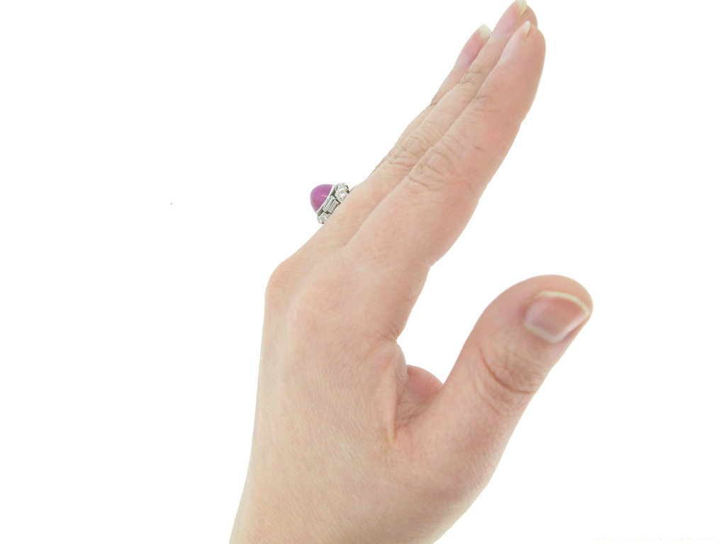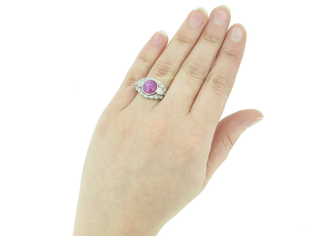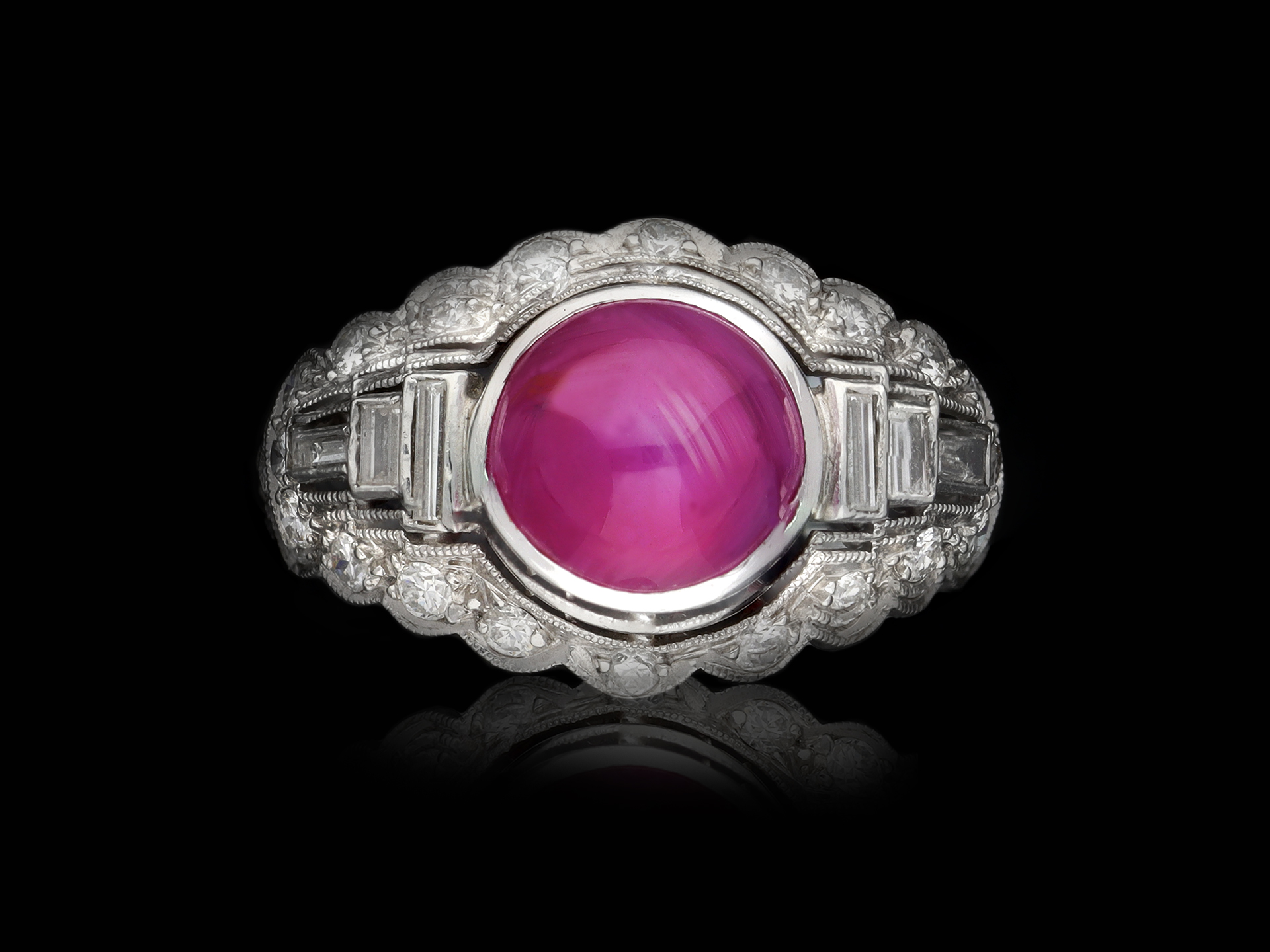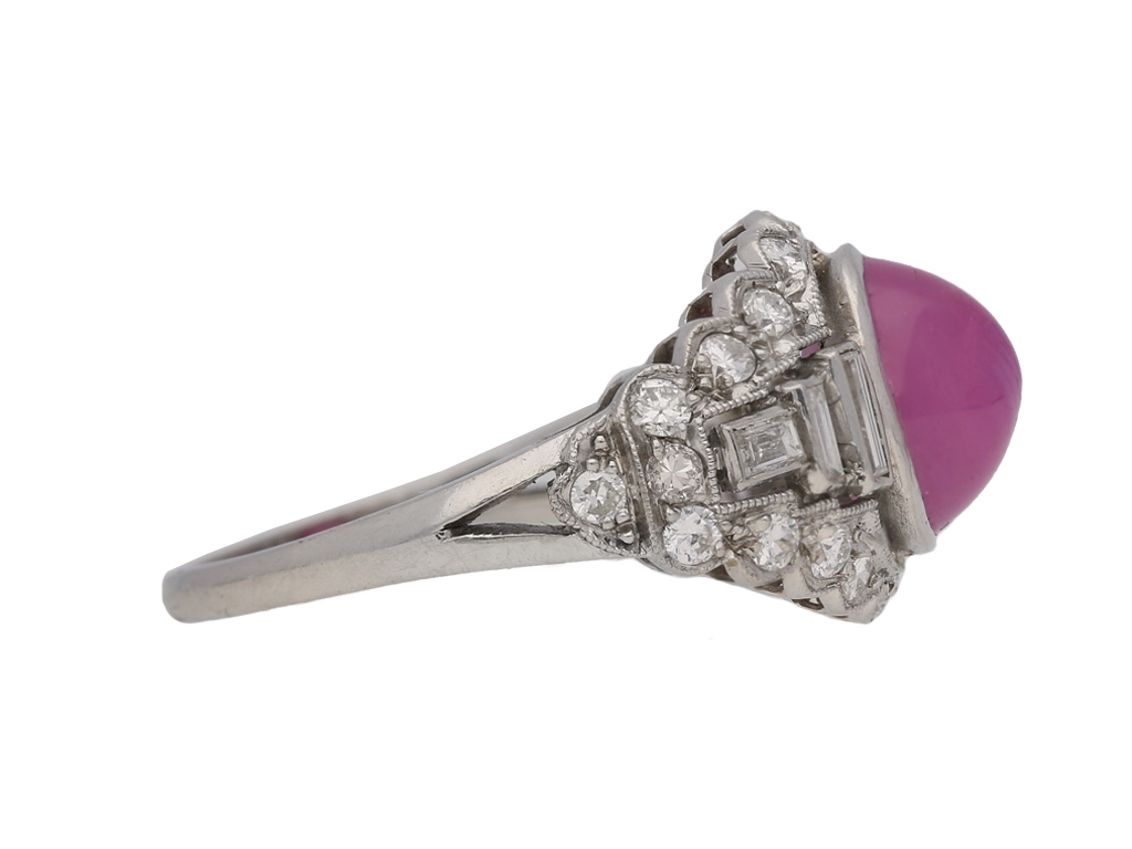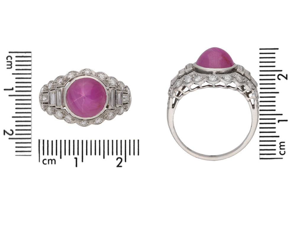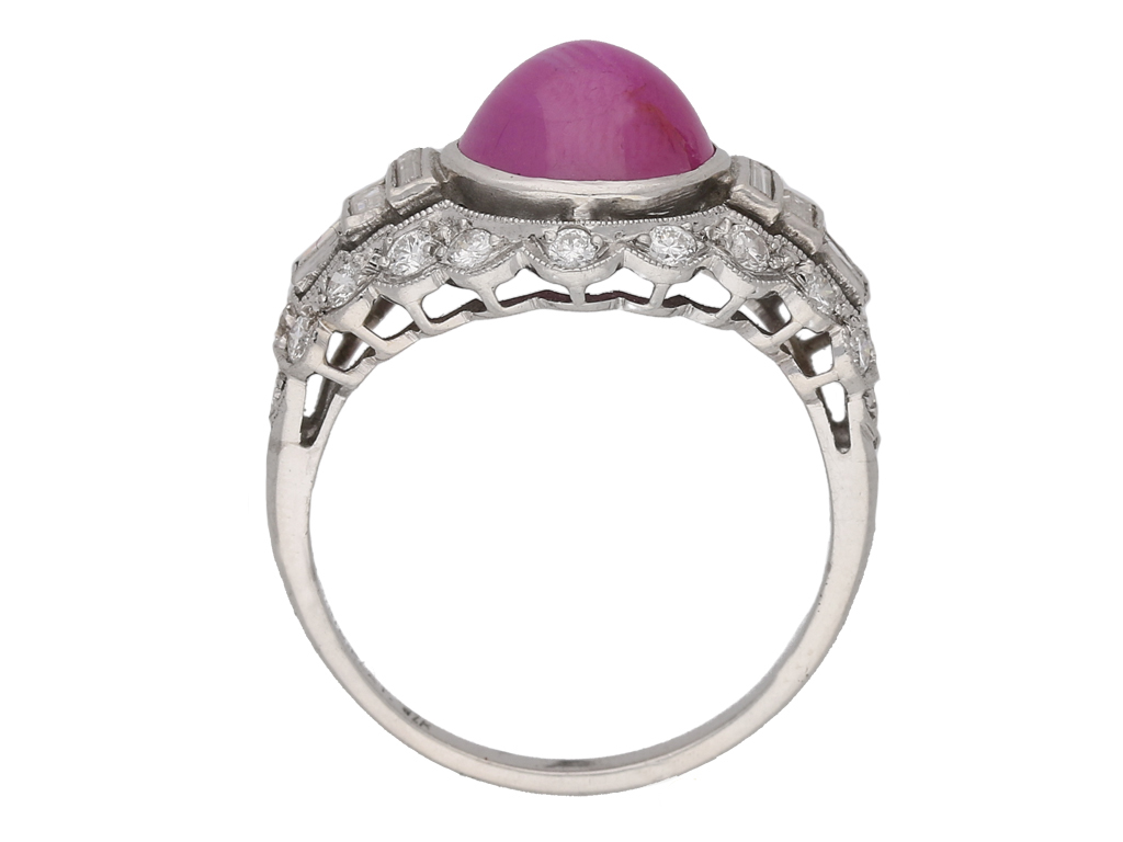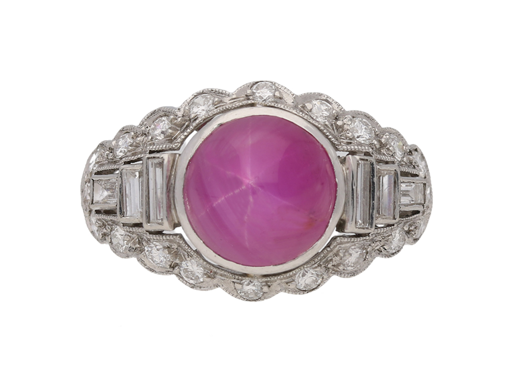 Star ruby and diamond ring. Set with one round cabochon natural unenhanced star ruby in an open back rubover setting with an approximate weight of 6.00 carats, flanked by six rectangular baguette cut diamonds in open back rubover settings with a total weight of 0.30 carats, all in a pierced surround and encircled by twenty four round old cut diamonds in open back grain settings with a total weight of 0.70 carats. The combined approximate diamond weight is 1.00 carats, to a horizontal cluster with millegrain details and scalloped silhouette, all above a pierced geometric gallery with open backholing and finished with split shoulders and a D-shape shank. Marked platinum and iridium, maker's mark 'SZK', American, circa 1950.
